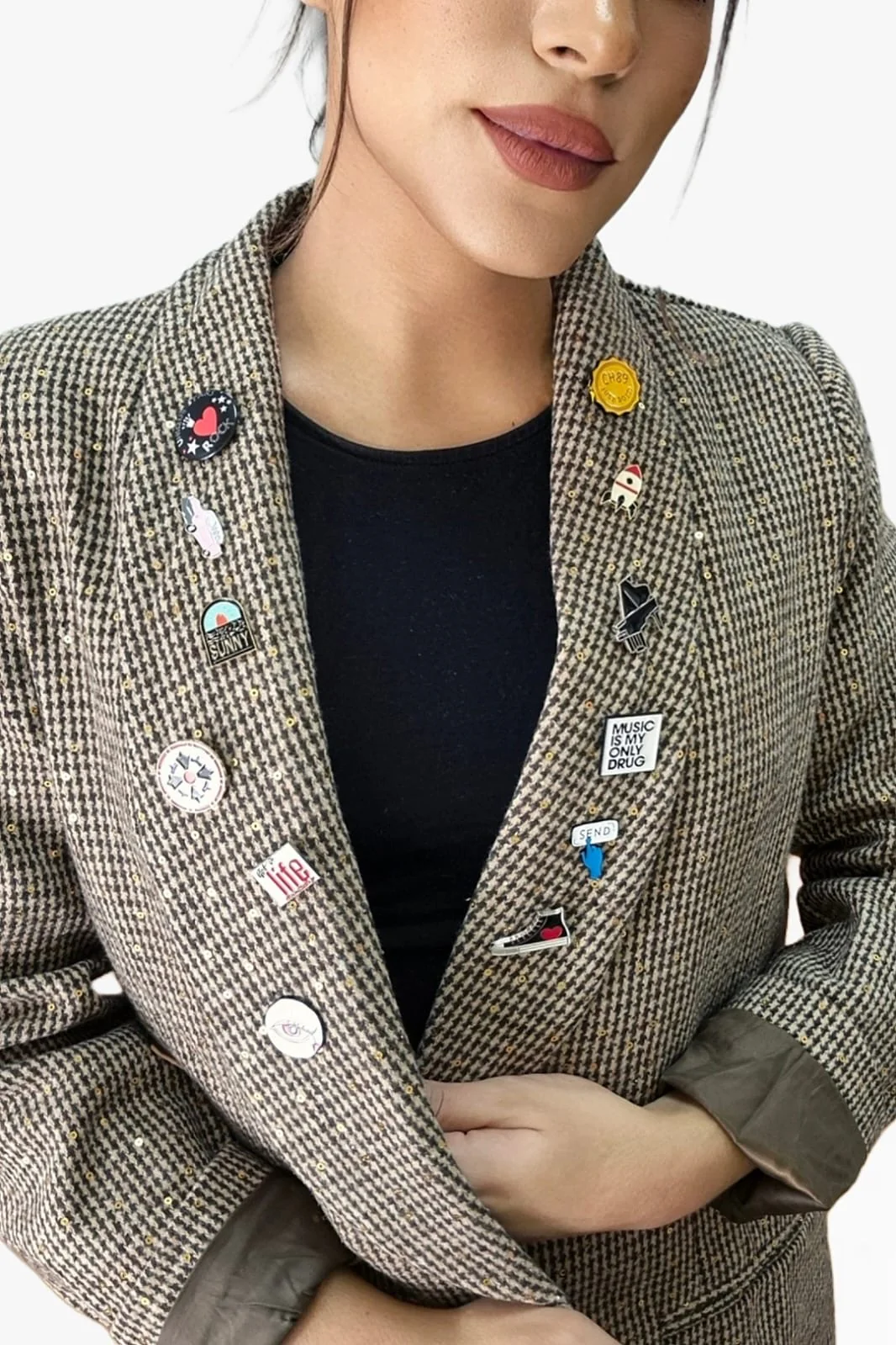 Una blazer que eleva cualquier look gracias a su tejido con acabado brillante y al detalle de los pines decorativos, que la convierten en una prenda única y llena de personalidad. Su corte entallado estiliza la figura, aportando un aire sofisticado y actual al mismo tiempo.