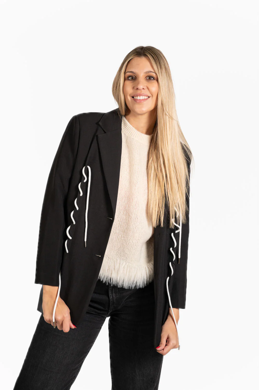 Blazer con solapa de muesca, bolsillos y detalles en cordón.