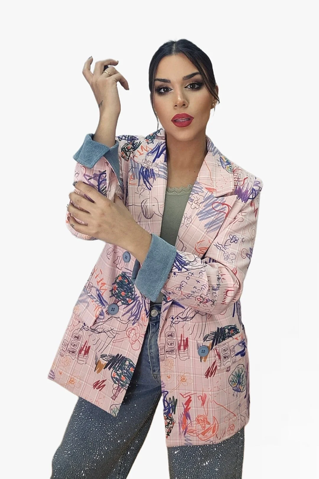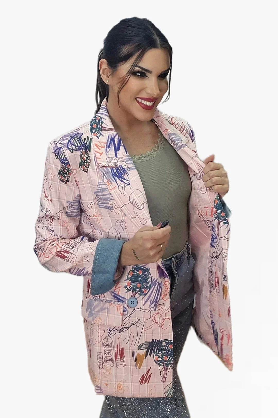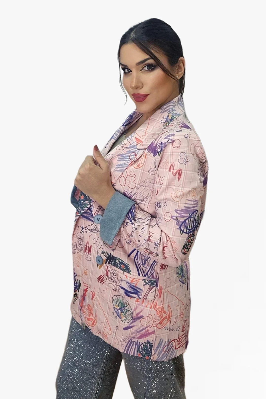 Dale un giro divertido y original a tu look con nuestra blazer cuadros garabatos. Su estampado único recuerda a una pizarra llena de garabatos hechos con tizas de colores, lo que la convierte en una prenda creativa y con mucha personalidad. De corte oversize y entallada en el cuerpo, combina estilo desenfadado con estructura elegante. Presenta solapas grandes, cierre cruzado con botones y vuelta de manga tipo vaquera que aporta un toque casual.