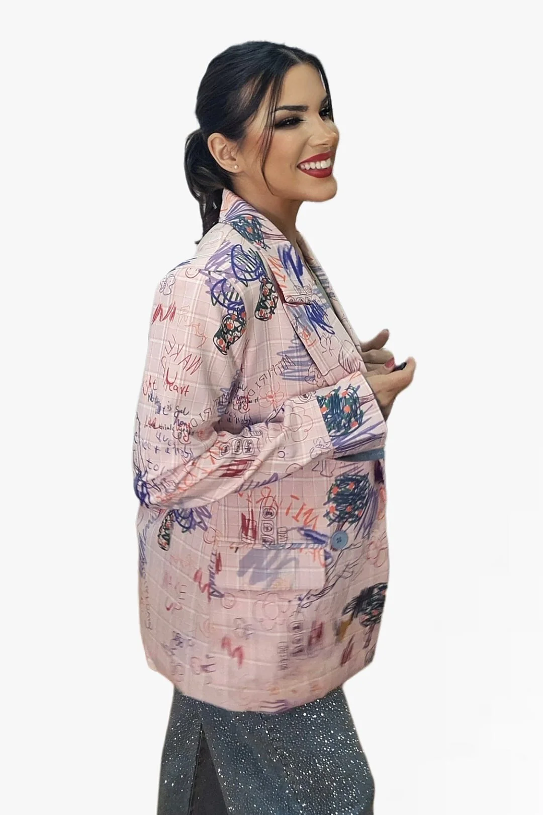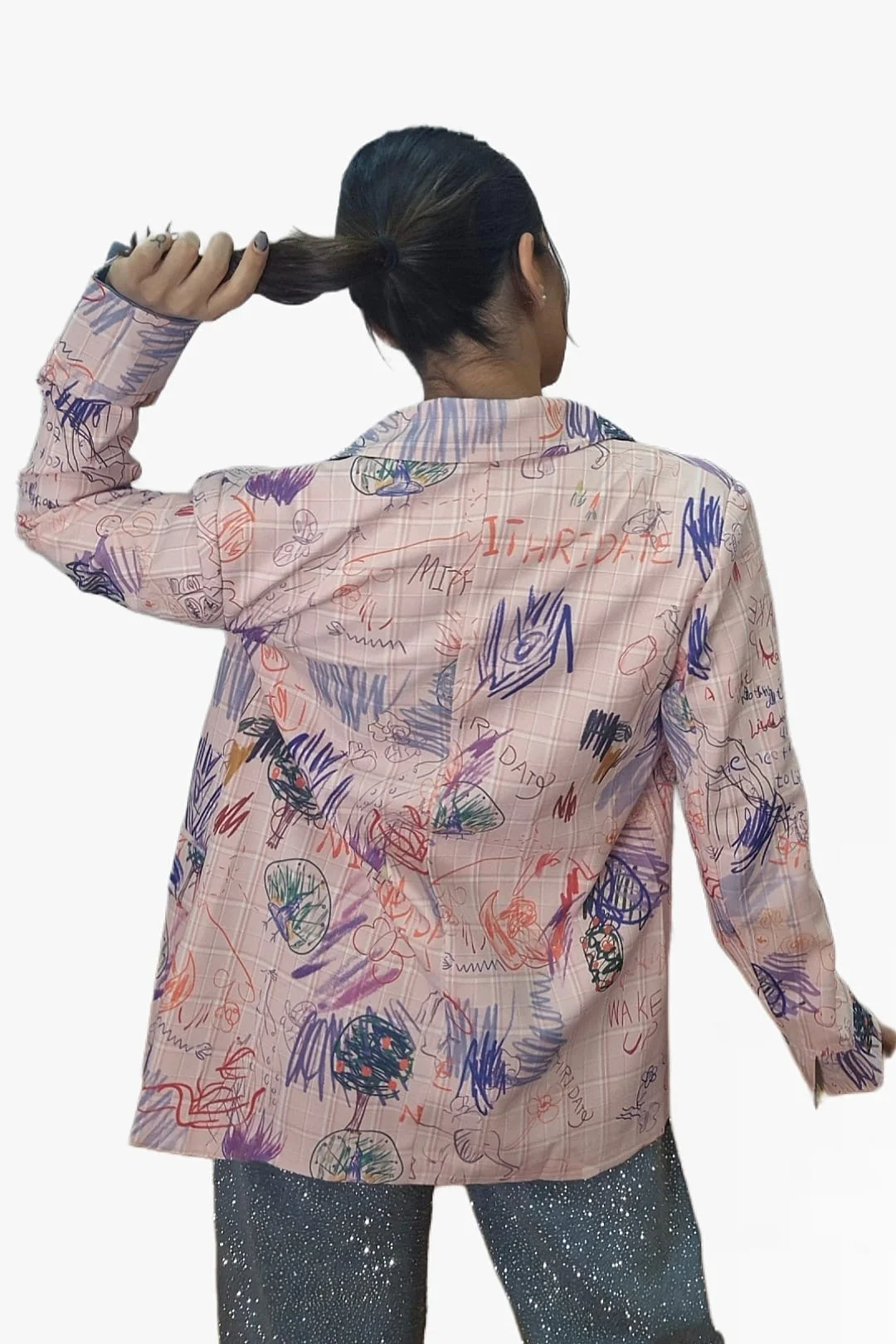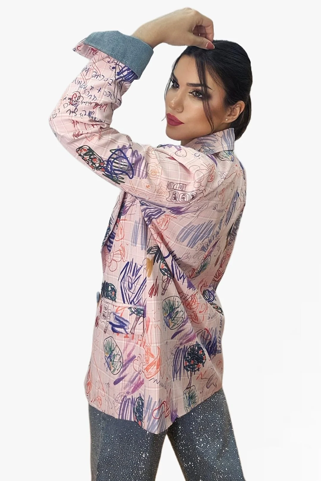 Dale un giro divertido y original a tu look con nuestra blazer cuadros garabatos. Su estampado único recuerda a una pizarra llena de garabatos hechos con tizas de colores, lo que la convierte en una prenda creativa y con mucha personalidad. De corte oversize y entallada en el cuerpo, combina estilo desenfadado con estructura elegante. Presenta solapas grandes, cierre cruzado con botones y vuelta de manga tipo vaquera que aporta un toque casual.