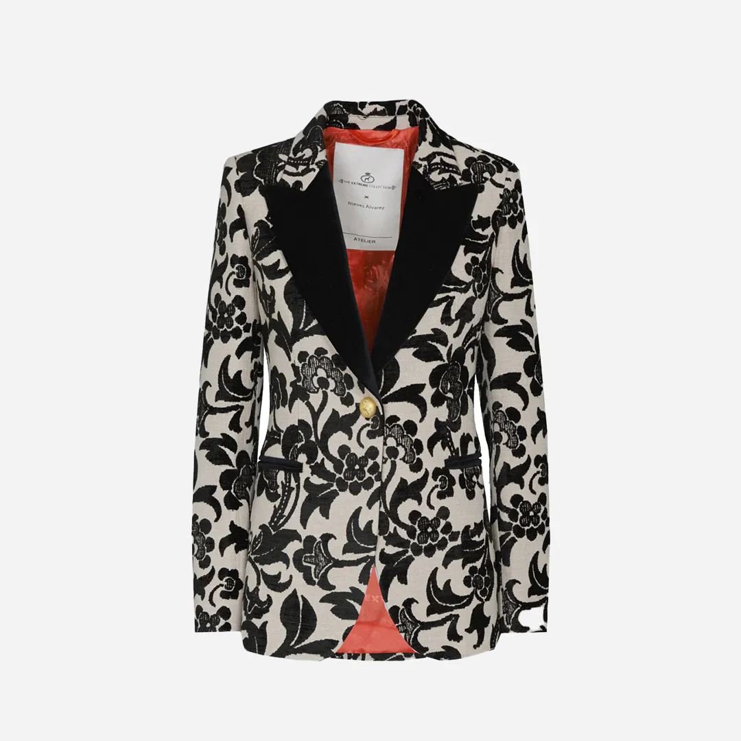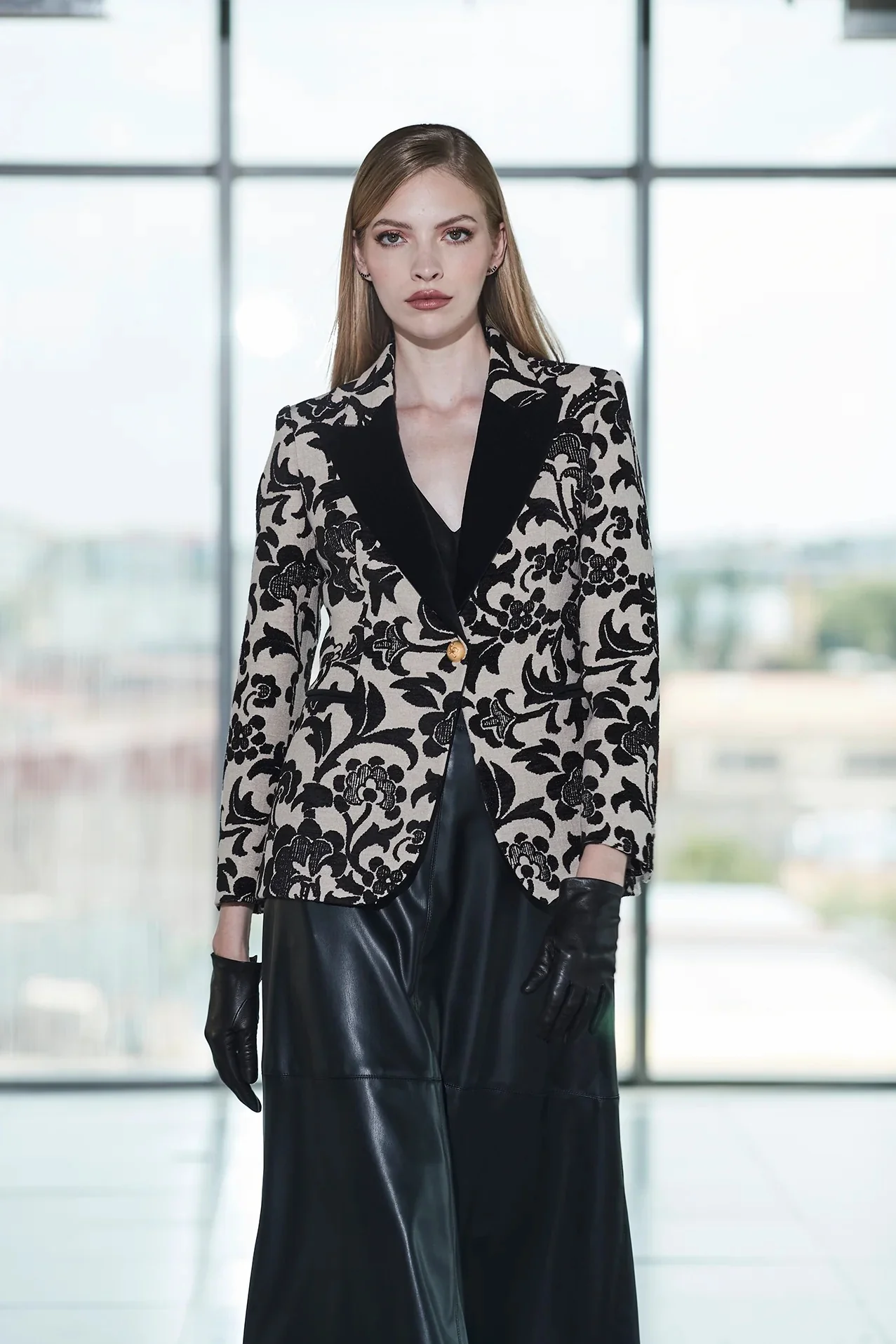 El Blazer “Noir Sauvage” encarna la fuerza del estilo urbano con la elegancia de la alta costura. Su diseño combina un estampado animal en tonos blanco y negro con un corte estructurado que realza la figura y aporta carácter.