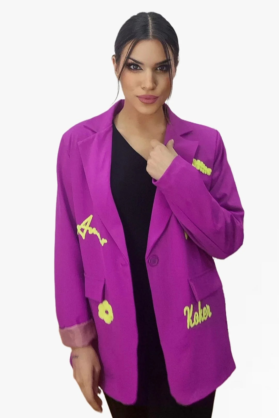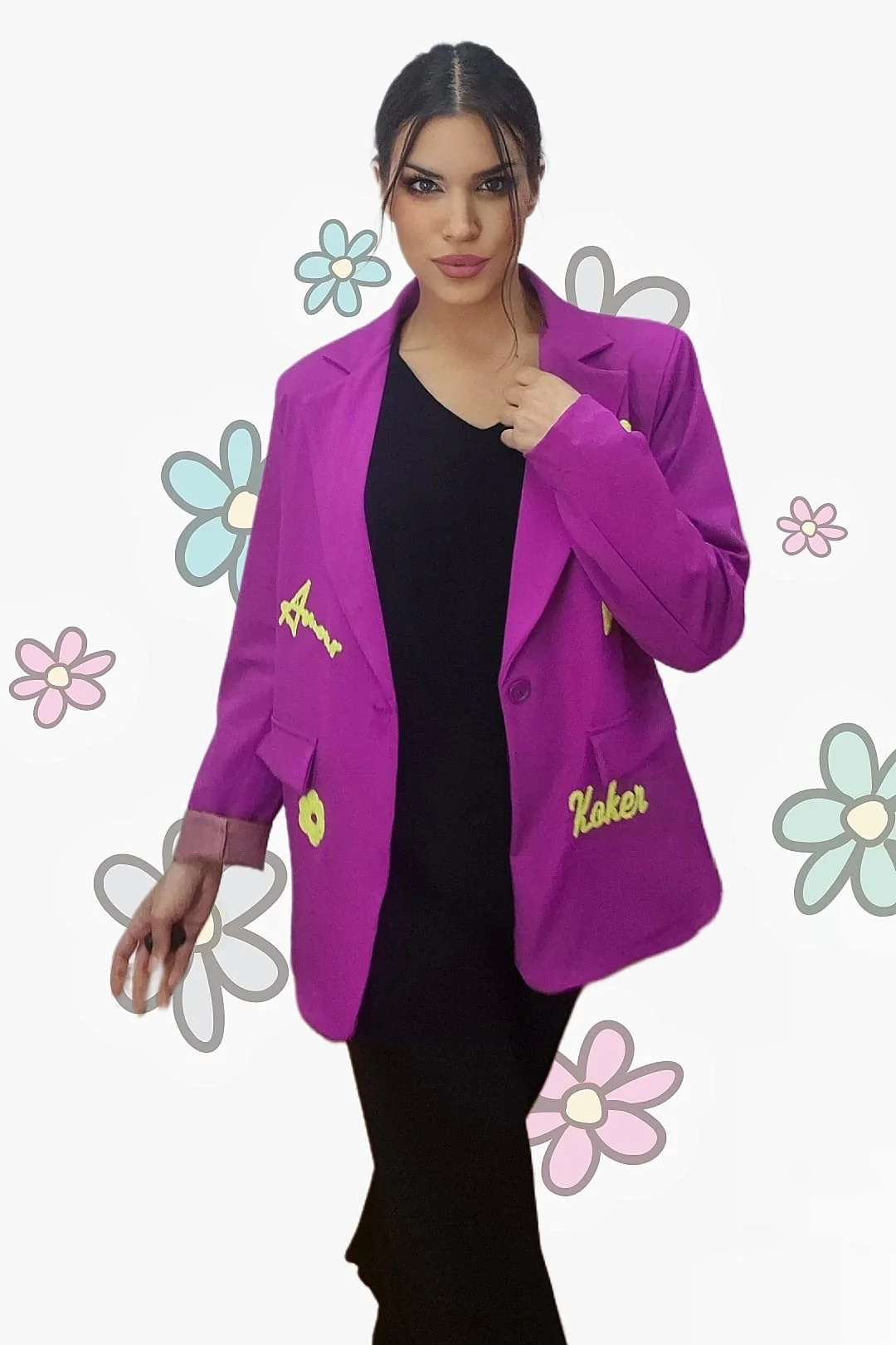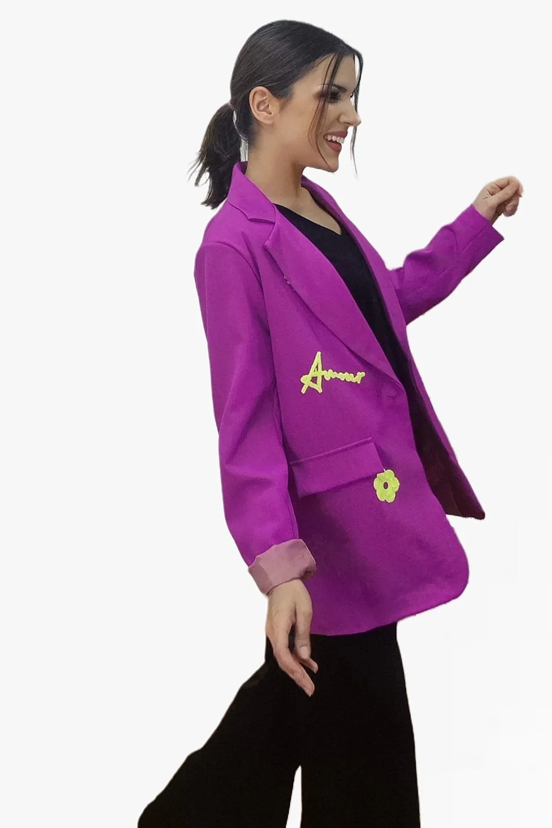 Blazer de manga larga, corte recto con un solo botón, bolsillos falsos y detalles bordados en relieve.