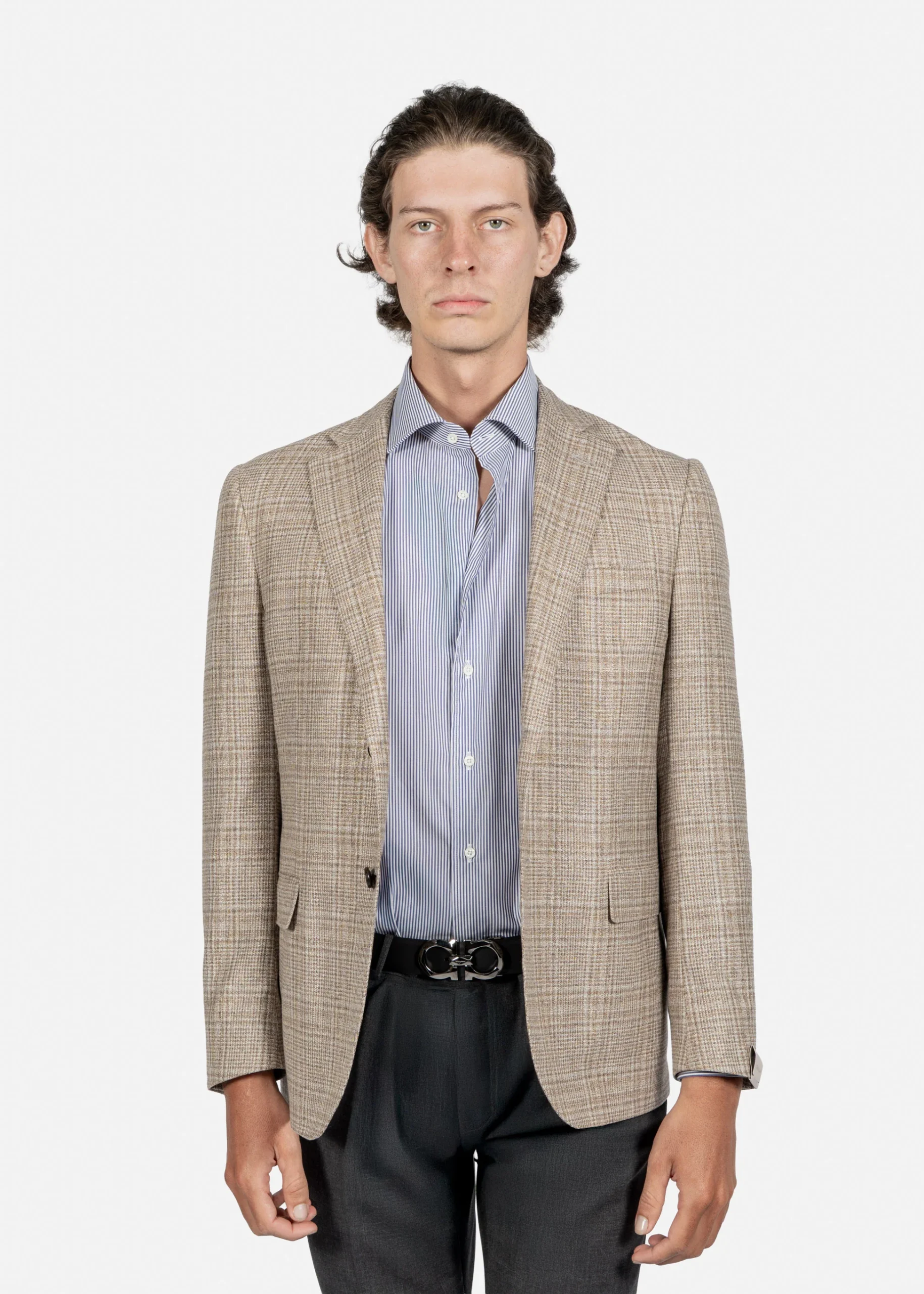 blazer Corneliani en tono beige con diseño de cuadros finos representa la elegancia italiana en su máxima expresión. Confeccionado con tejidos de alta calidad, su estructura ligera y corte preciso ofrecen un ajuste cómodo y refinado. Ideal para elevar un look casual o complementar un atuendo formal, esta pieza combina tradición sartorial y estilo moderno. Un imprescindible para quienes valoran la distinción en cada detalle.