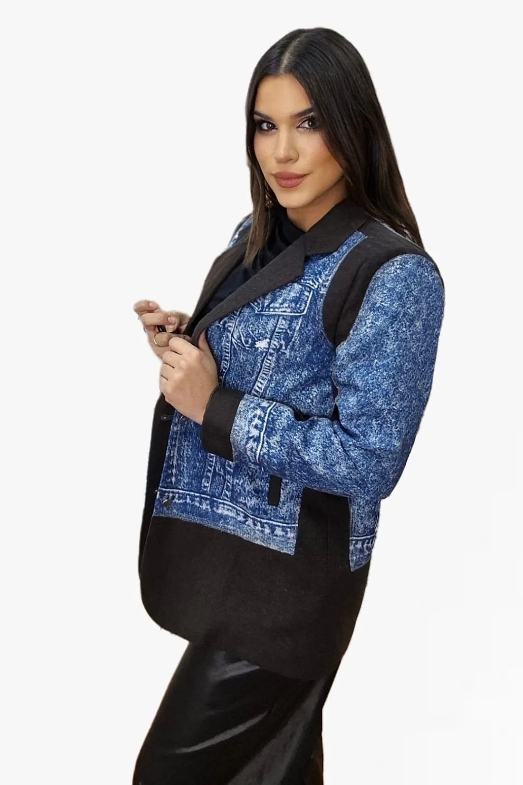 Una prenda que reinventa el clásico blazer con un toque urbano. Confeccionada en 100% poliéster, su diseño combina el efecto denim con bloques en color liso, logrando una pieza moderna, atrevida y llena de estilo.
