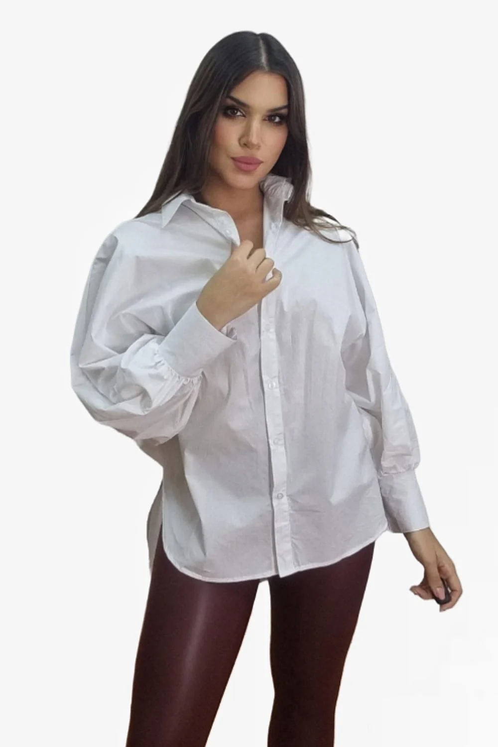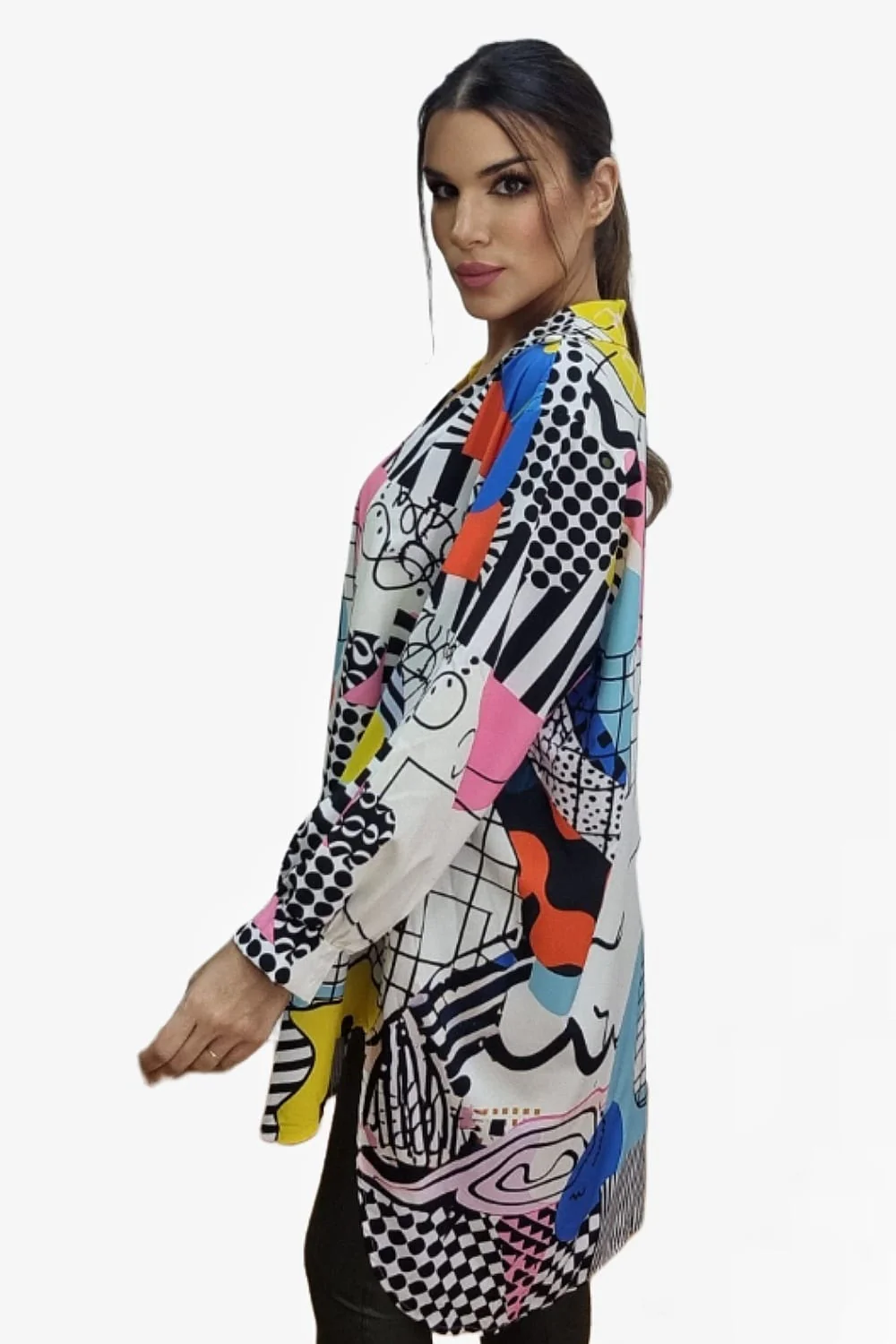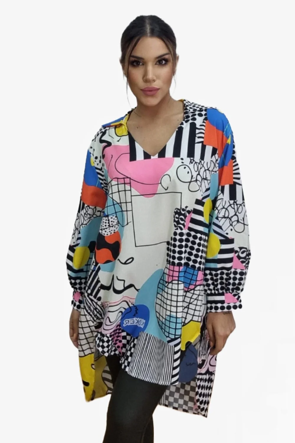 Blusa oversize asim茅trica con corte largo trasero. Ideal para llevar con vaquero o leggins.