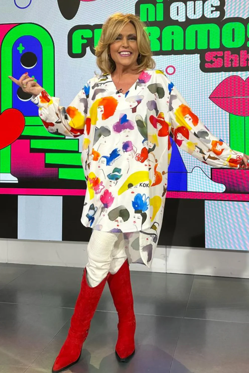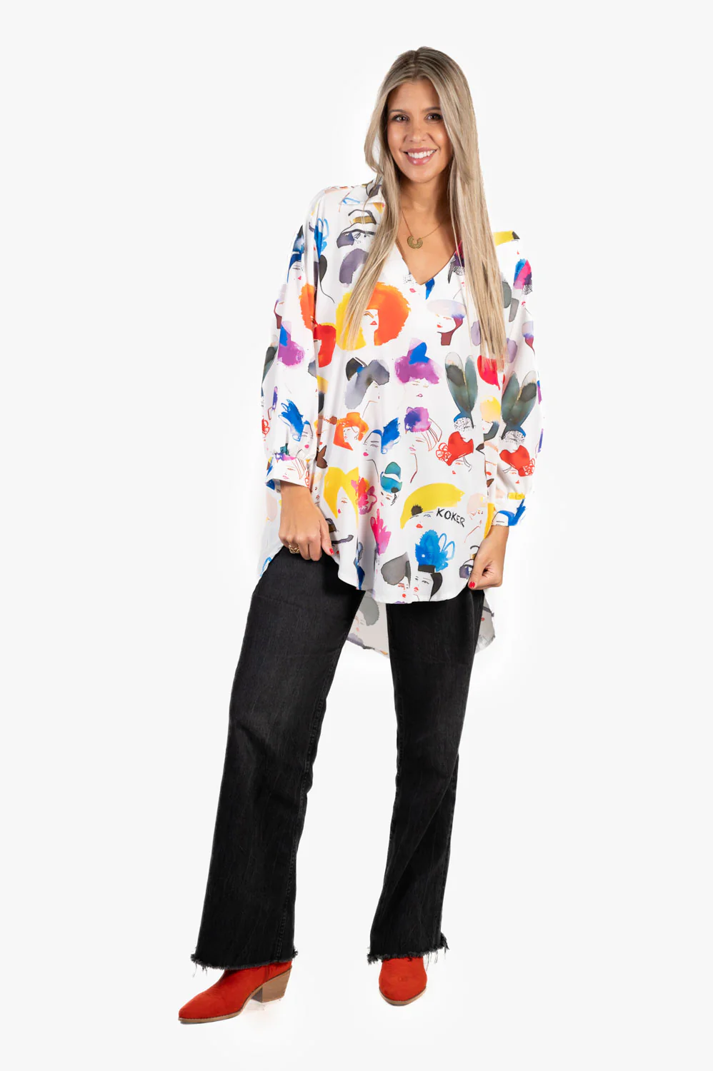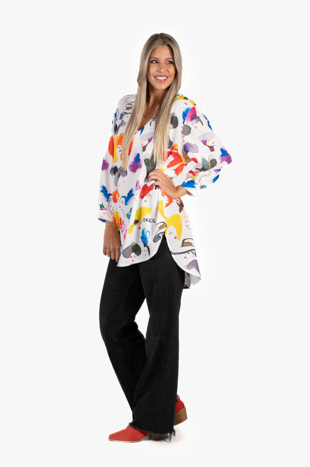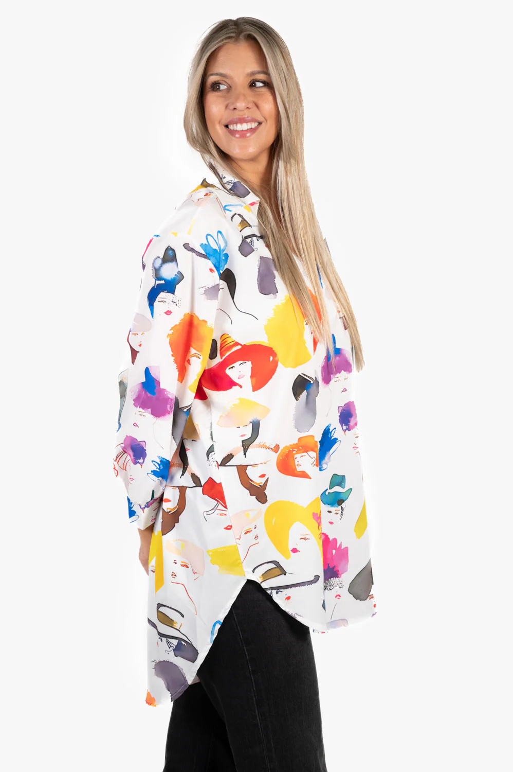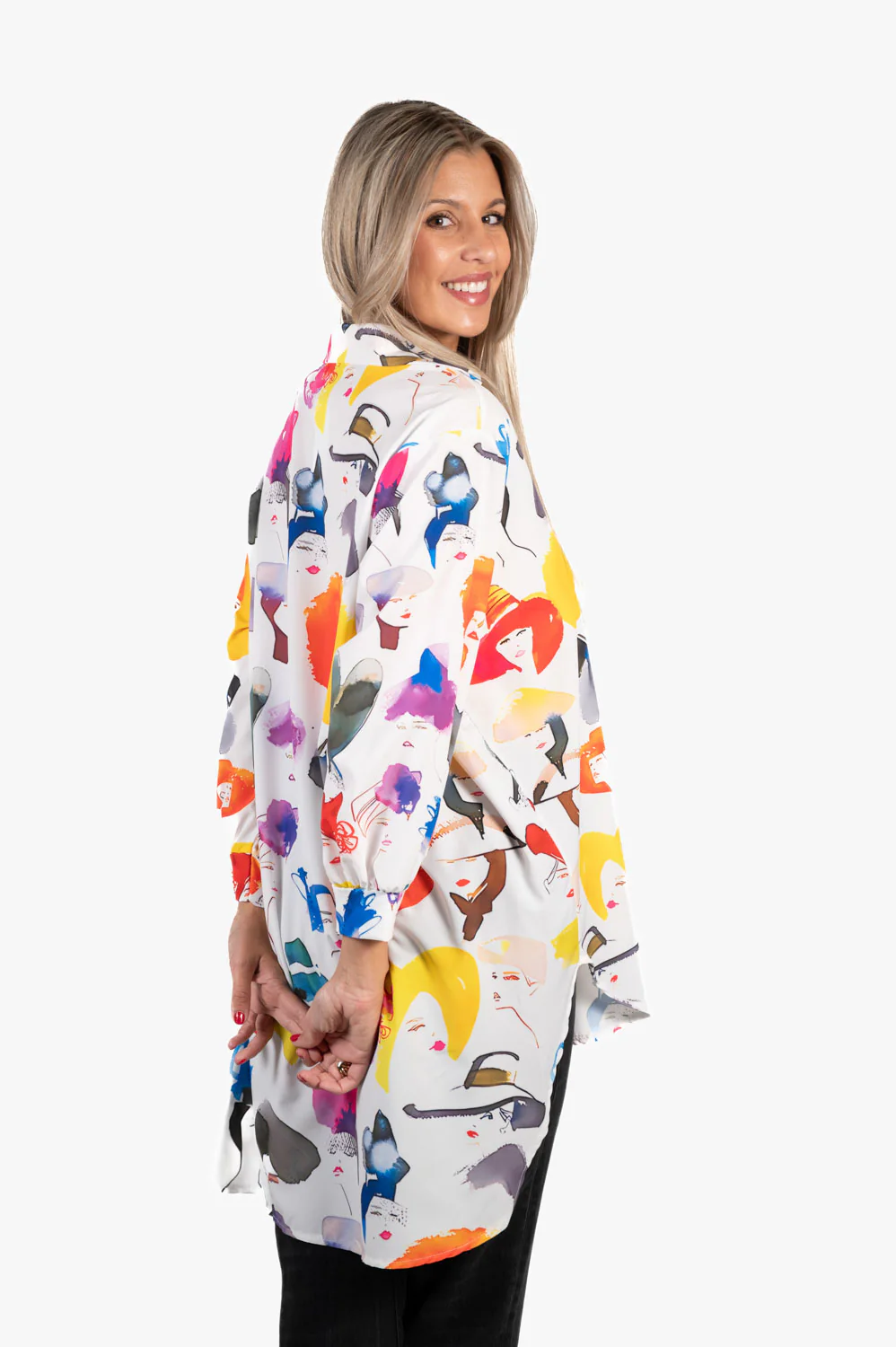 Blusa oversize con corte largo trasero. Estampado variado y colorido. Ideal para llevar con vaquero y leggins y dar un toque divertido y alegre a tu look.