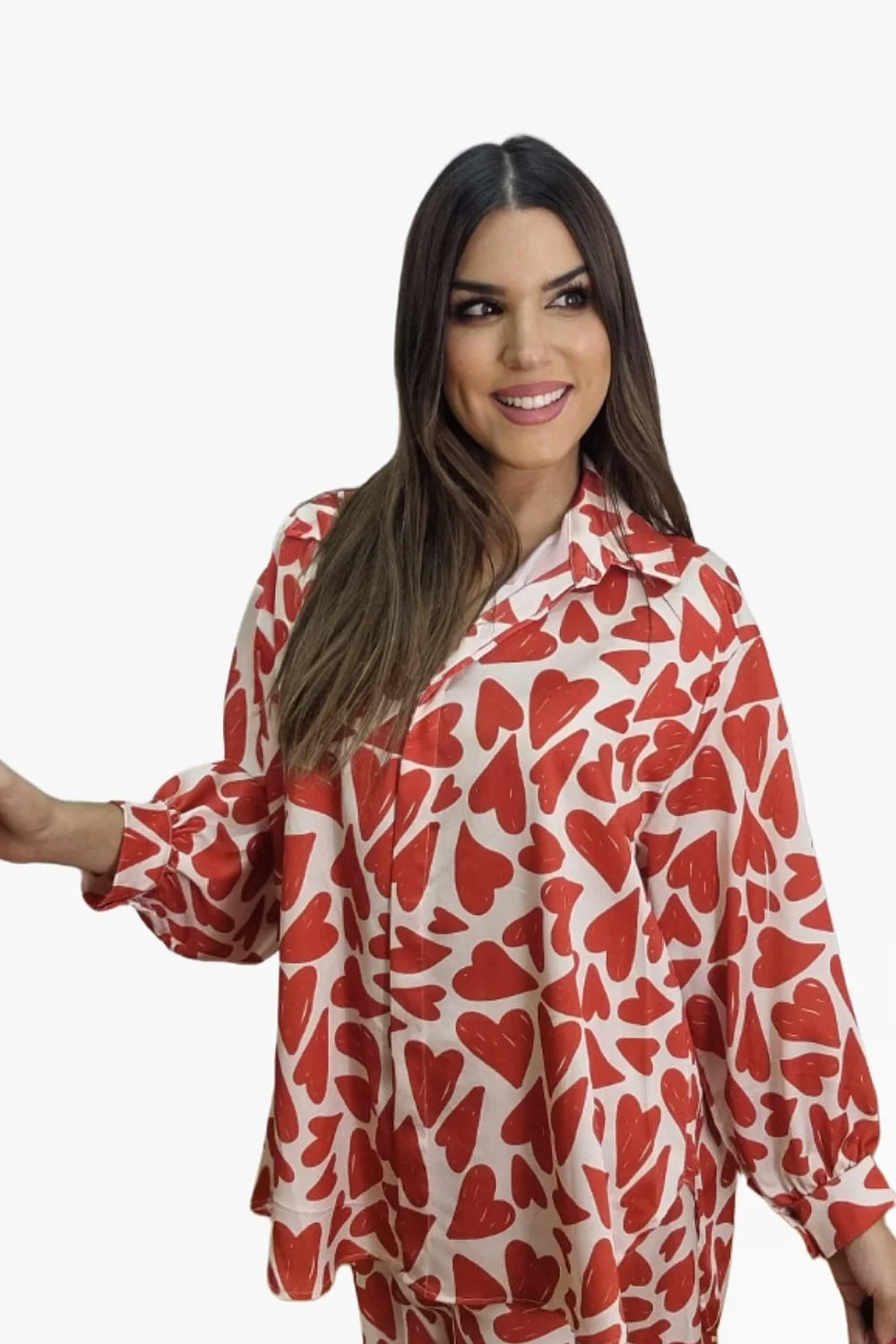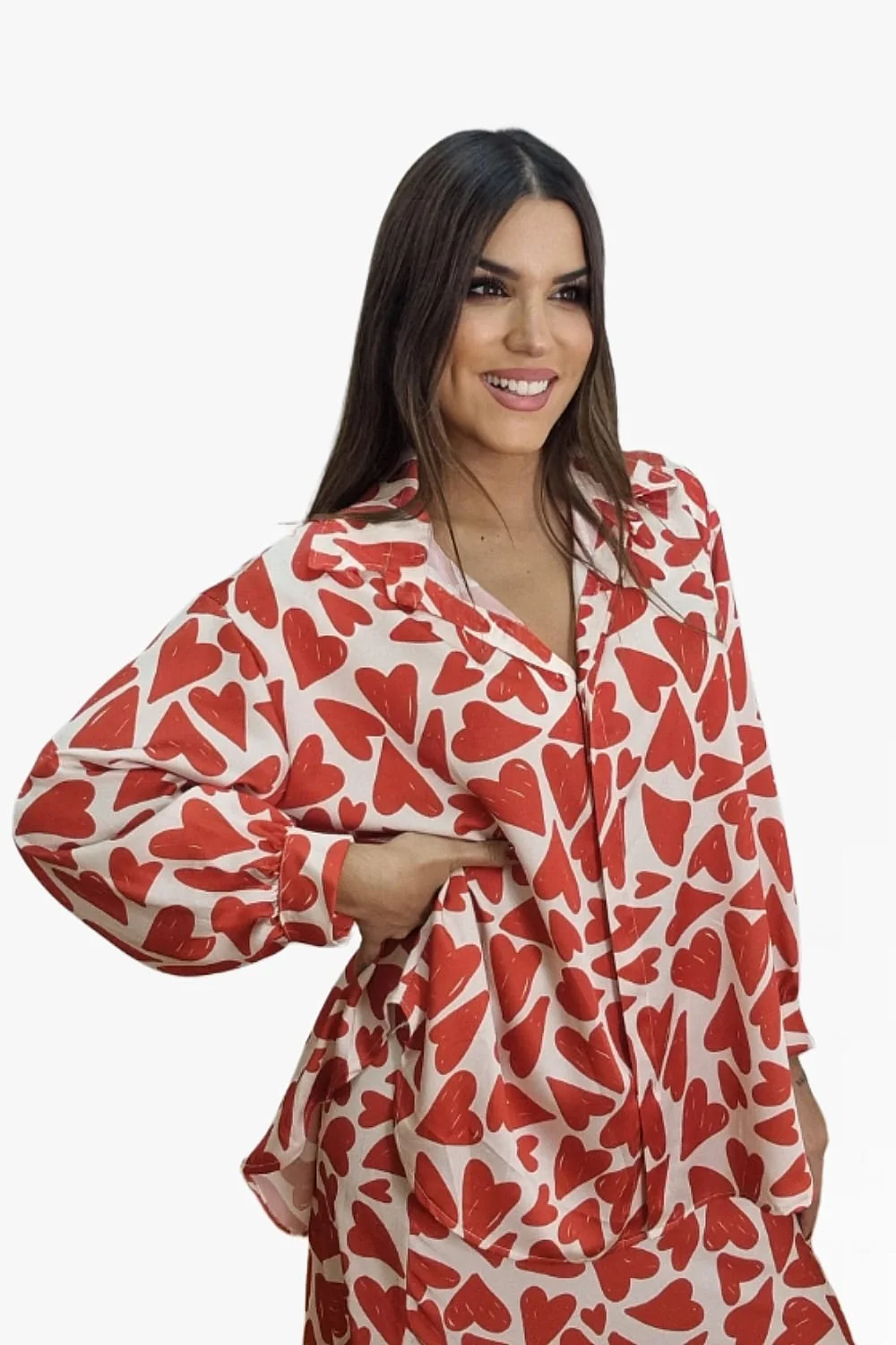 Blusa ancha abotonada, parte trasera más larga, con cuello de camisa.