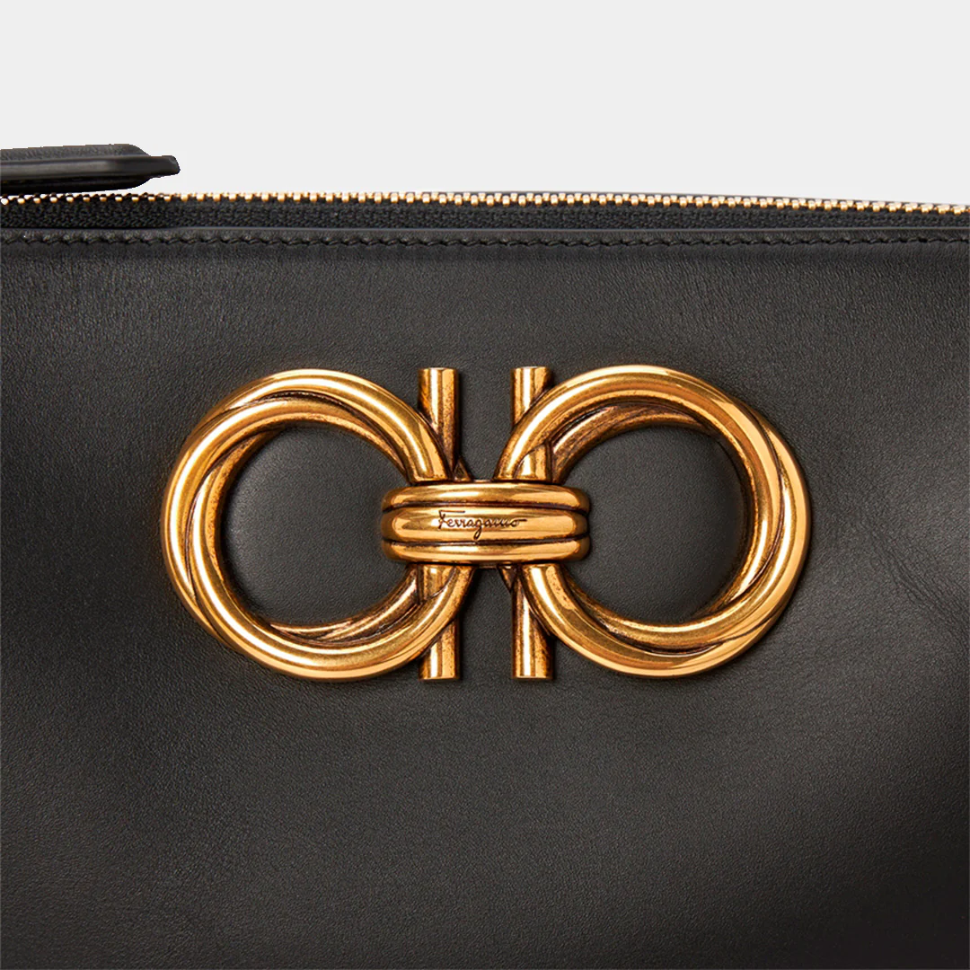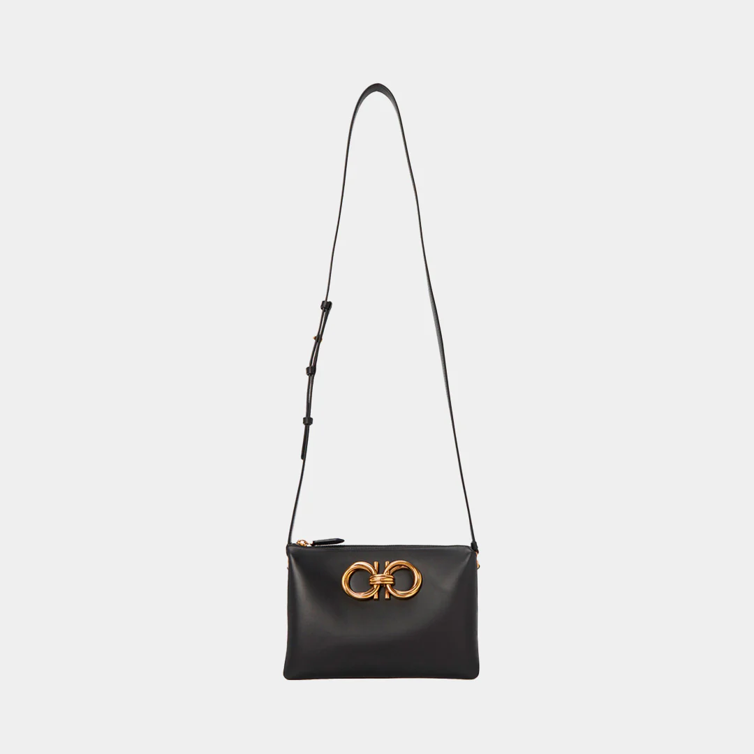 Bolso para dama Mini G.Cros en Cuero color Negro de Salvatore Ferragamo. Detalle gancini con múltiples bolsillos, con piel de becerro negra, placa gancini, múltiples bolsillos internos y correa de hombro ajustable.