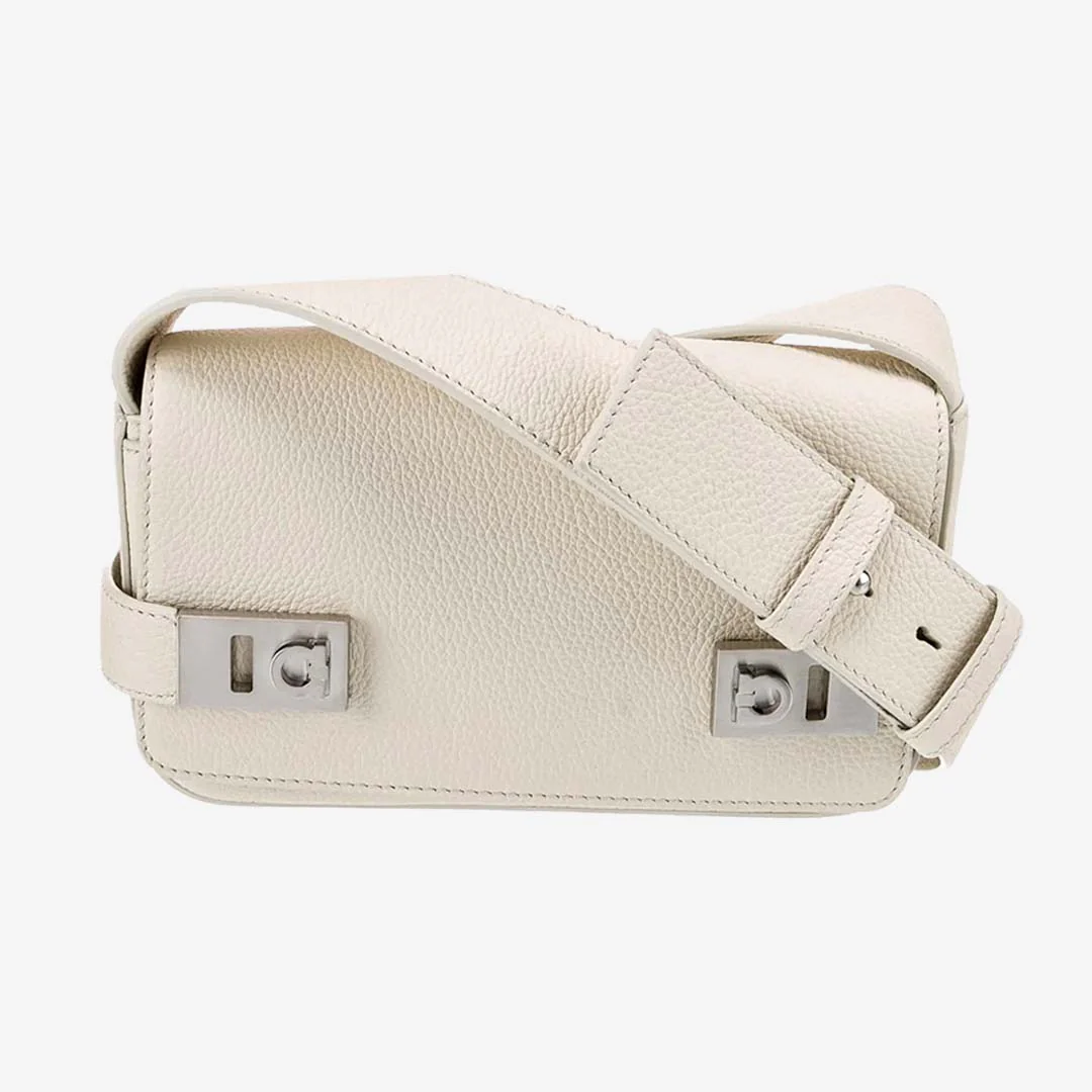 El Bolso Ferragamo en cuero blanco, confeccionada con piel italiana de alta gama, ofrece un diseño sofisticado, minimalista y atemporal que refleja lujo y elegancia. Su tonalidad blanca destaca la pureza del estilo, mientras su estructura funcional proporciona espacio y protección para tus pertenencias.