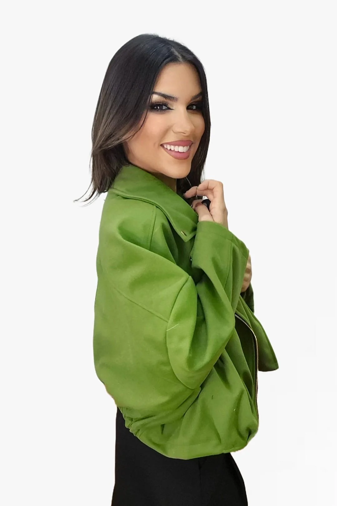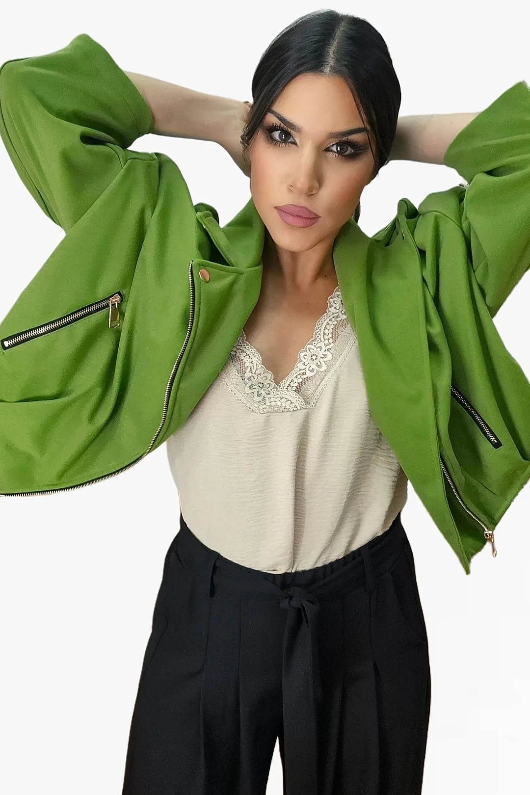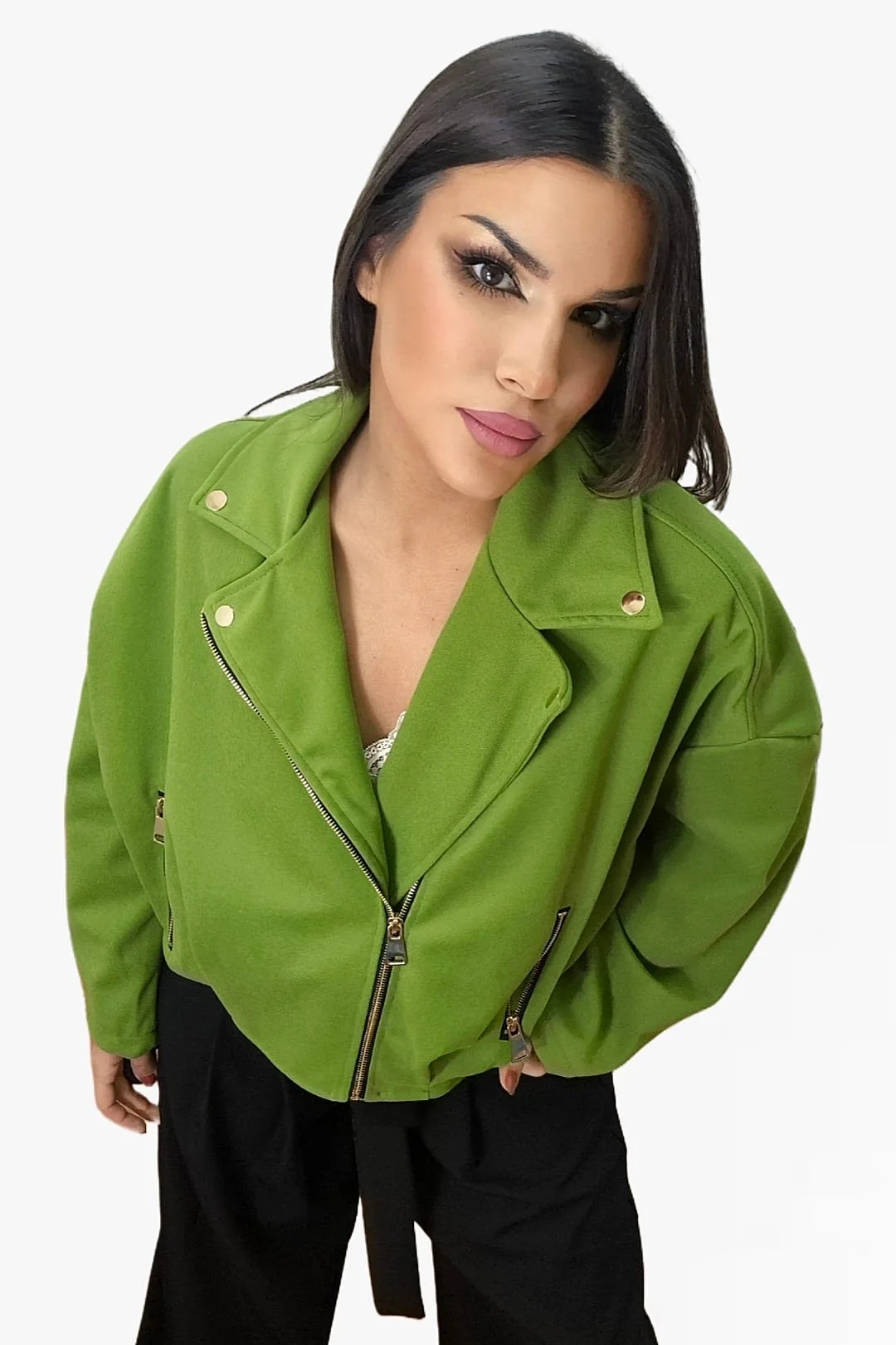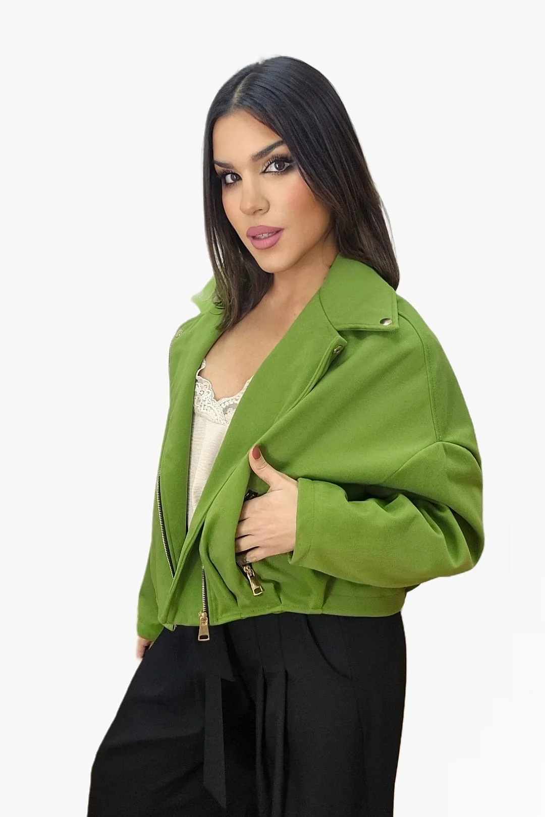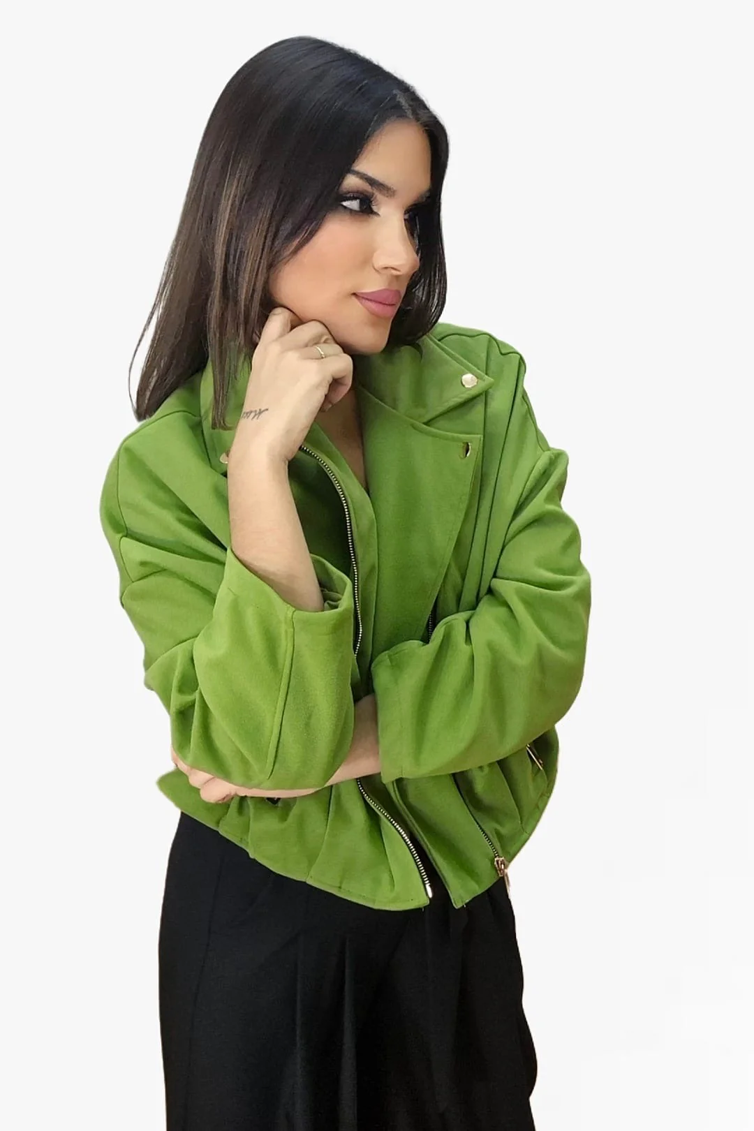 La actitud biker se reinventa en clave urbana con esta bomber de corte estructurado, perfecta para elevar cualquier look del día a la noche. Su diseño mezcla el clásico corte bomber con detalles de chaqueta biker: solapas marcadas, cremallera frontal y bolsillos con cremallera para un toque moderno y funcional.