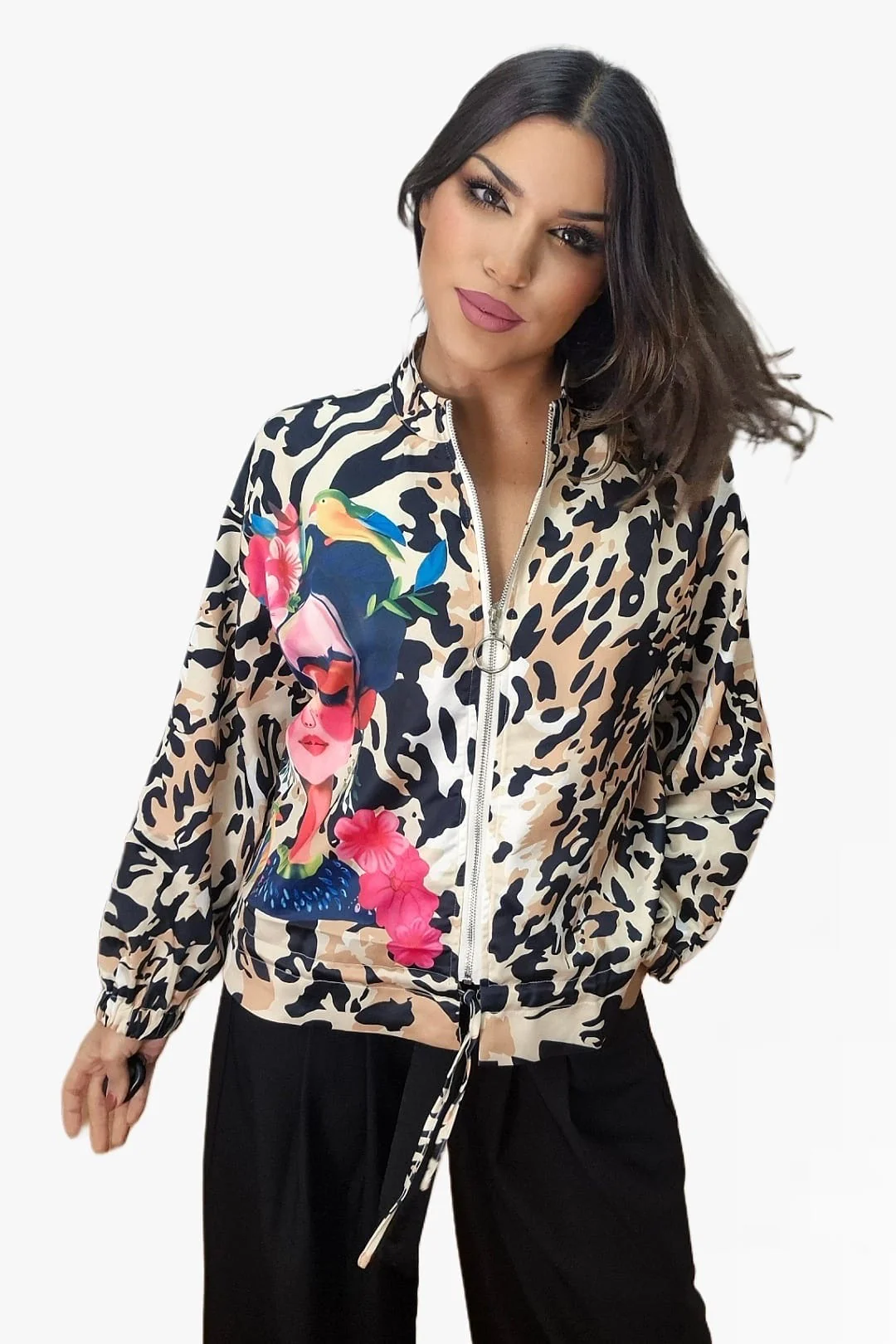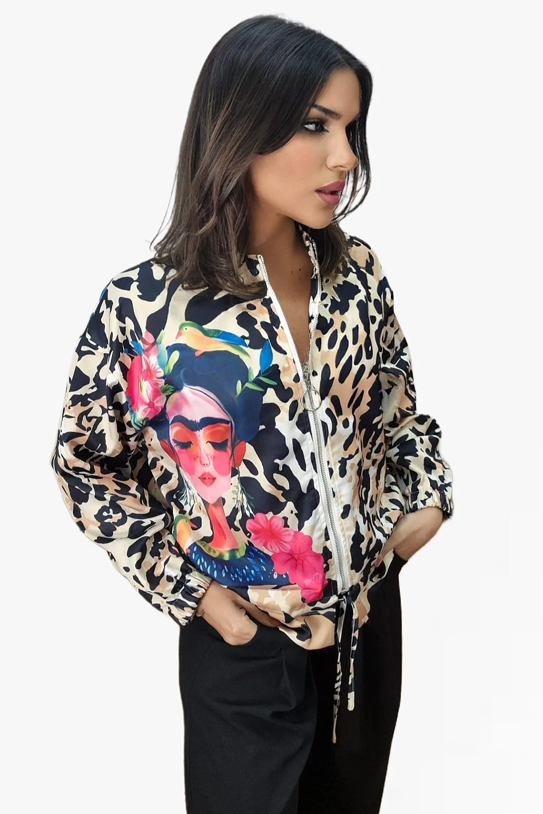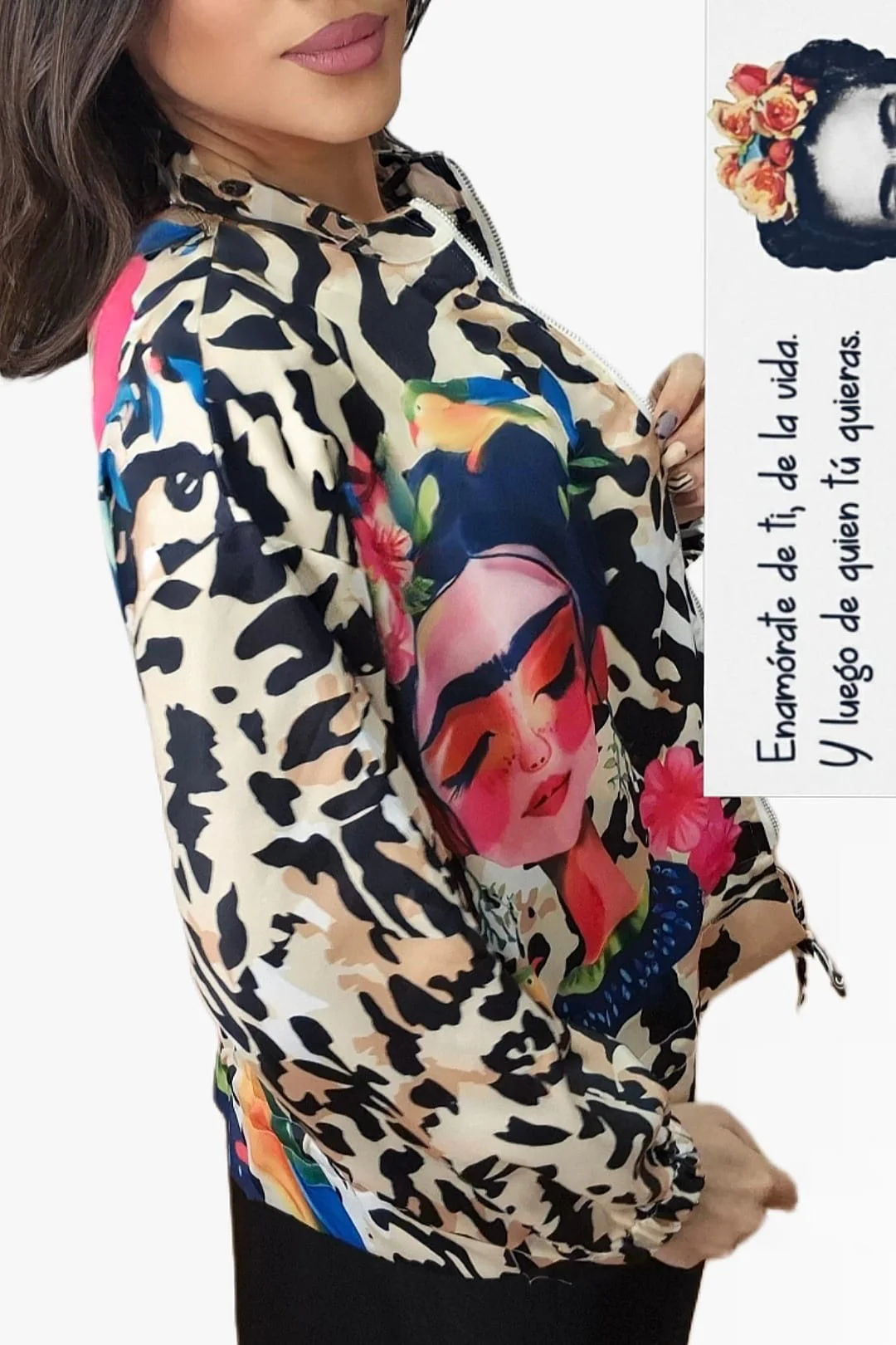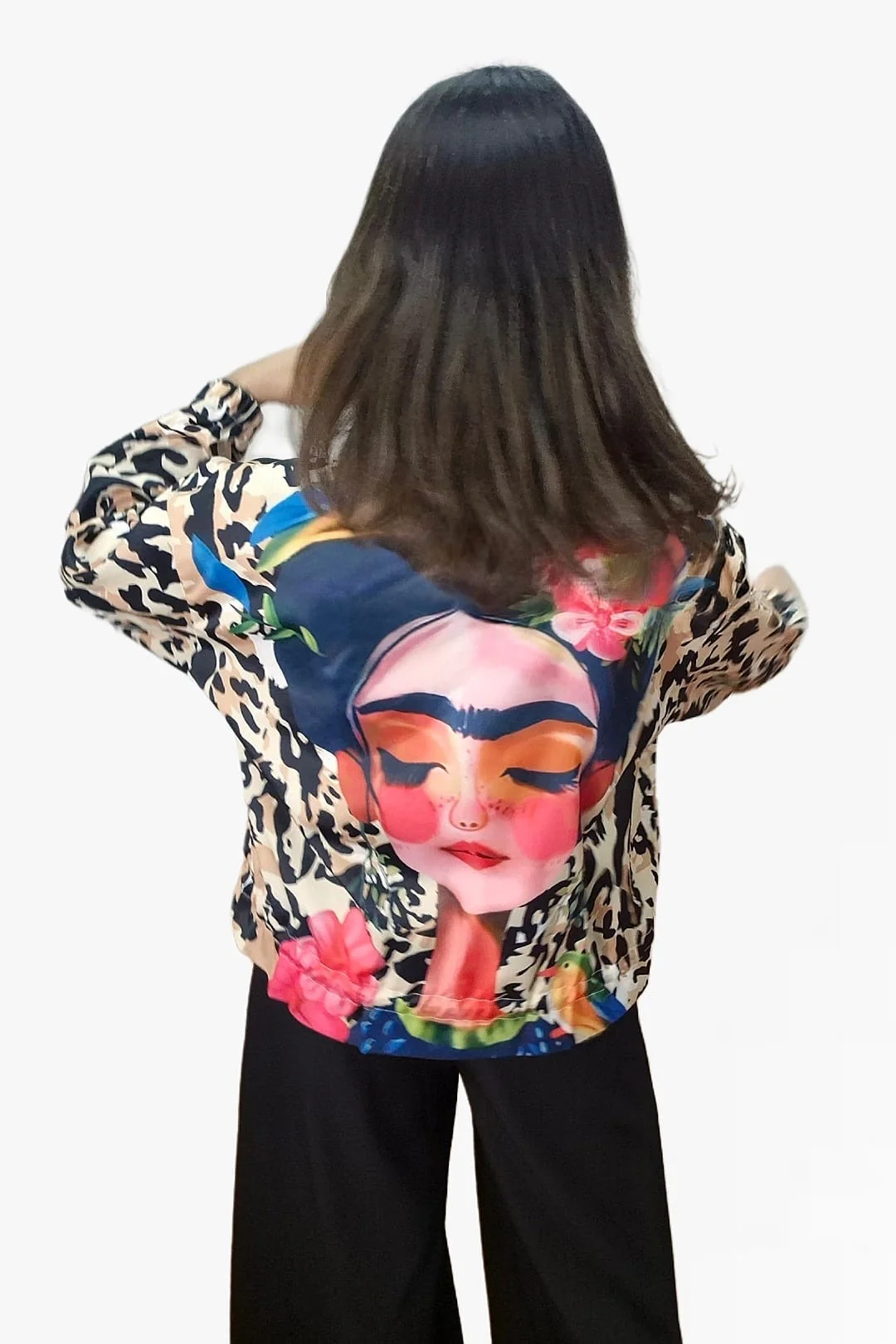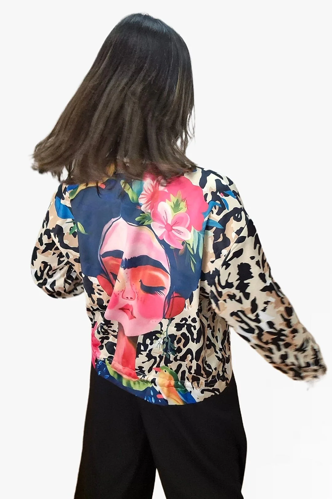 Haz que tu look hable por ti con esta bomber de edición especial, donde el estilo urbano se mezcla con el arte más vibrante. Su base animal print se combina con una ilustración tipo Frida Kahlo en el lateral delantero derecho y en toda la espalda, creando una prenda única y llena de personalidad.