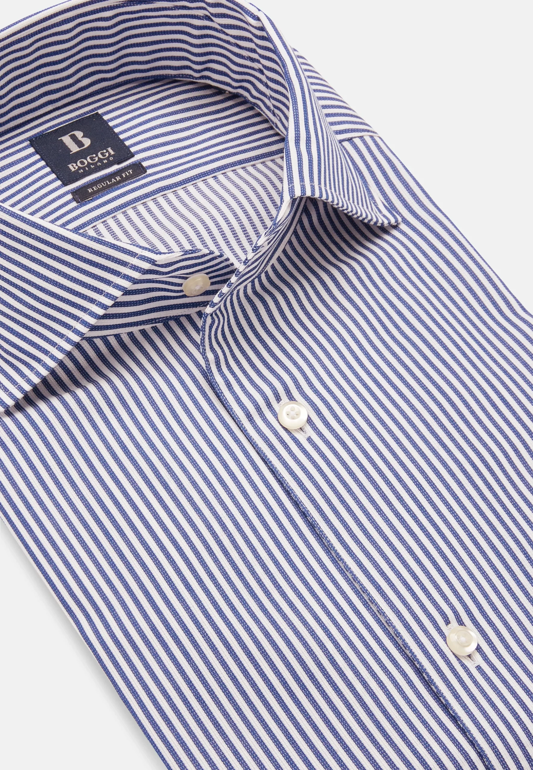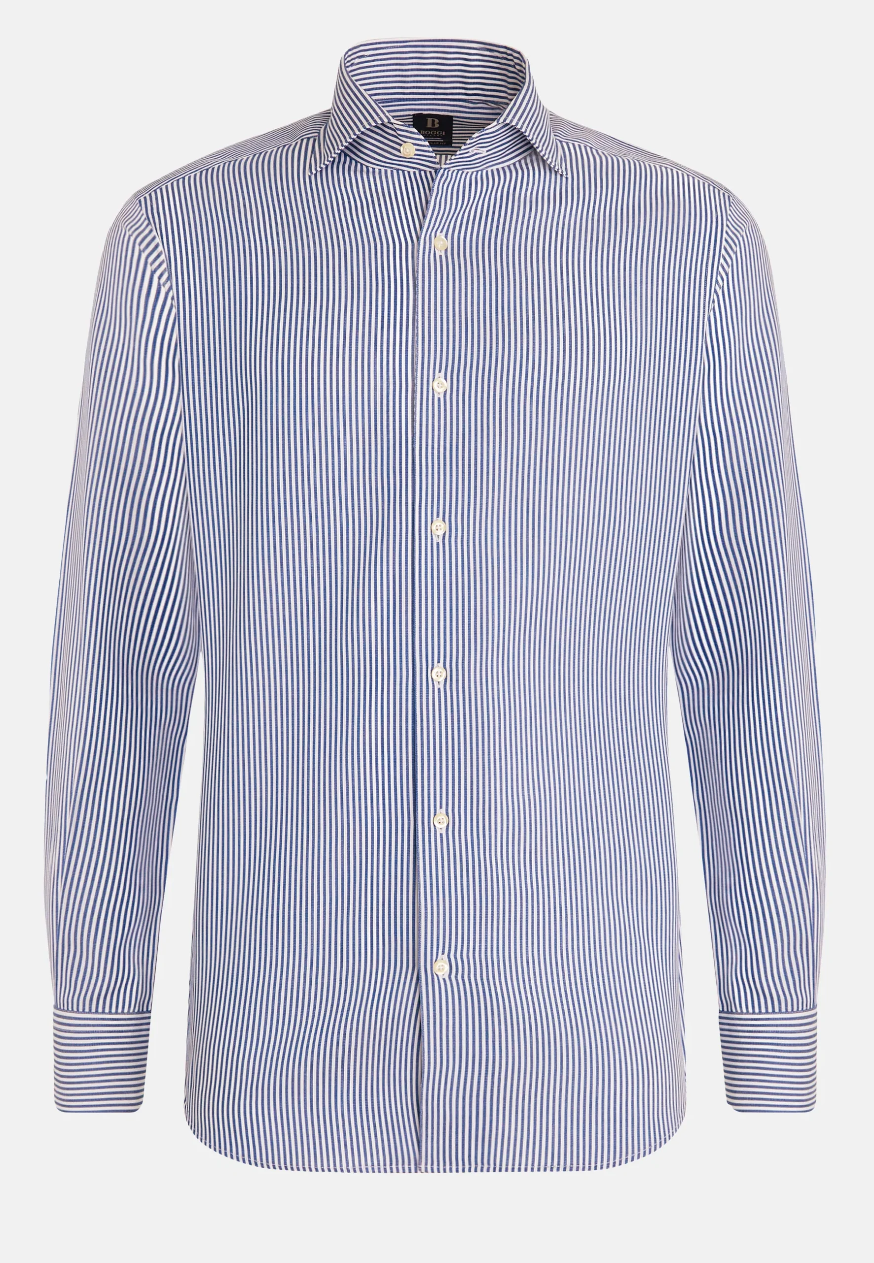 camisa de Boggi Milano está confeccionada en popelín de algodón de alta calidad, destacando por su elegante patrón de finas rayas azules y blancas que crean un efecto visual sofisticado. Su corte slim fit está diseñado para una silueta moderna y pulcra, ideal para llevar bajo un traje o un blazer. El cuello, que parece ser un cutaway o semi-italiano, es perfecto para lucir con una corbata o desabrochado para un look más relajado pero formal
