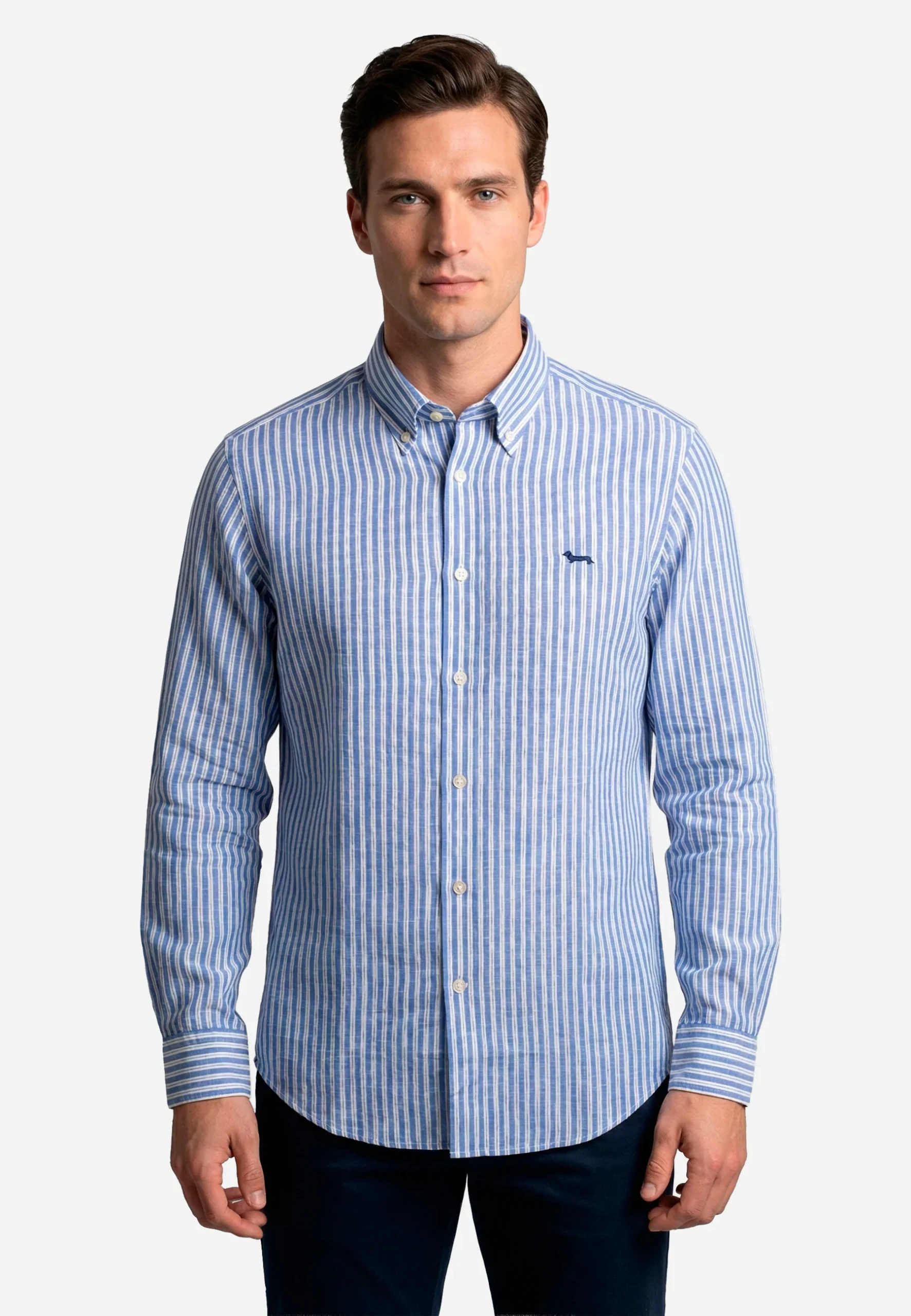 camisa de Harmont & Blaine está confeccionada en popelín de algodón de alta calidad, destacando por su elegante patrón de finas rayas azules y blancas que crean un efecto visual sofisticado. Su corte slim fit está diseñado para una silueta moderna y pulcra, ideal para llevar bajo un traje o un blazer. El cuello, que parece ser un cutaway o semi-italiano, es perfecto para lucir con una corbata o desabrochado para un look más relajado pero formal