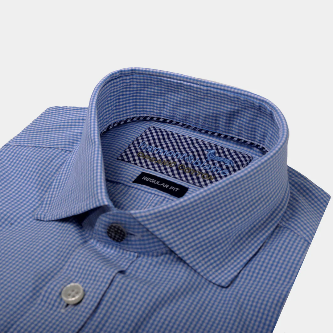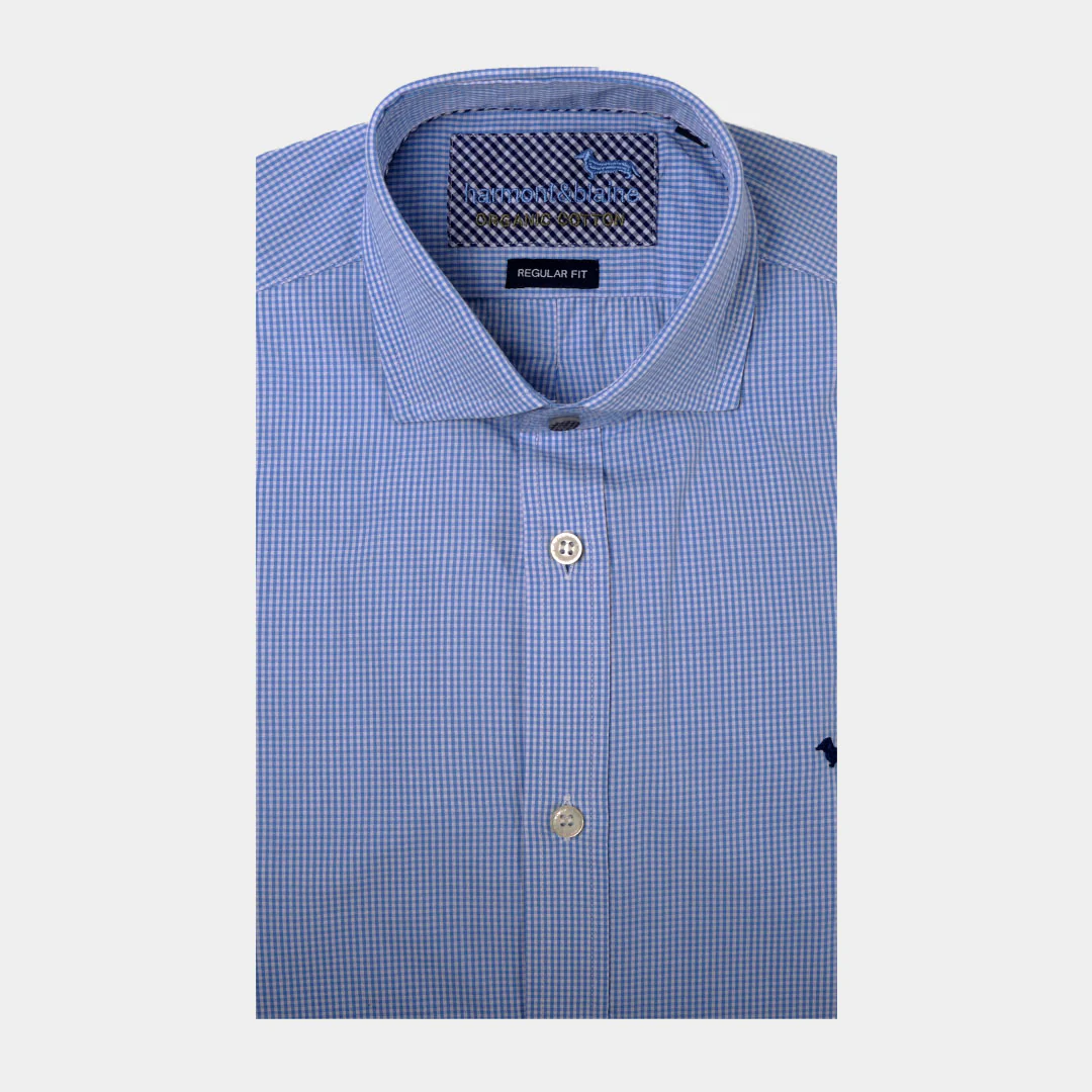 Camisa azul para hombre de Harmont & Blaine, con un sutil micro estampado que le aporta estilo sin perder elegancia. Diseñada con cuello button-down, cierre con botones al frente, y el clásico logo del perro dachshund bordado en el pecho. Las mangas largas y los puños abotonados completan este diseño versátil y moderno.