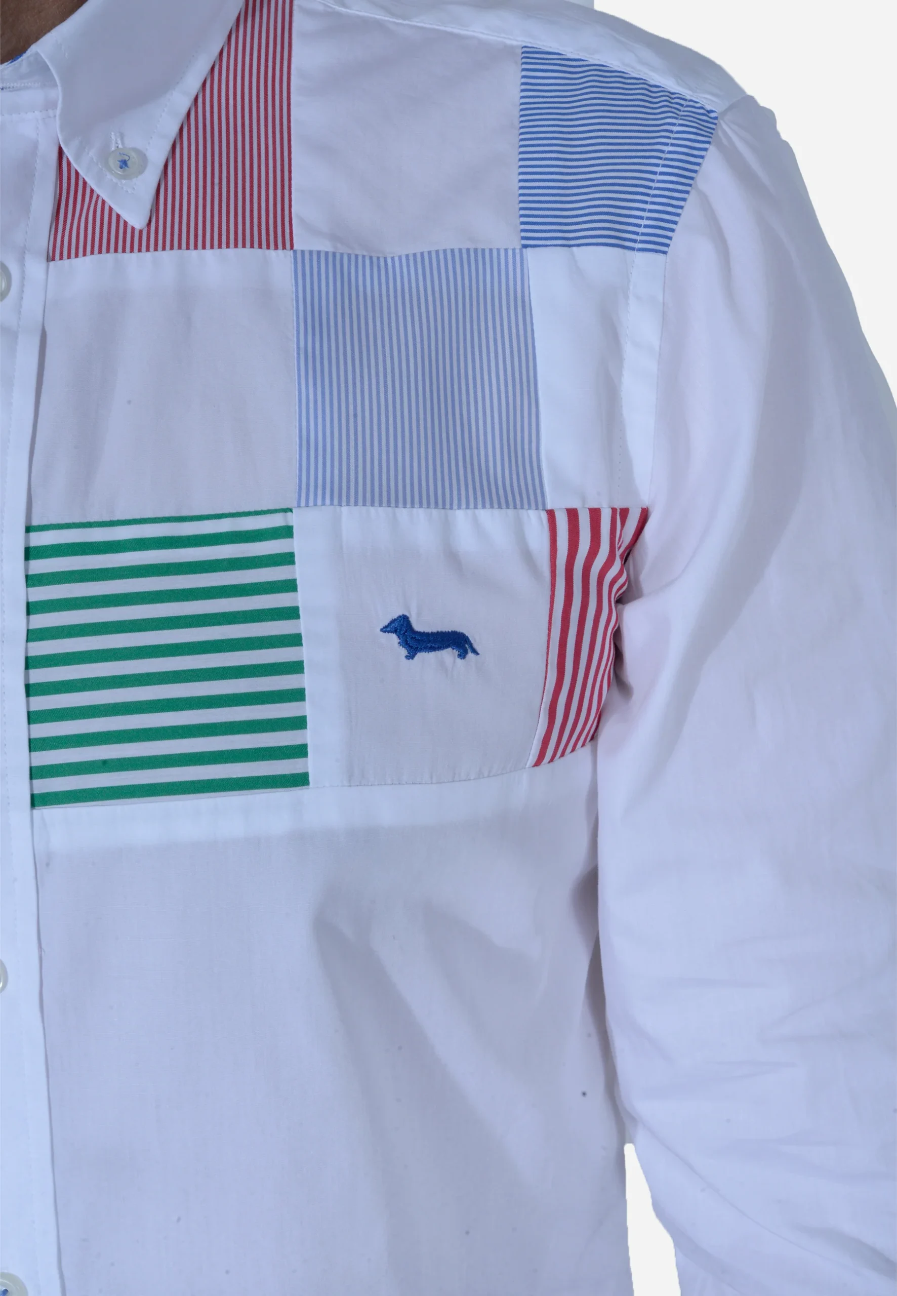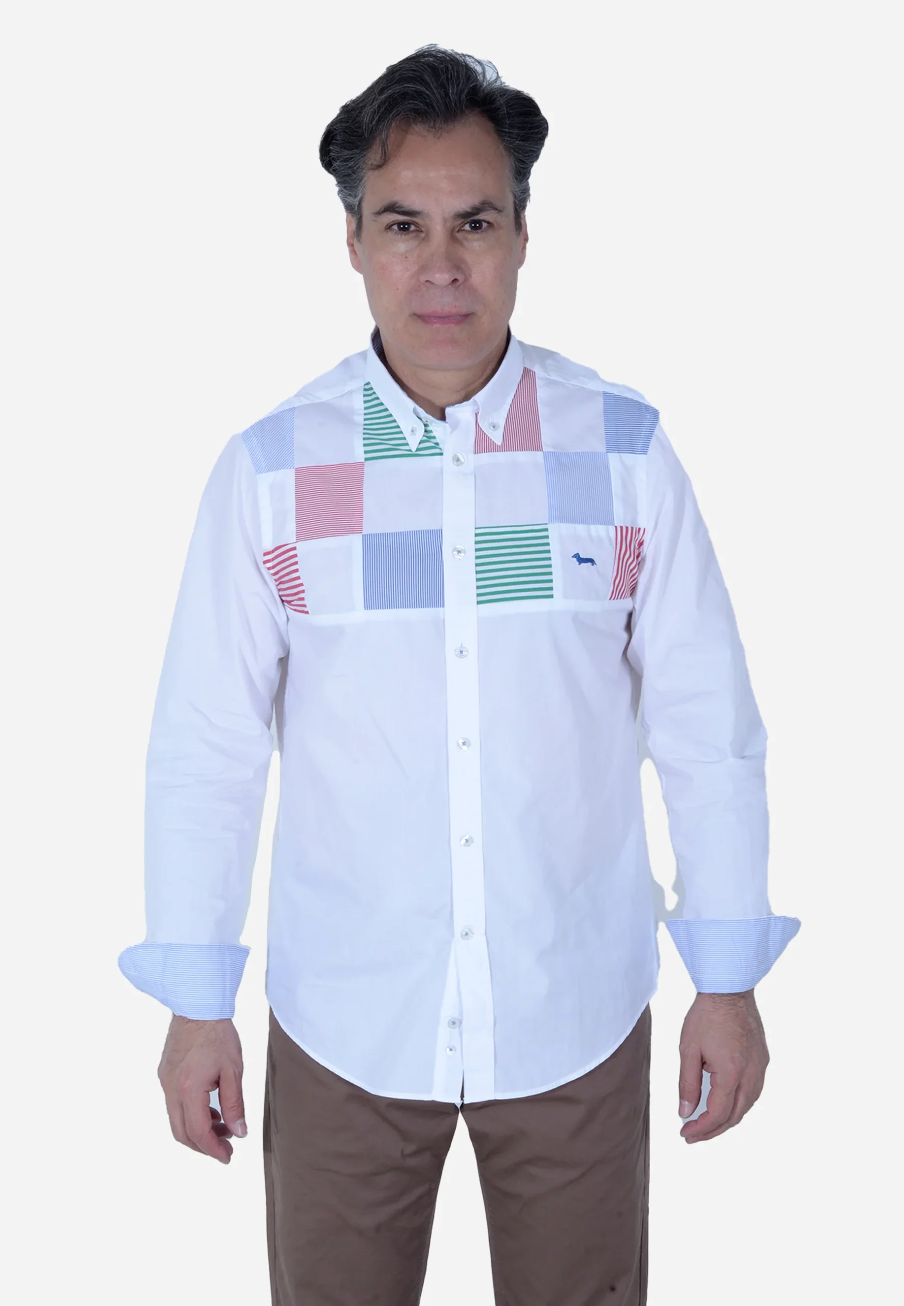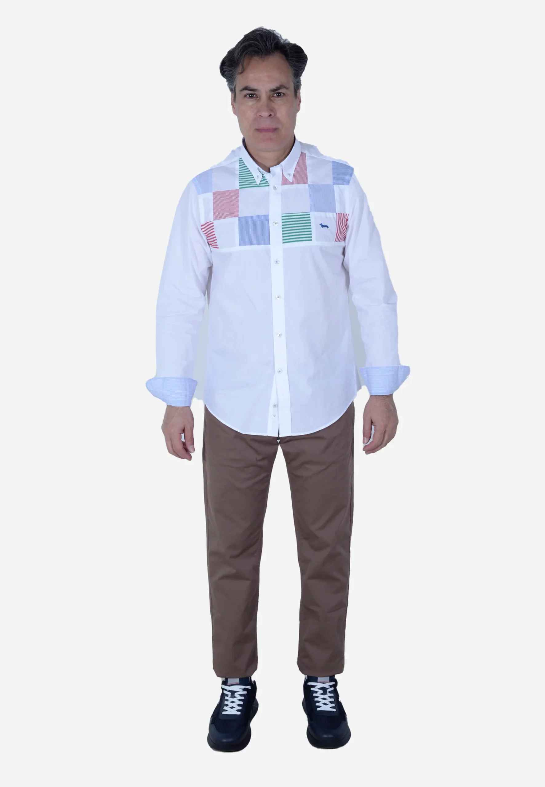 Presenta un patrón de cuadros de varios colores (verde, azul, rojo, blanco) en el área del bolsillo del pecho. La camisa es mostrada desde múltiples ángulos, incluyendo vistas frontales completas, parciales y una vista trasera.