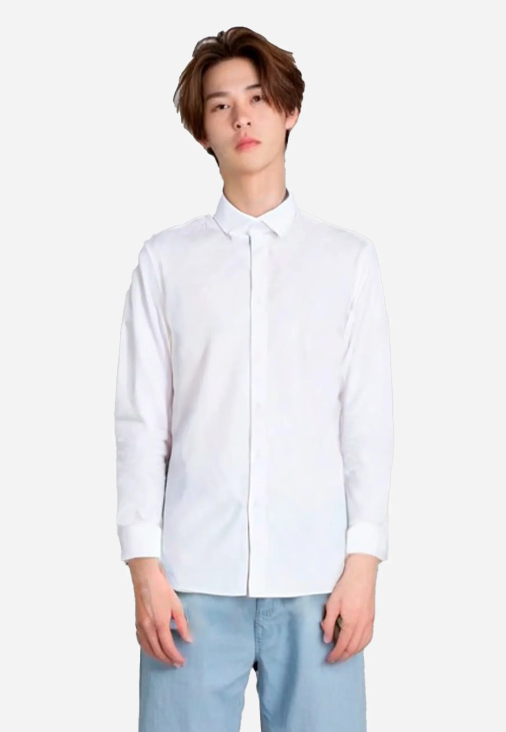Camisa básica para hombre de manga larga en color blanco clásico. Elaborada en tela ligera y suave al tacto, ofrece comodidad y frescura durante todo el día. Presenta un diseño minimalista con cuello clásico y cierre frontal de botones ocultos, ideal para un look elegante, casual o de oficina. Su versatilidad permite combinarla fácilmente con jeans, pantalones de vestir o bermudas para diferentes ocasiones.