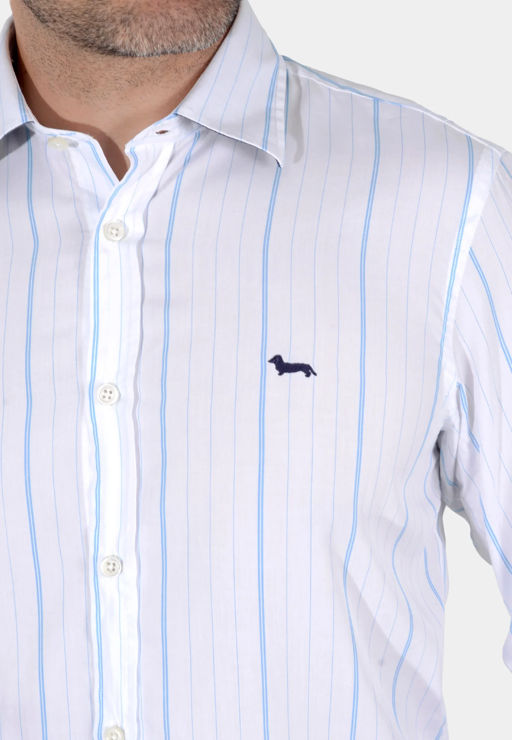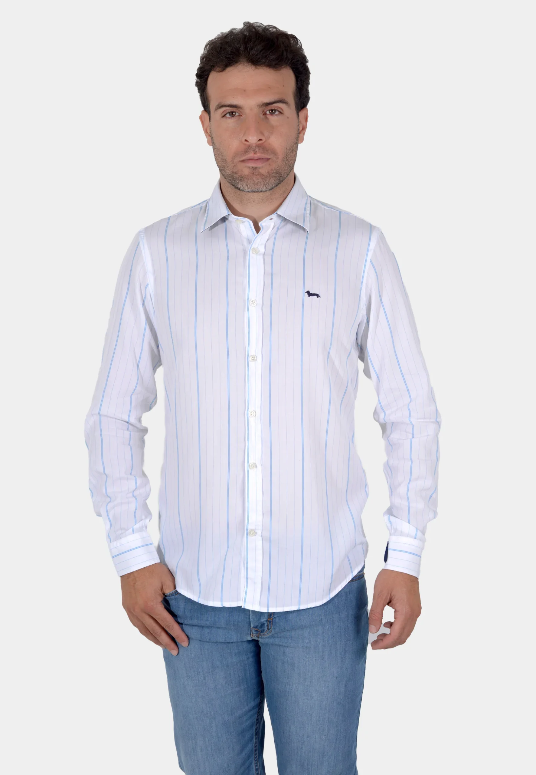 camisa de Harmont & Blaine, una pieza esencial para el hombre moderno. Confeccionada en algodón de alta calidad, destaca por su patrón de finas rayas verticales en tonos suaves sobre fondo blanco, lo que aporta frescura y elegancia. Su corte regular fit ofrece comodidad y libertad de movimiento, mientras que el icónico logo bordado en contraste en el pecho añade un toque distintivo de sofisticación.