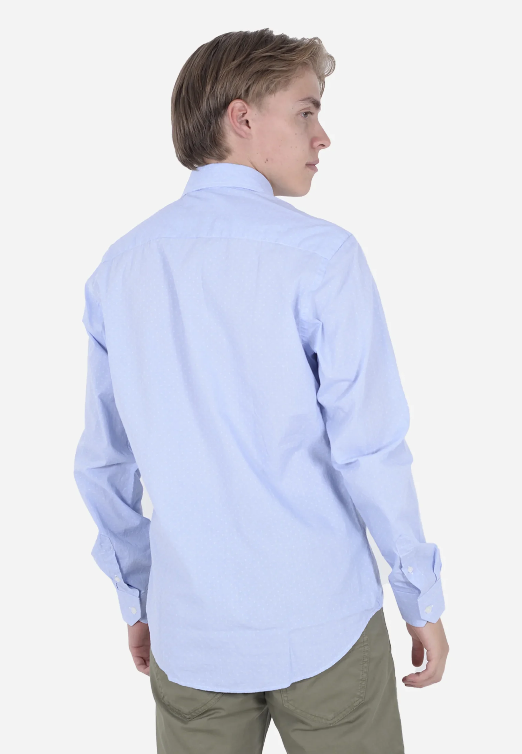 Camisa de hombre de manga larga en color celeste claro, confeccionada en algodón suave y transpirable para un ajuste cómodo durante todo el día. Diseñada con cuello clásico, cierre de botones frontales y puños abotonados, ofrece un estilo atemporal y versátil. Su corte regular fit la hace perfecta tanto para ocasiones formales como para looks casuales elegantes. El pequeño logotipo bordado en el pecho aporta un detalle distintivo sin perder sobriedad.