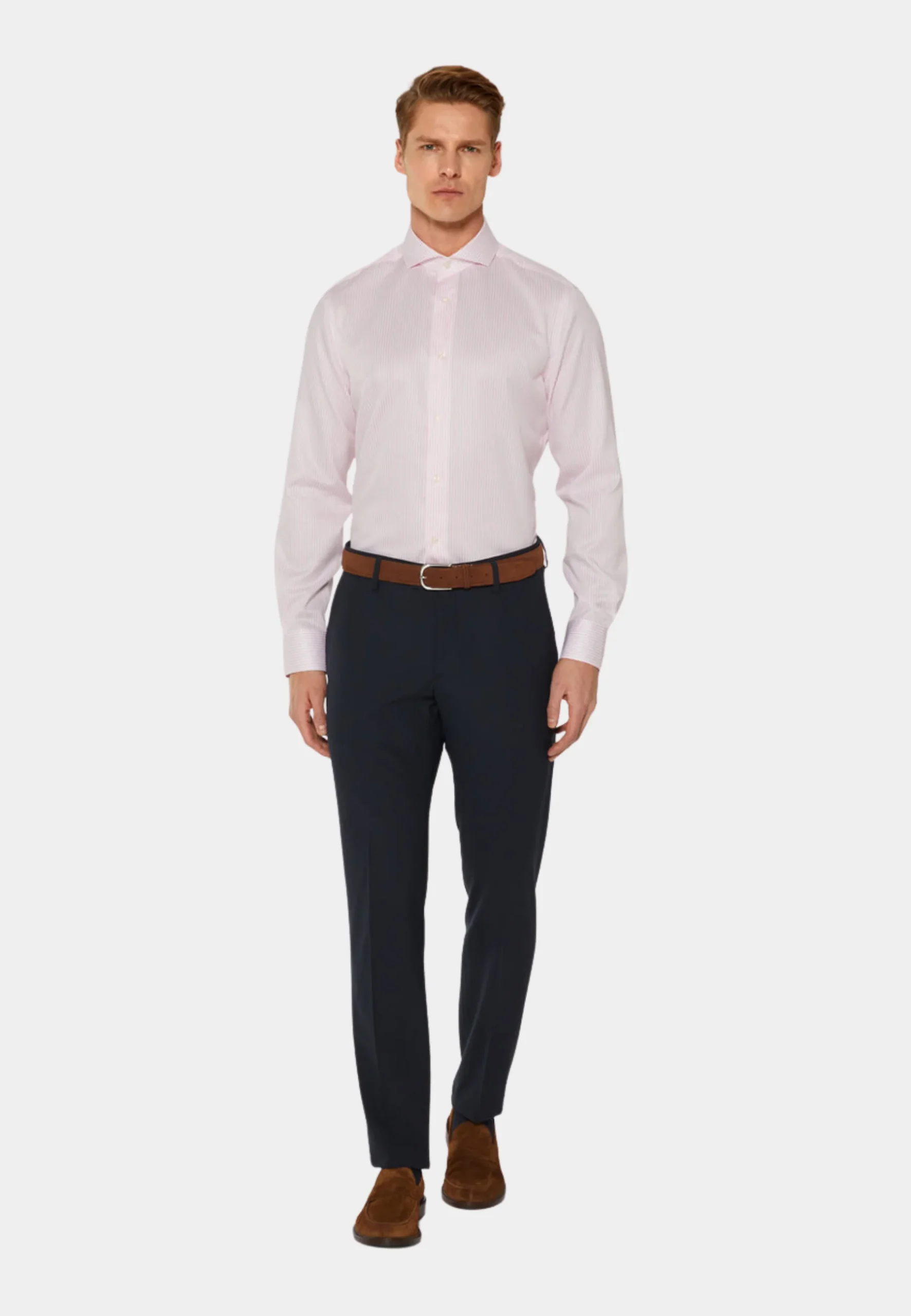 Su corte slim fit garantiza una silueta moderna y pulcra, ideal para llevar tanto con traje como con chinos y blazers informales. El cuello abotonado asegura que se mantenga perfecta sin corbata.