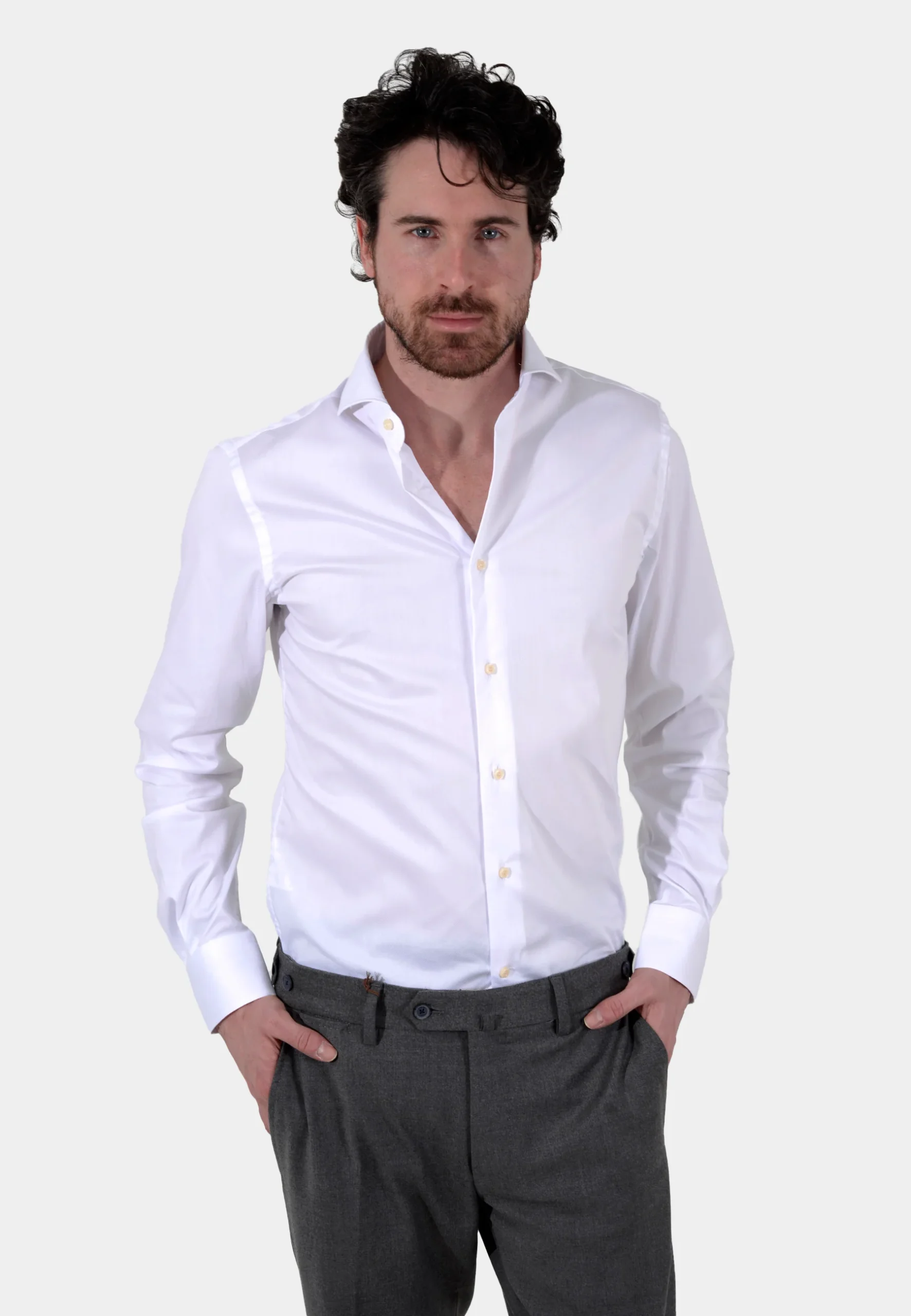 Camisa de Vestir Blanca Esencial. Algodón de alta calidad con cuello clásico y corte impecable. La base perfecta para cualquier traje o look de negocios. Pieza overshirt de tejido grueso con botones y bolsillos de parche. Ideal para layering (look por capas) en climas frescos. detalle de contraste en cuello y puños interiores.