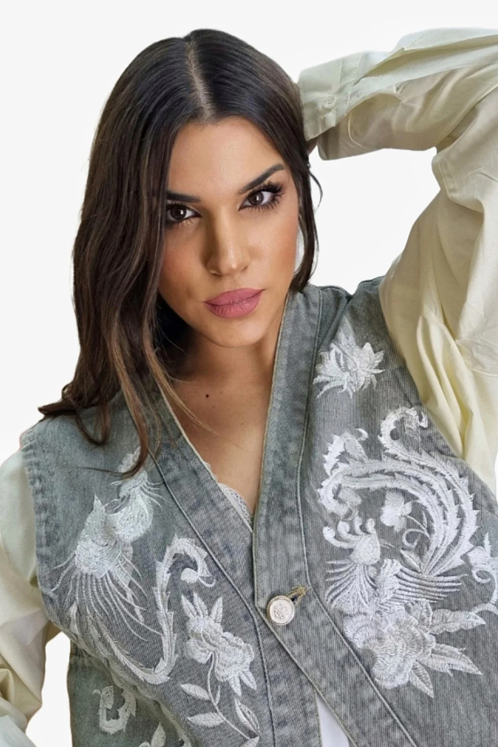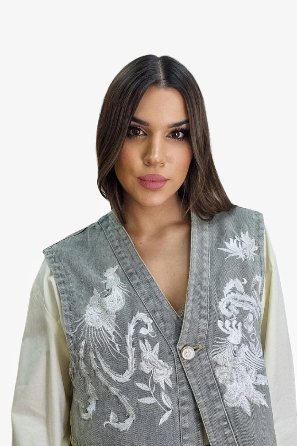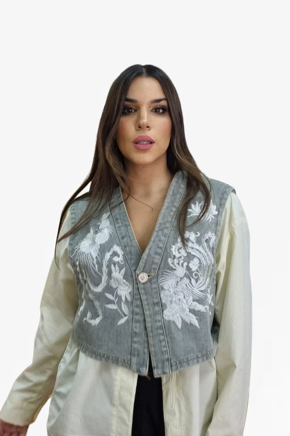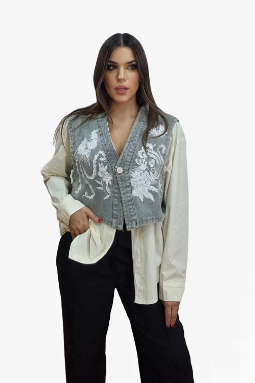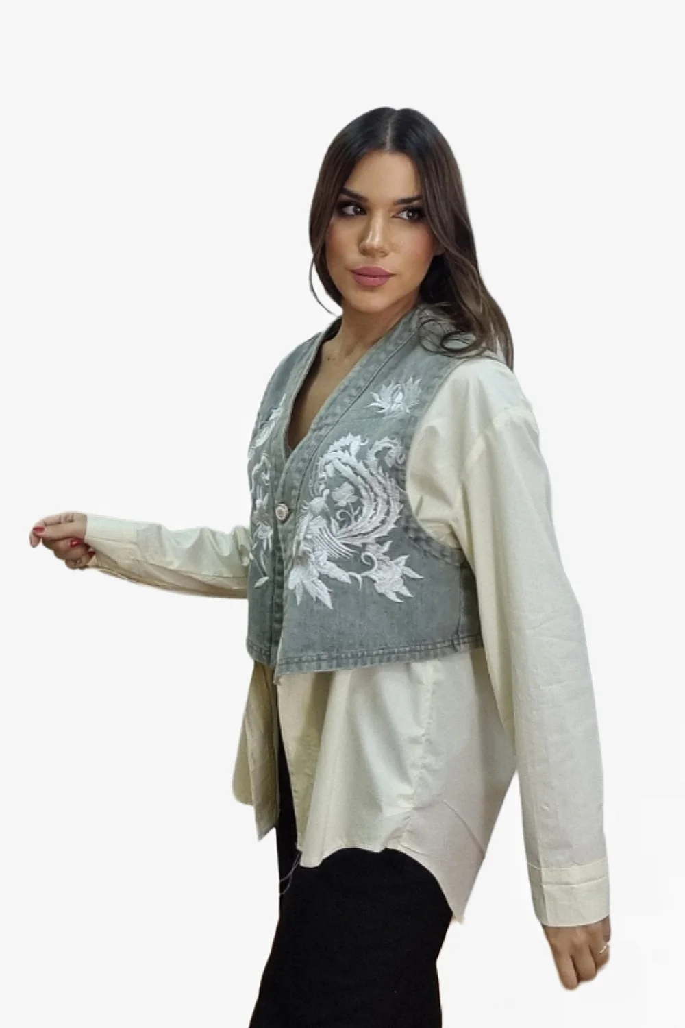 Camisa sin botones de manga larga, con chaleco abotonado por un botón, con decoración de flores en hilo blanco. Se pueden poner sueltos.