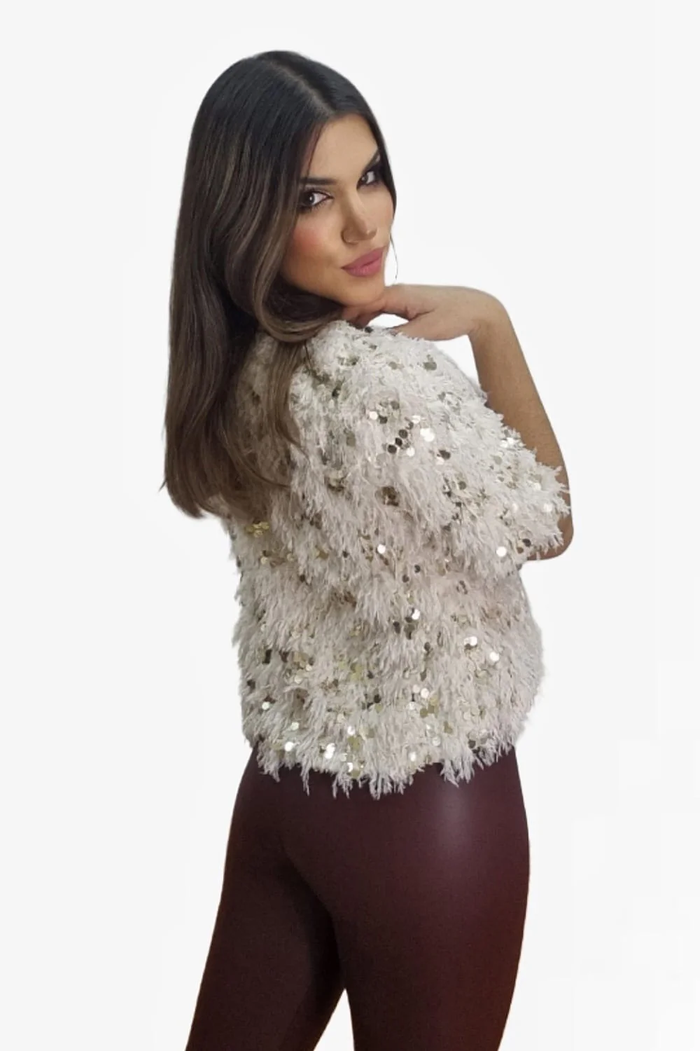 Camisa con flecos y lentejuelas, cuello redondo.