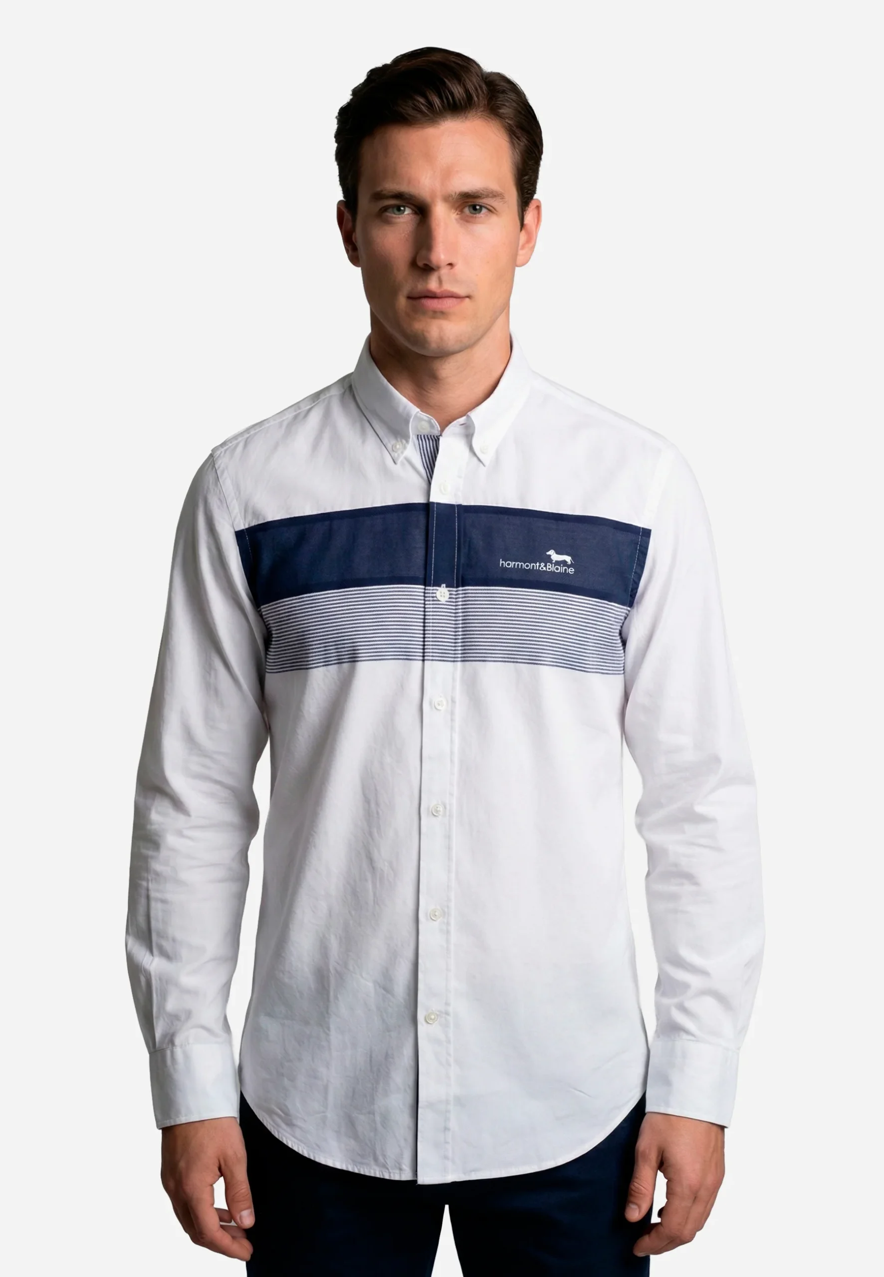 camisa de hombre Harmont & Blaine combina estilo contemporáneo y comodidad absoluta. Confeccionada en 100% algodón y diseñada con un corte regular, ofrece una sensación ligera y una silueta clásica que se adapta con naturalidad al movimiento, Su diseño destaca por las bandas horizontales a contraste ubicadas en el pecho: una franja con un patrón de rayas dinámicas y otra en tono liso que incorpora el icónico perro teckel y la inscripción “Harmont & Blaine” finamente bordados, sello inconfundible de la marca italiana.El cuello abotonado y el bajo redondeado aportan versatilidad, permitiendo llevarla tanto por dentro para un look más pulido como por fuera para un estilo casual sofisticado.