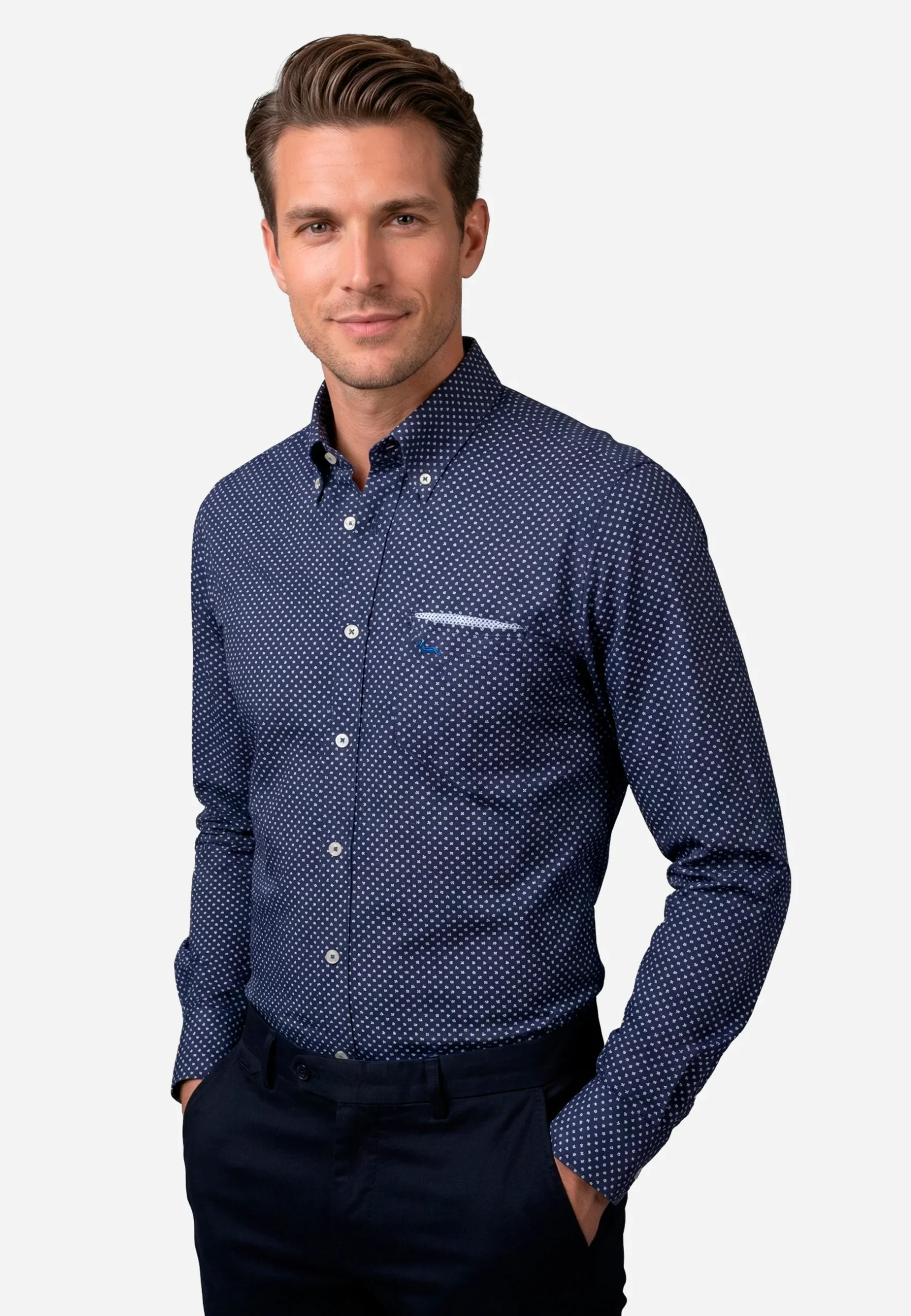 camisa de algodón presenta un elegante estampado de micro-puntos blancos sobre un fondo azul marino, aportando un toque moderno sin perder la sobriedad clásica. Su corte slim fit realza la silueta, ofreciendo un ajuste estilizado y cómodo para el uso diario. El diseño incorpora cuello abotonado, mangas largas y un práctico bolsillo en el pecho, detalles que equilibran funcionalidad y estilo. Confeccionada en algodón suave y transpirable, es perfecta para acompañarte desde la oficina hasta planes casuales.