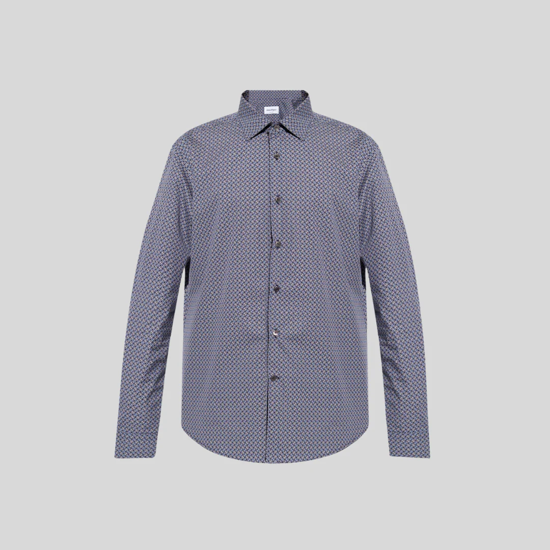 Camisa azul con estampado de gancini de salvatore ferragamo con cuello abierto, botones con estampado de gancini y mangas abotonadas