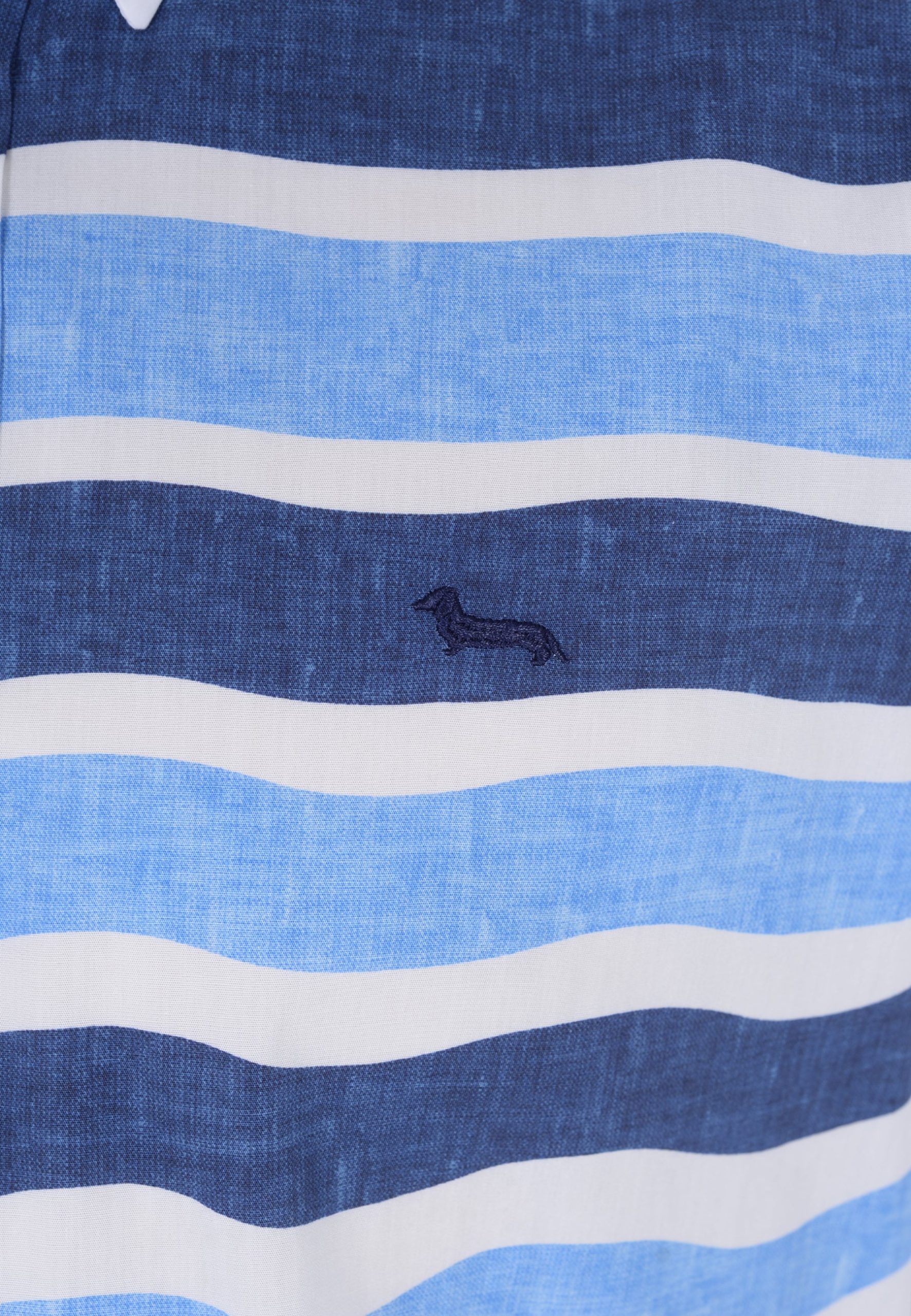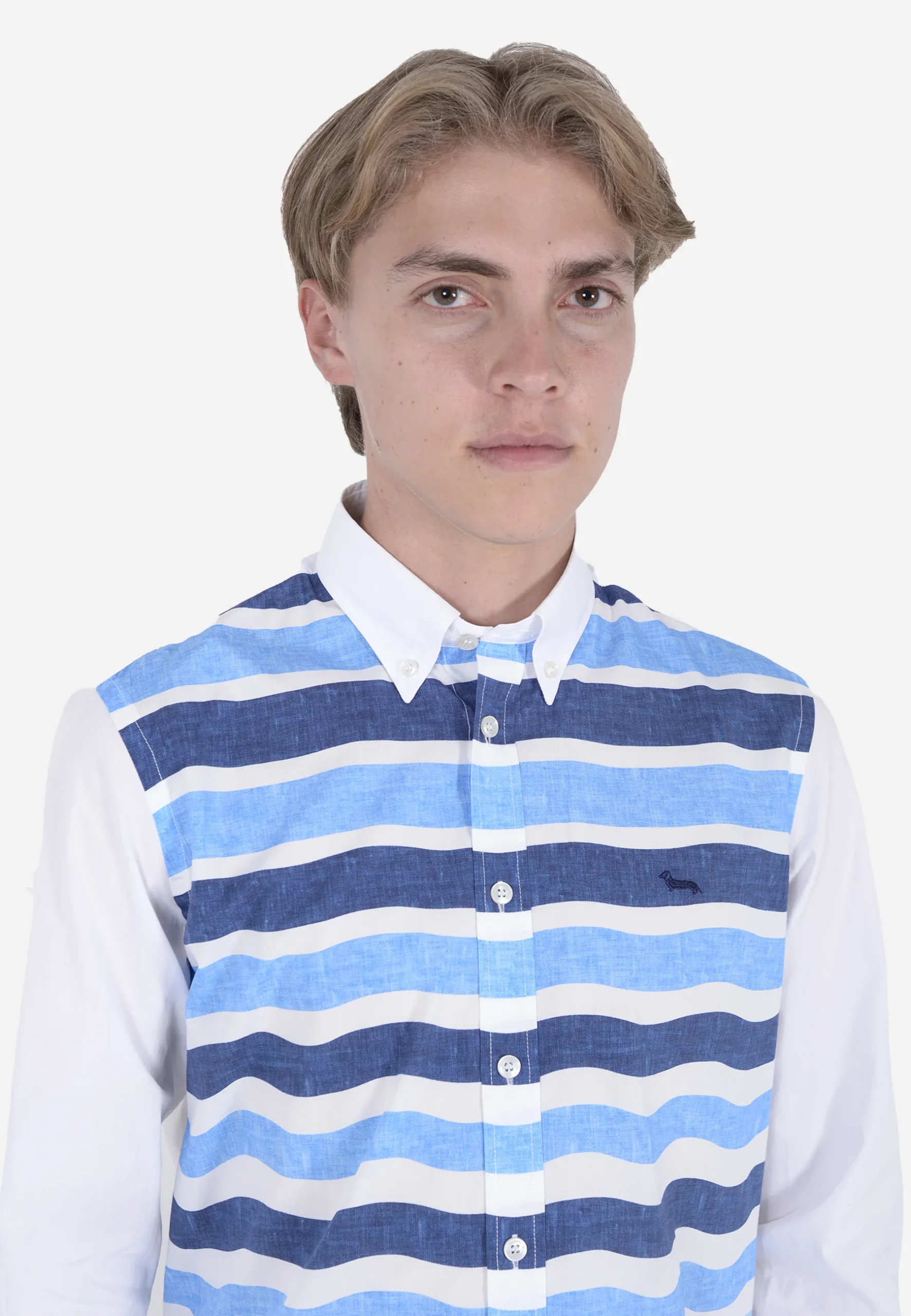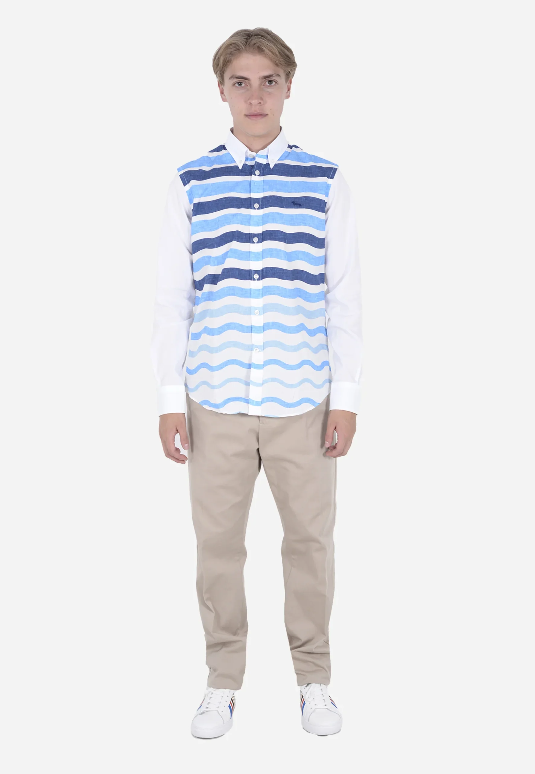camisa de manga larga, Su frente presenta un original estampado de ondas en tonos azules que contrastan con las mangas y la espalda en blanco puro. Confeccionada en algodón suave y transpirable, ofrece comodidad y estilo para ocasiones casuales o semi-formales. El cuello clásico y los botones frontales completan su diseño versátil, ideal para destacar en tu guardarropa.