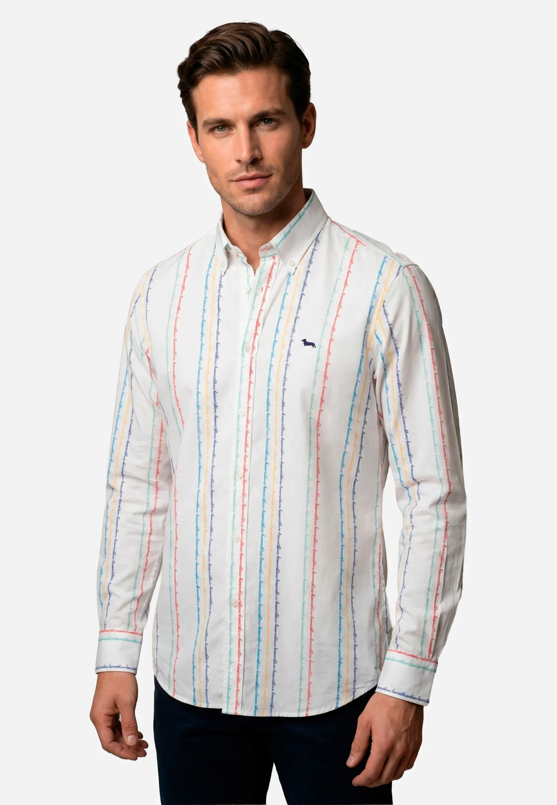 camisa de hombre Harmont & Blaine destaca por su elegancia contemporánea y su inconfundible sello italiano. Confeccionada en algodón premium, presenta un diseño en color blanco adornado con finas rayas verticales multicolores, aportando un toque fresco y dinámico sin perder la esencia clásica de la marca. El icónico logotipo del perro salchicha va bordado en el pecho, reafirmando su autenticidad y la atención al detalle propia de Harmont & Blaine. Su corte de sastrería garantiza comodidad, caída impecable y versatilidad, permitiendo llevarla tanto en looks formales con blazer como en outfits casuales con jeans o chinos.Una prenda refinada, ligera y perfectamente equilibrada entre estilo y funcionalidad: un esencial moderno para el hombre que aprecia la calidad y la distinción.