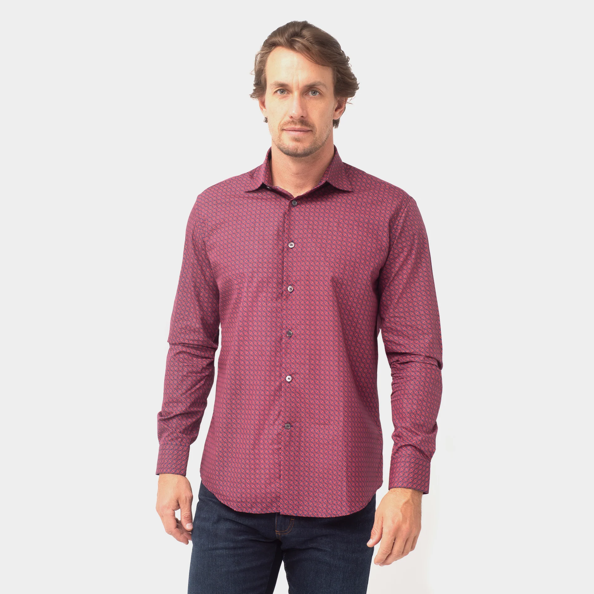 Camisa color vino con estampado de gancini de Salvatore ferragamo con cuello abierto, botones con estampado de gancinni y mangas abotonadas