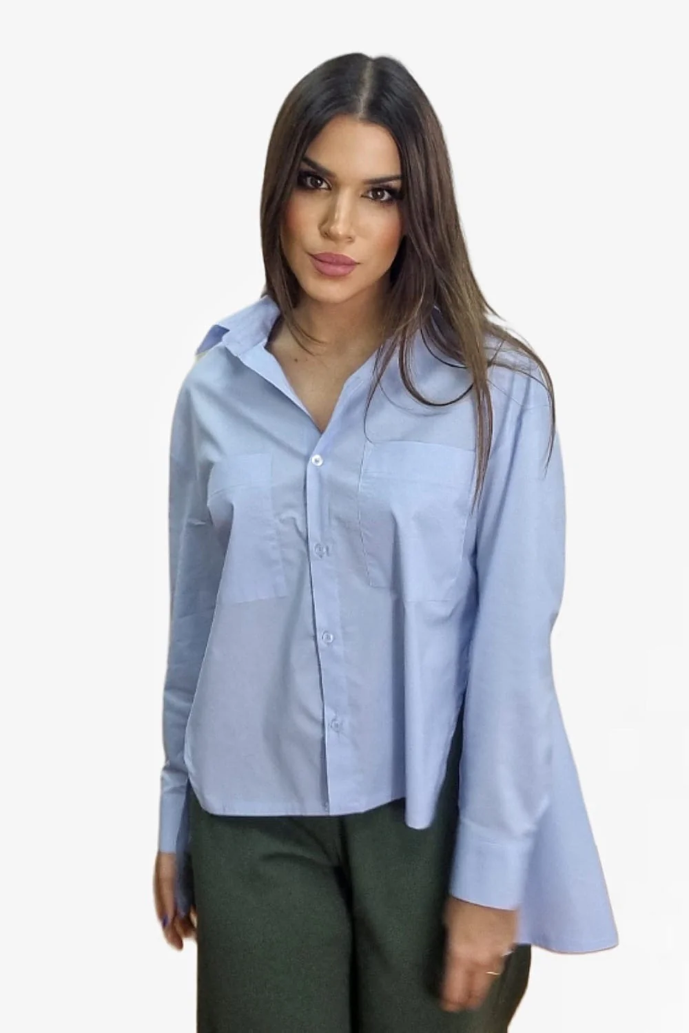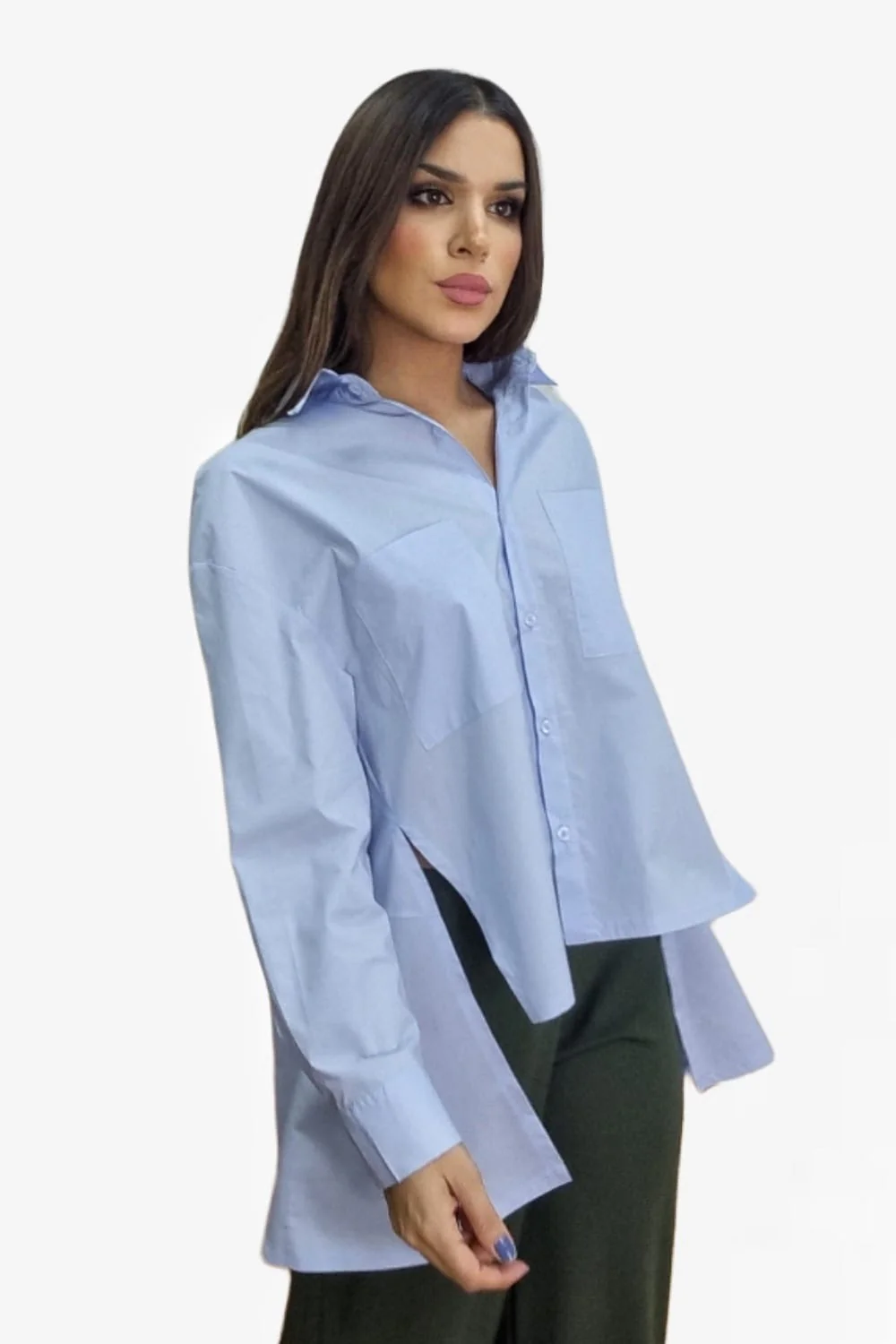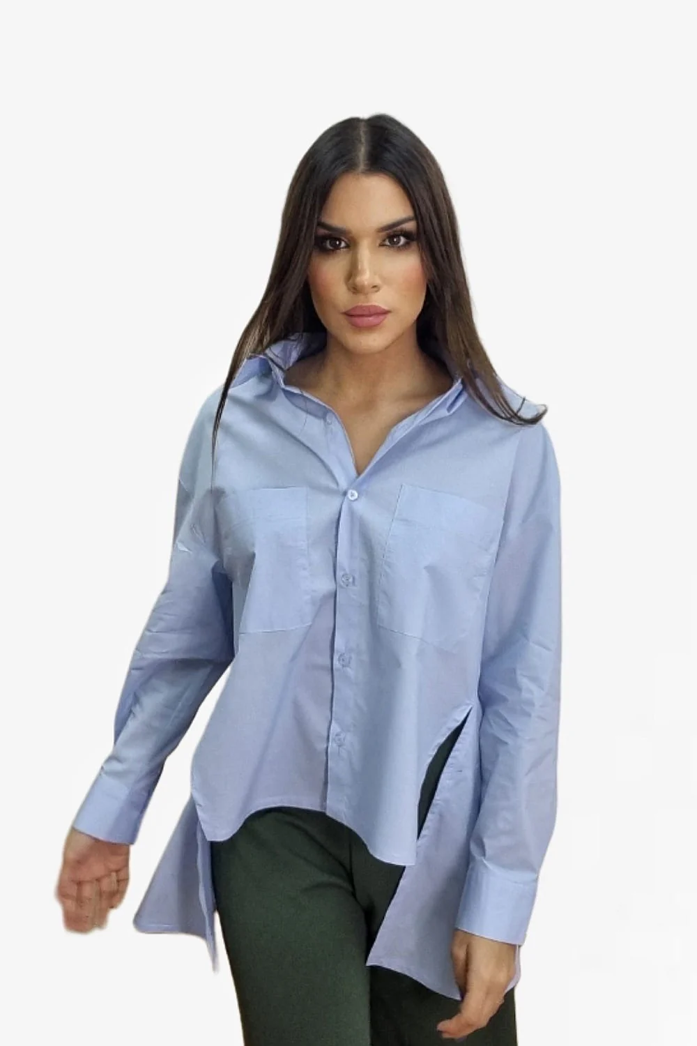Camisa de algodón oversize, corte asimétrico, con bolsillos delanteros y aperturas laterales.