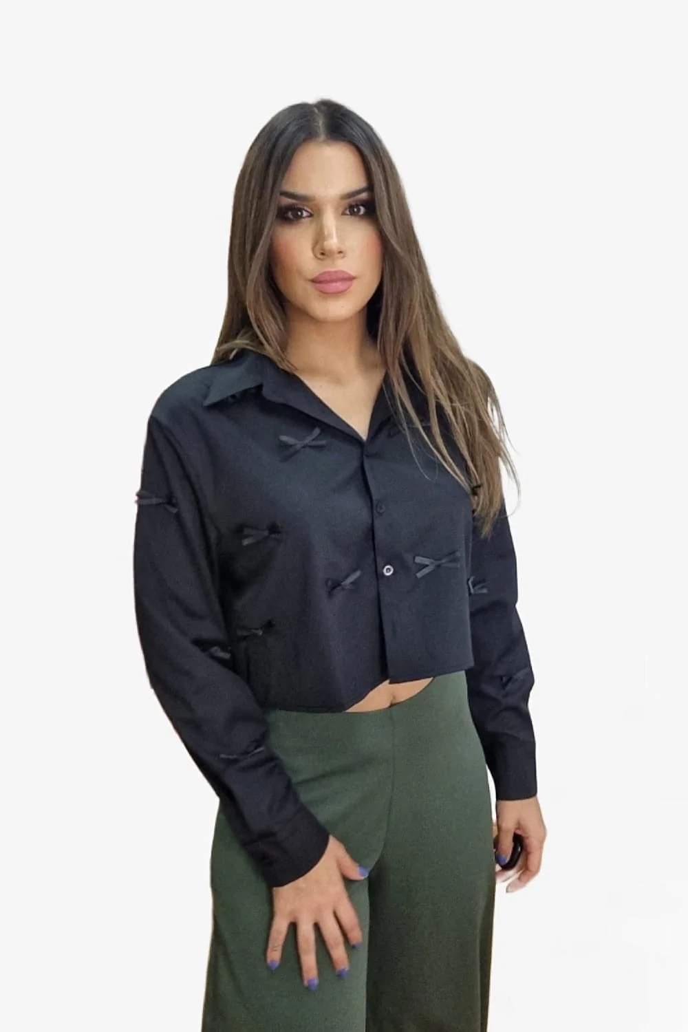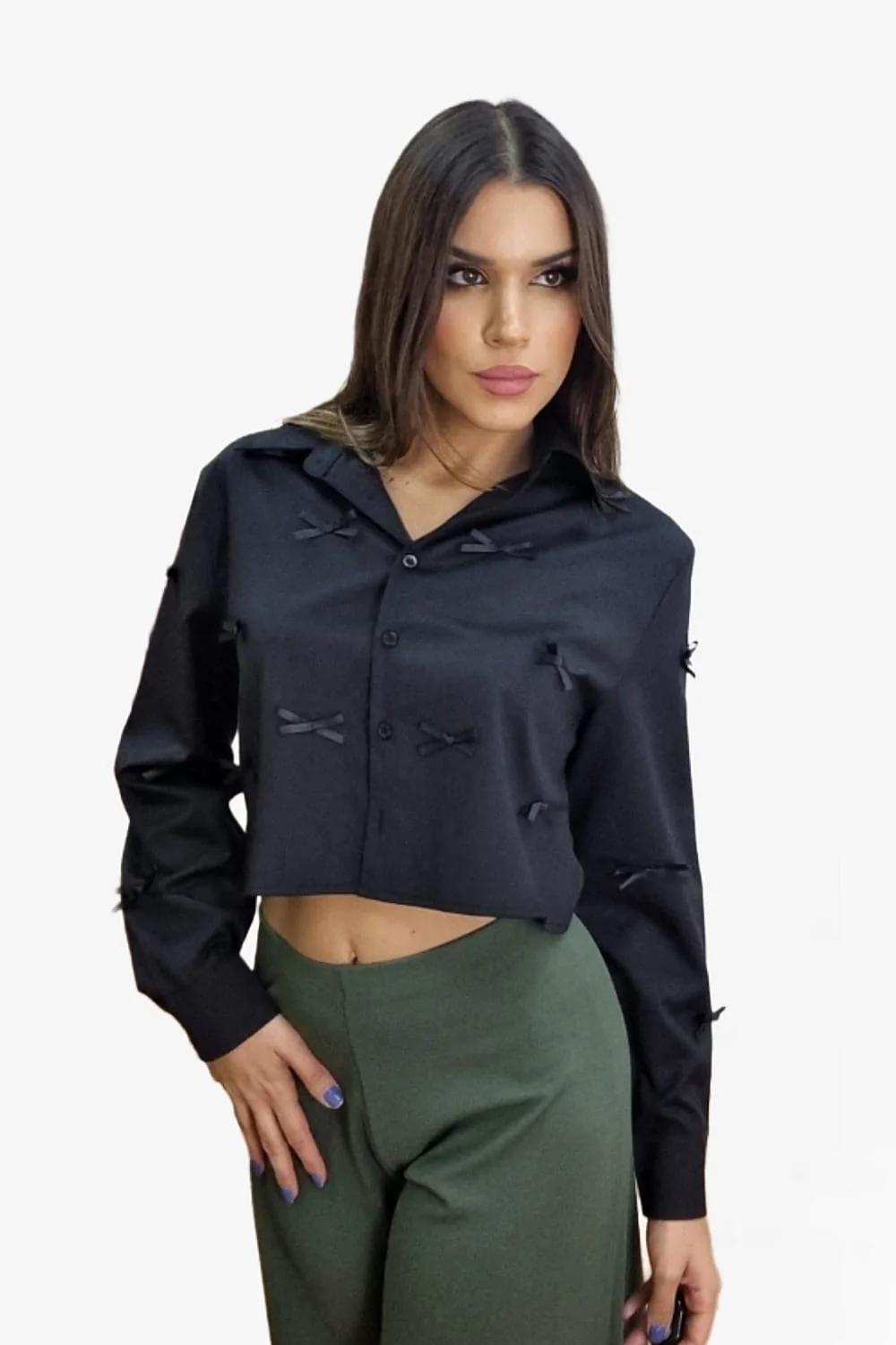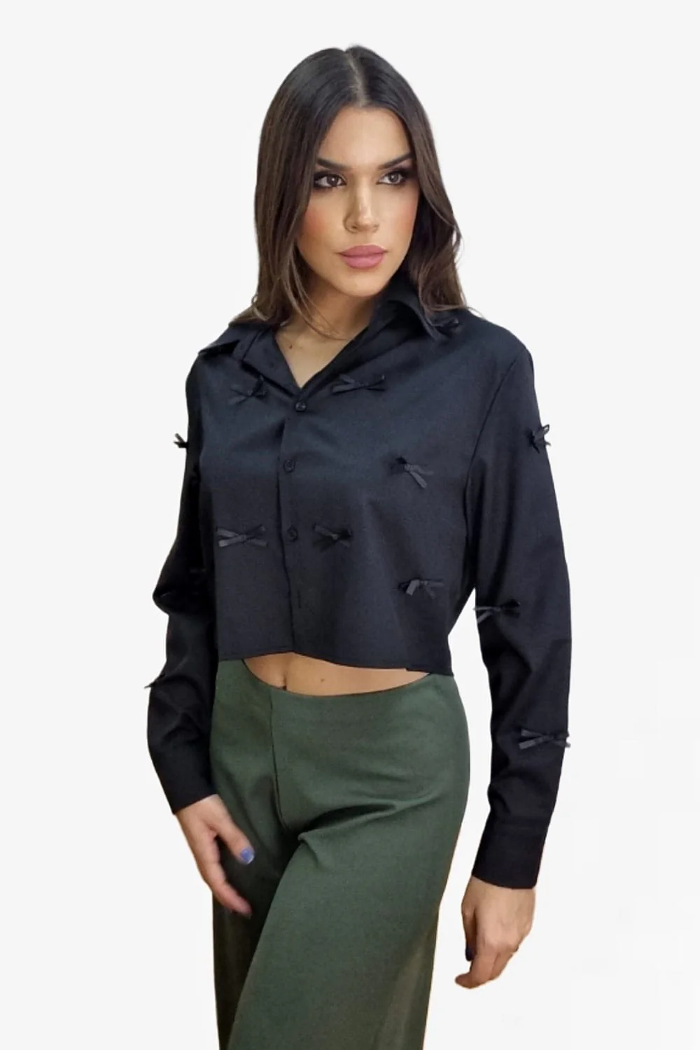 Camisa corta, abotonada y con lacitos delanteros.