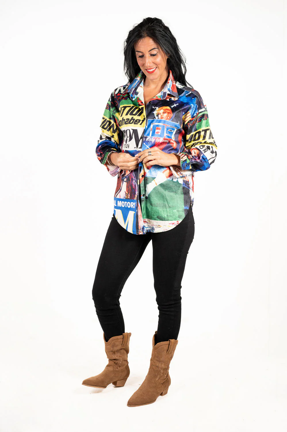 Camisa oversize, de corte recto, estampado inspirado en revistas culturales, con colores llamativos.