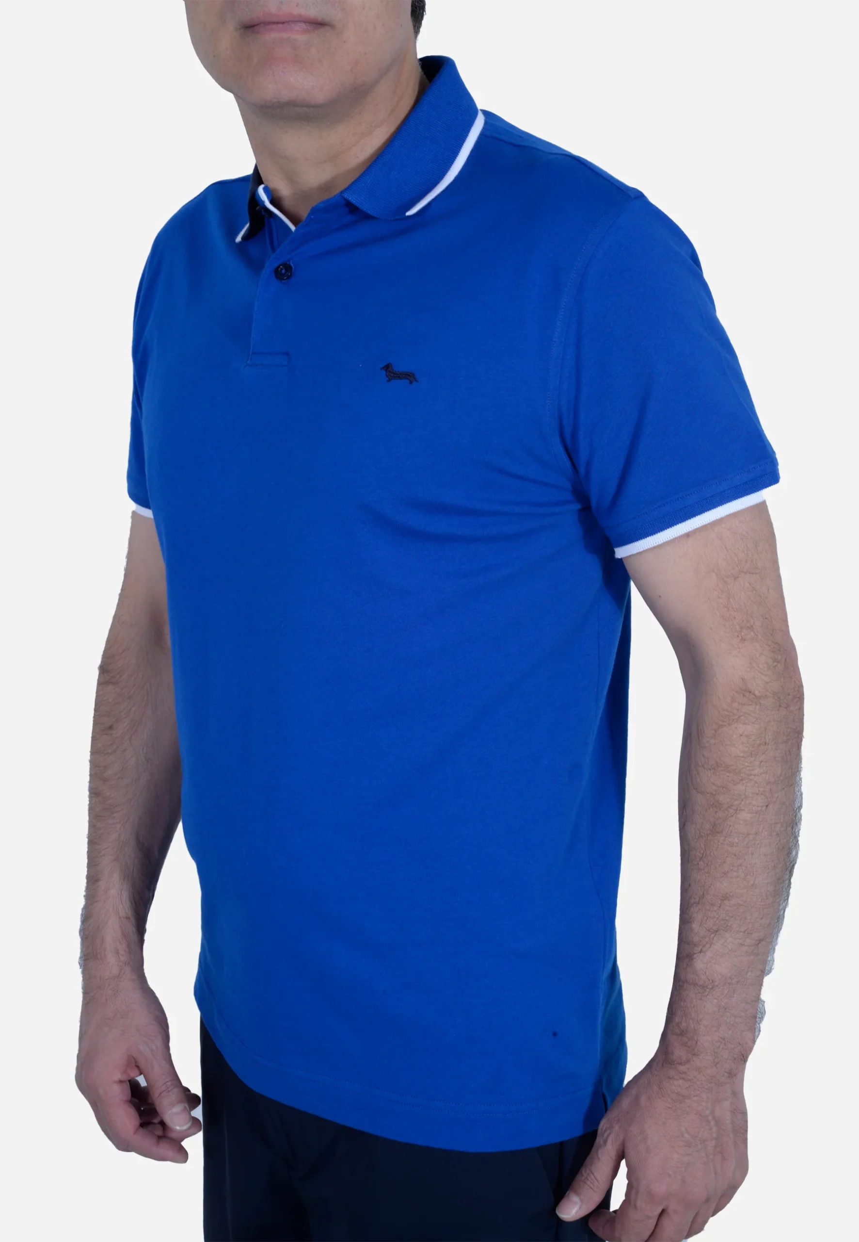 Camisa Polo HARMONT & BLAINE para hombre en azul marino clásico, Destaca por su cuello y puños con detalles en cuadros multicolor, que aportan un toque moderno sin perder la elegancia. Su silueta regular fit y el discreto logo bordado en el pecho lo convierten en una pieza versátil para uniformes corporativos, eventos empresariales o un look business casual refinado.