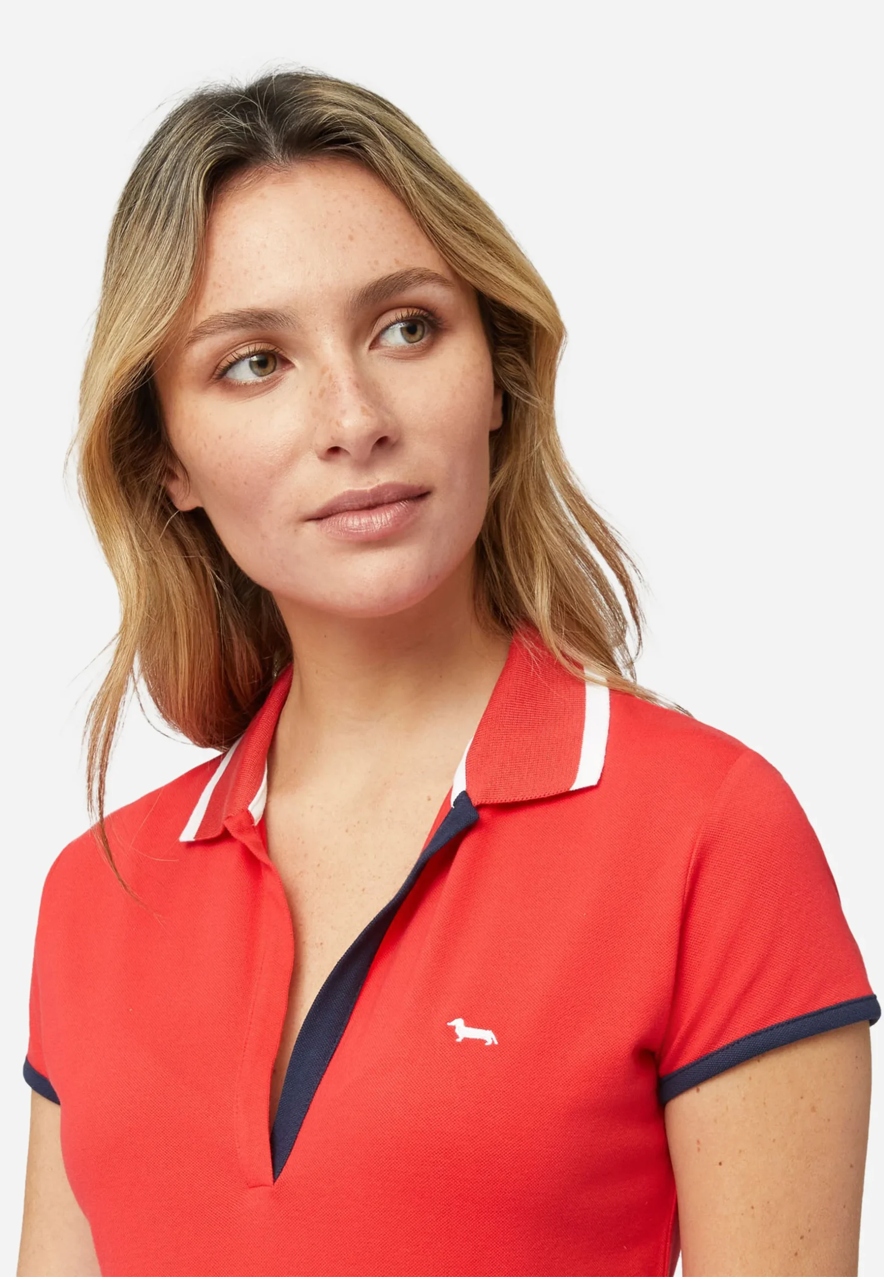 Polo femenino de manga corta, Su color rojo vibrante está realzado con detalles en blanco en el cuello y acabados en azul marino en el interior del cuello y mangas, aportando un contraste elegante y moderno. Incluye escote en V con solapa tipo polo y un discreto logotipo bordado en el pecho, ideal para uniformes corporativos, eventos empresariales o un look business casual sofisticado.