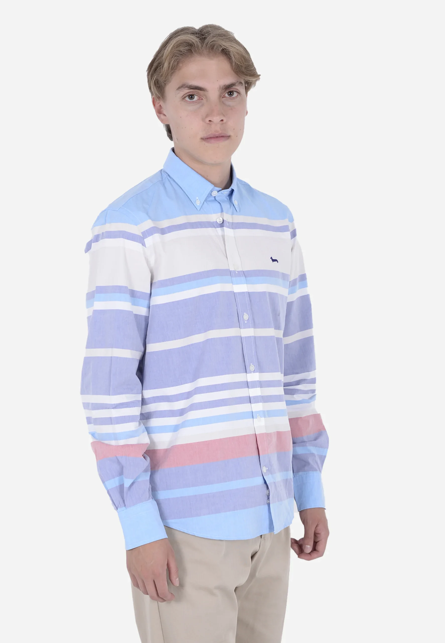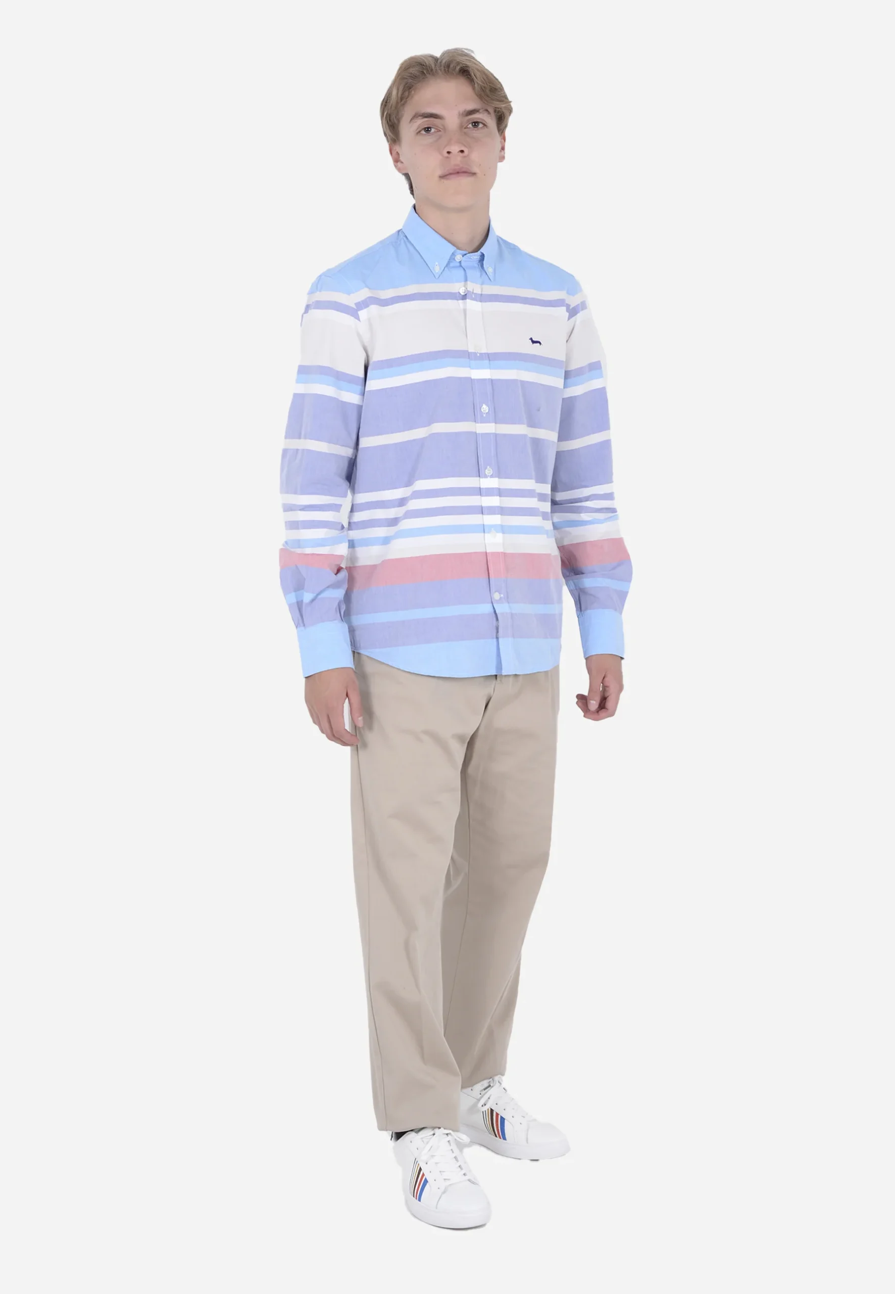 Camisa de hombre manga larga con diseño a rayas horizontales en tonos pastel (azul, blanco, lila y rosa), confeccionada en algodón suave y transpirable para un ajuste cómodo. Presenta cuello clásico abotonado, cierre de botones en la parte frontal y puños ajustables. Su estilo moderno y fresco la convierte en una prenda ideal para looks casuales con un toque de personalidad y elegancia.