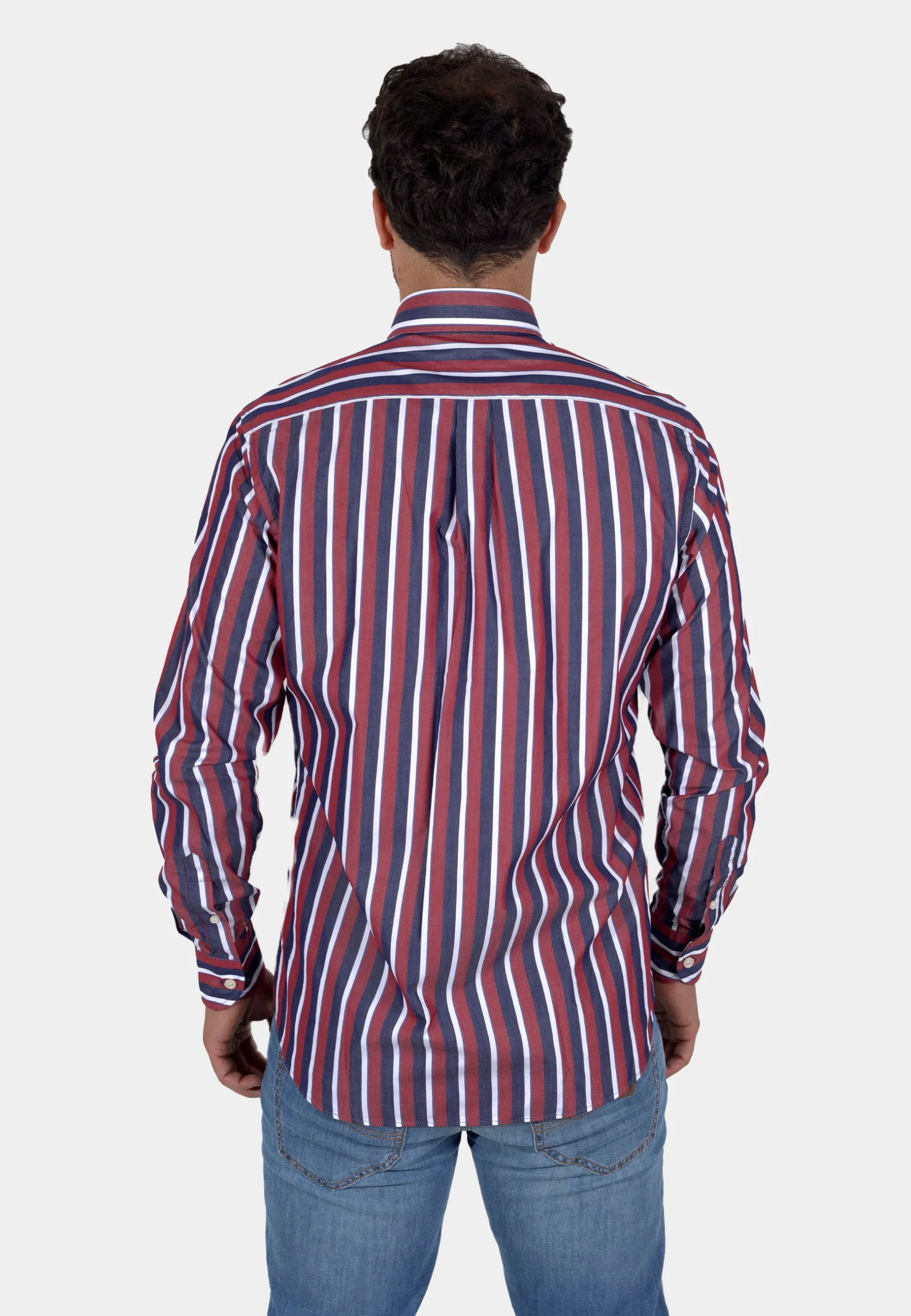 La camisa que irradia confianza y estilo atemporal. El diseño presenta un patrón de rayas verticales anchas que combinan el azul marino clásico y un vibrante rojo/bordó con delgadas líneas blancas, logrando un impacto visual sofisticado. Esta combinación de colores icónica la convierte en una pieza versátil y llamativa. Diseñada para un corte cómodo (regular fit) que se adapta a cualquier cuerpo, está confeccionada en un tejido de calidad que mantiene su estructura. El cuello button-down, un sello de estilo casual y pulcro, junto con el logo bordado en el pecho, aseguran un acabado premium.