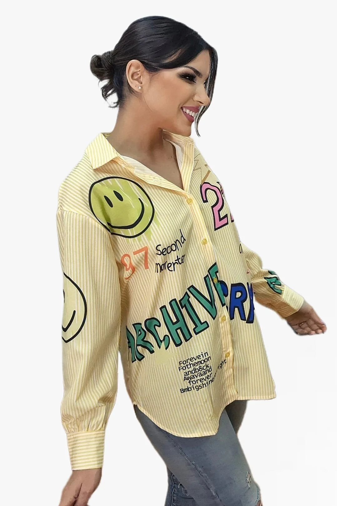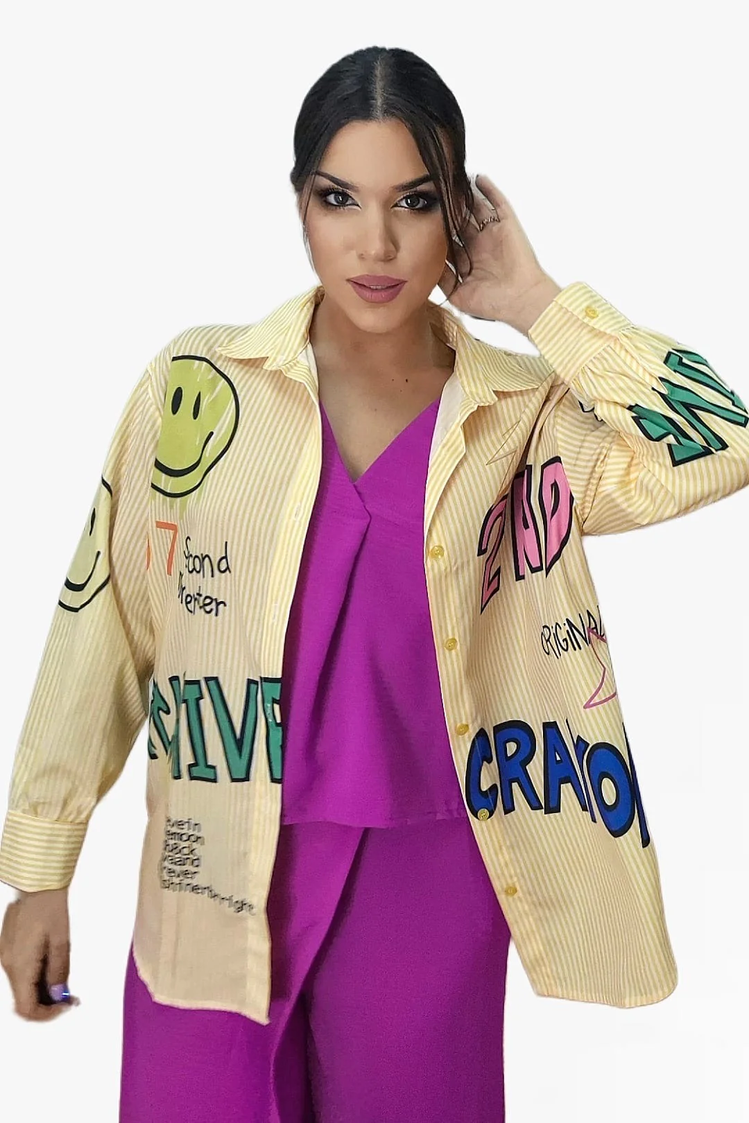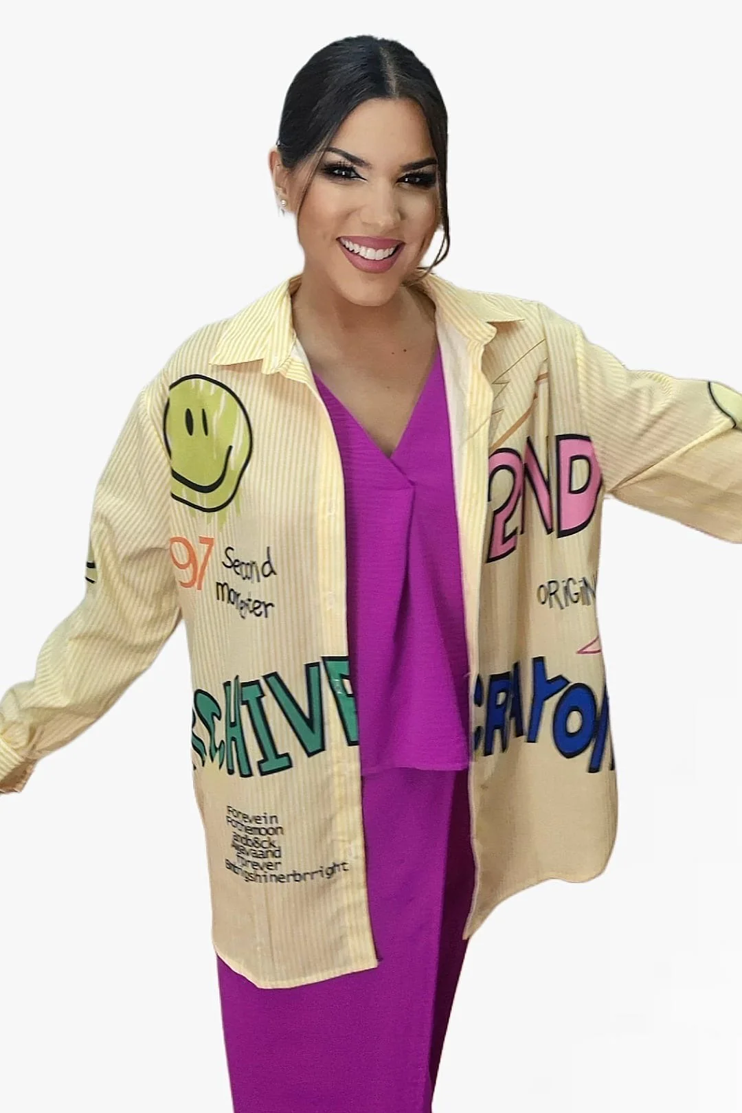Con su estampado lleno de mensajes, dibujos y emojis, esta camisa es puro buen rollo. Disponible en rosa, azul y amarillo, tiene un diseño de rayas finas con ilustraciones tipo cómic que la hacen original y divertida. Su corte camisero clásico con ese toque creativo la convierte en la prenda perfecta para destacar sin esfuerzo.