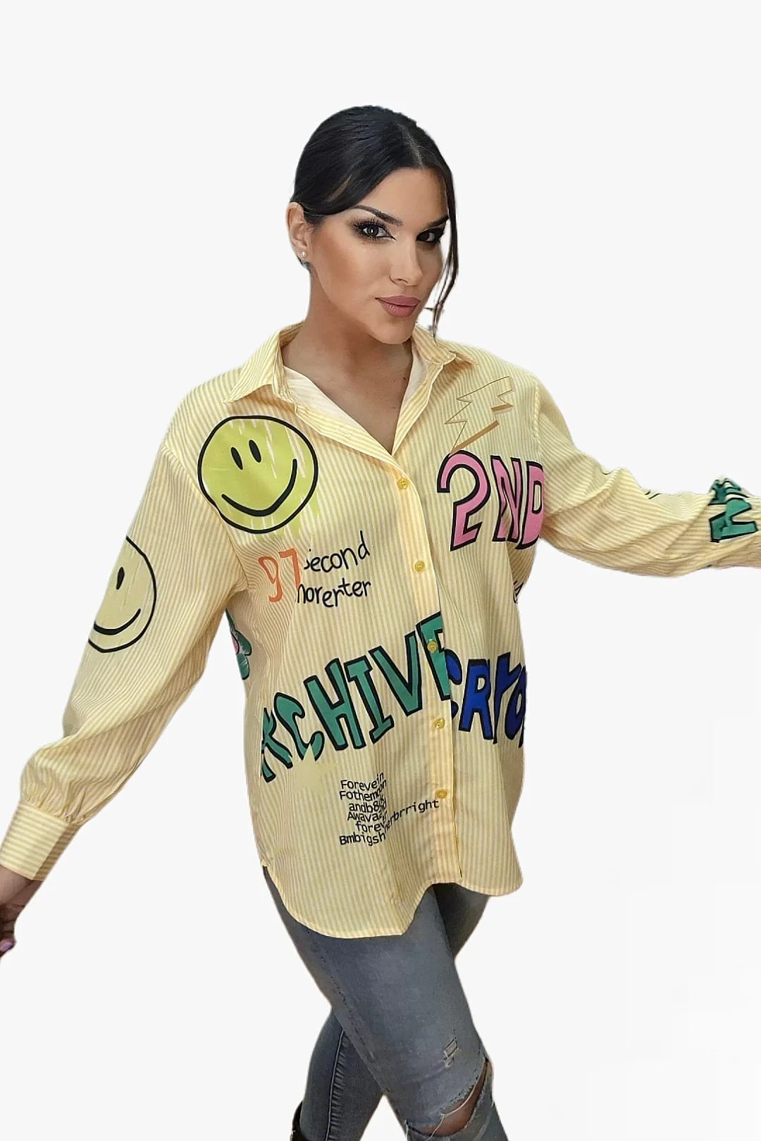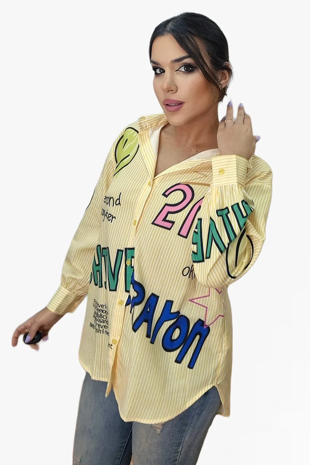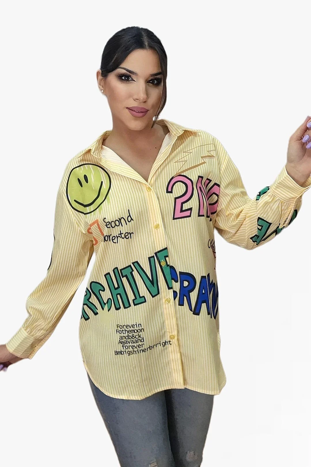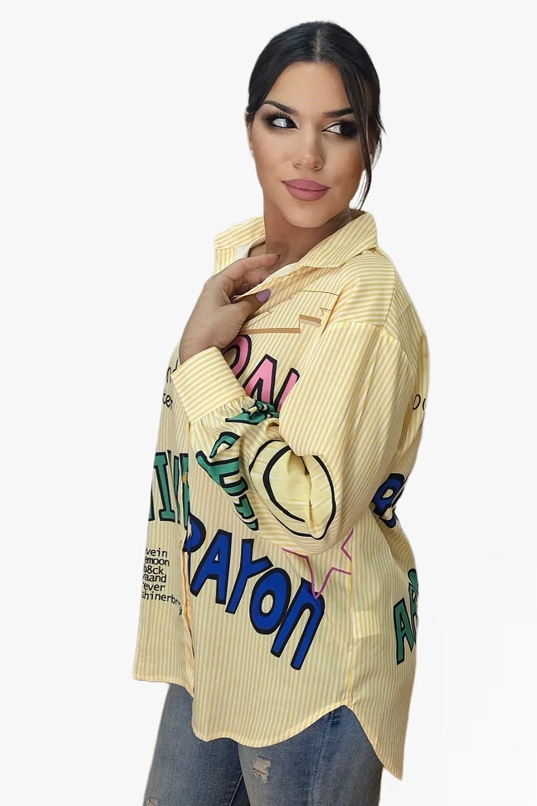 Con su estampado lleno de mensajes, dibujos y emojis, esta camisa es puro buen rollo. Disponible en rosa, azul y amarillo, tiene un diseño de rayas finas con ilustraciones tipo cómic que la hacen original y divertida. Su corte camisero clásico con ese toque creativo la convierte en la prenda perfecta para destacar sin esfuerzo.