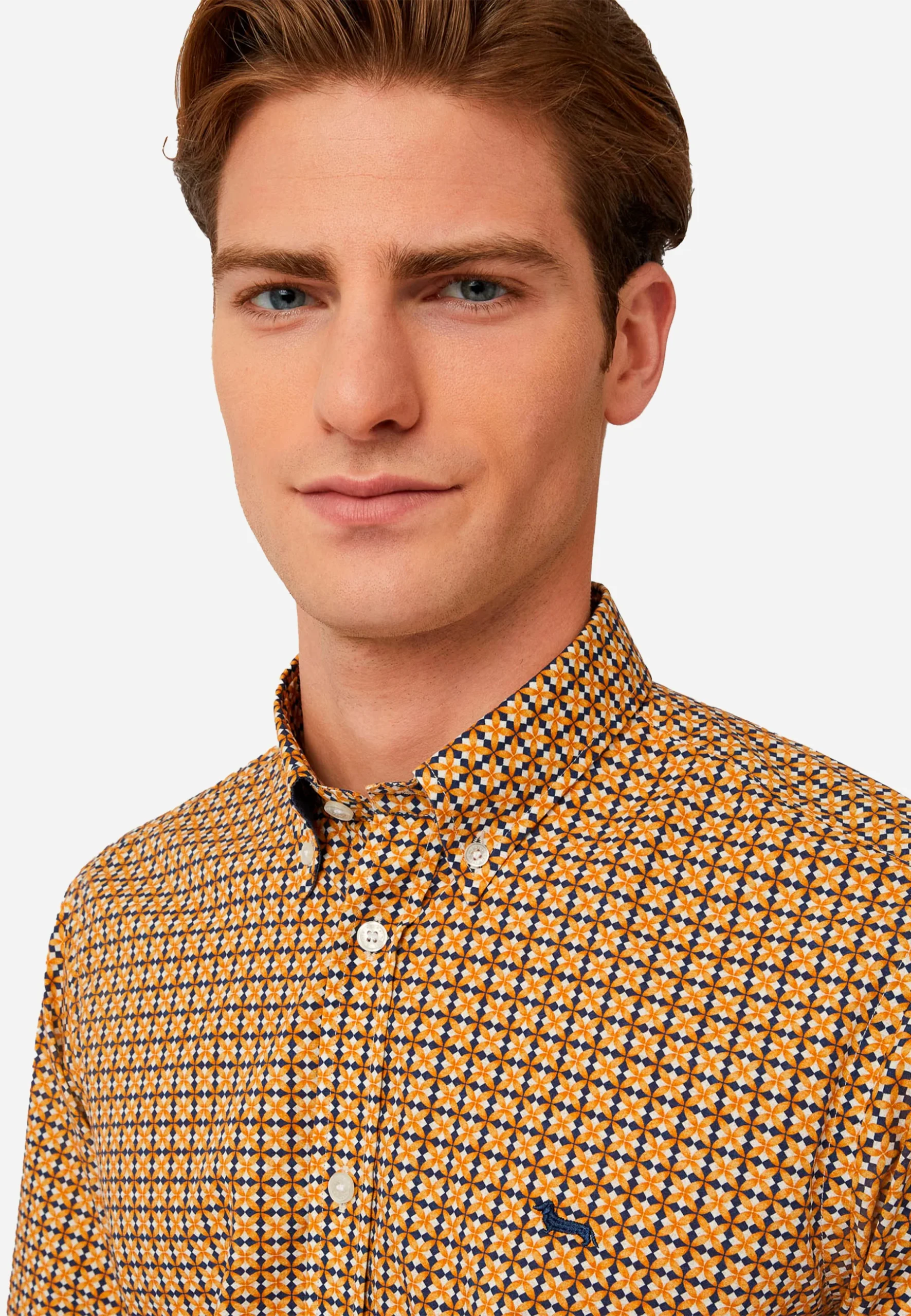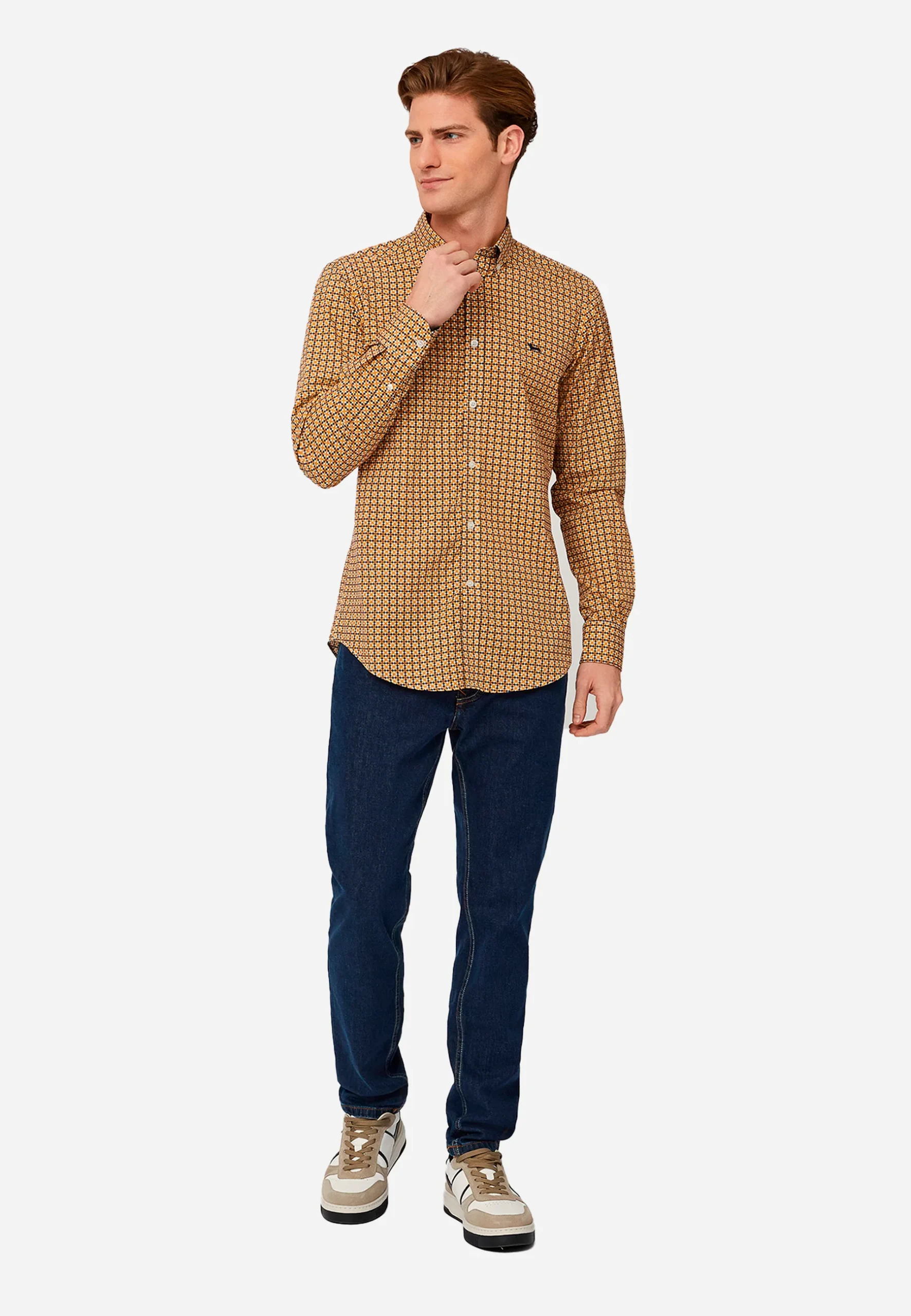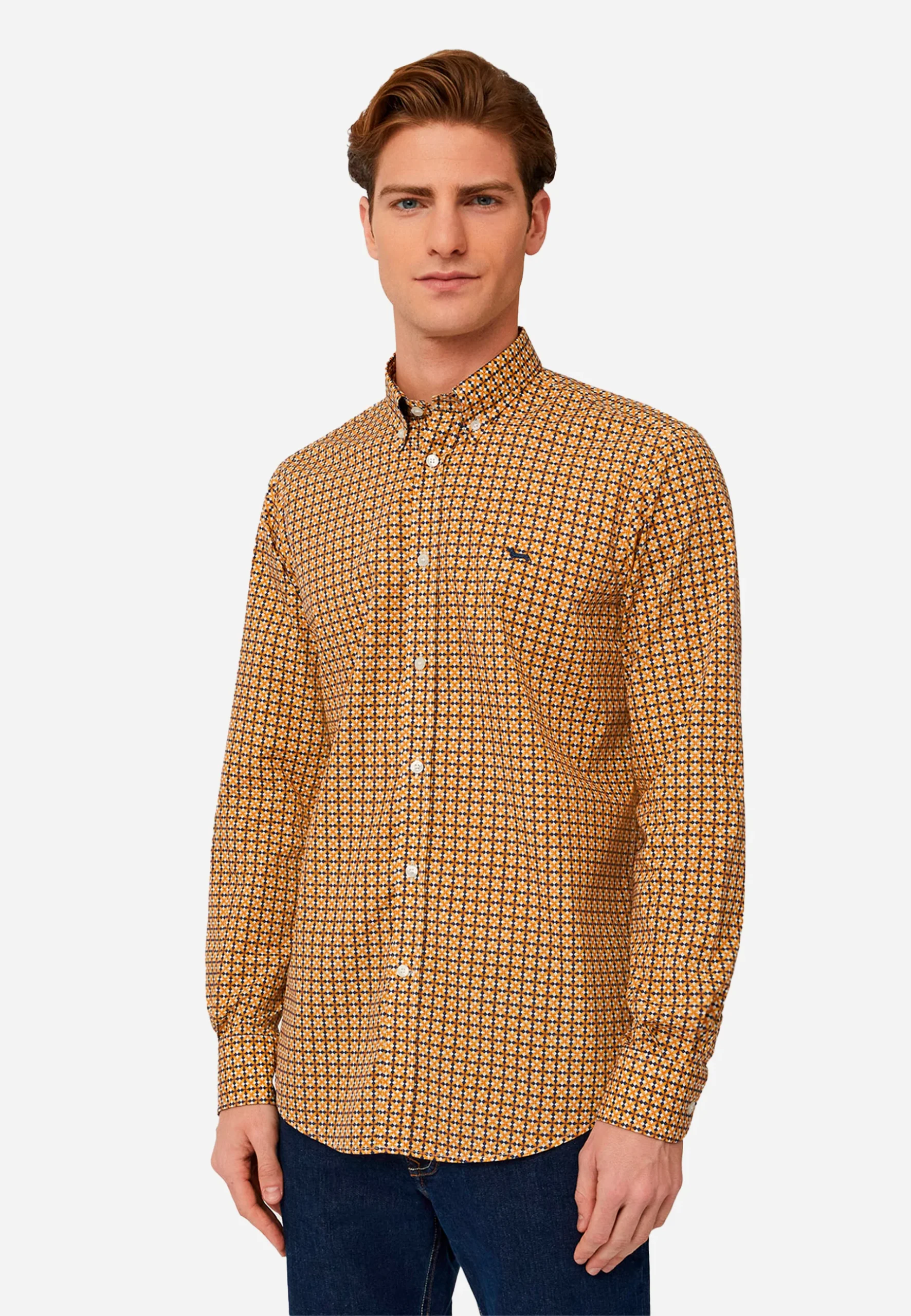 Camisa de hombre de manga larga con diseño geométrico en tonos mostaza y negro. Confeccionada en tela ligera y cómoda, ideal para un look casual o semi-formal. Cuenta con cuello tipo botón-down y cierre frontal con botones, ofreciendo un estilo moderno y versátil. Perfecta para combinar con jeans o pantalones de vestir para cualquier ocasión.