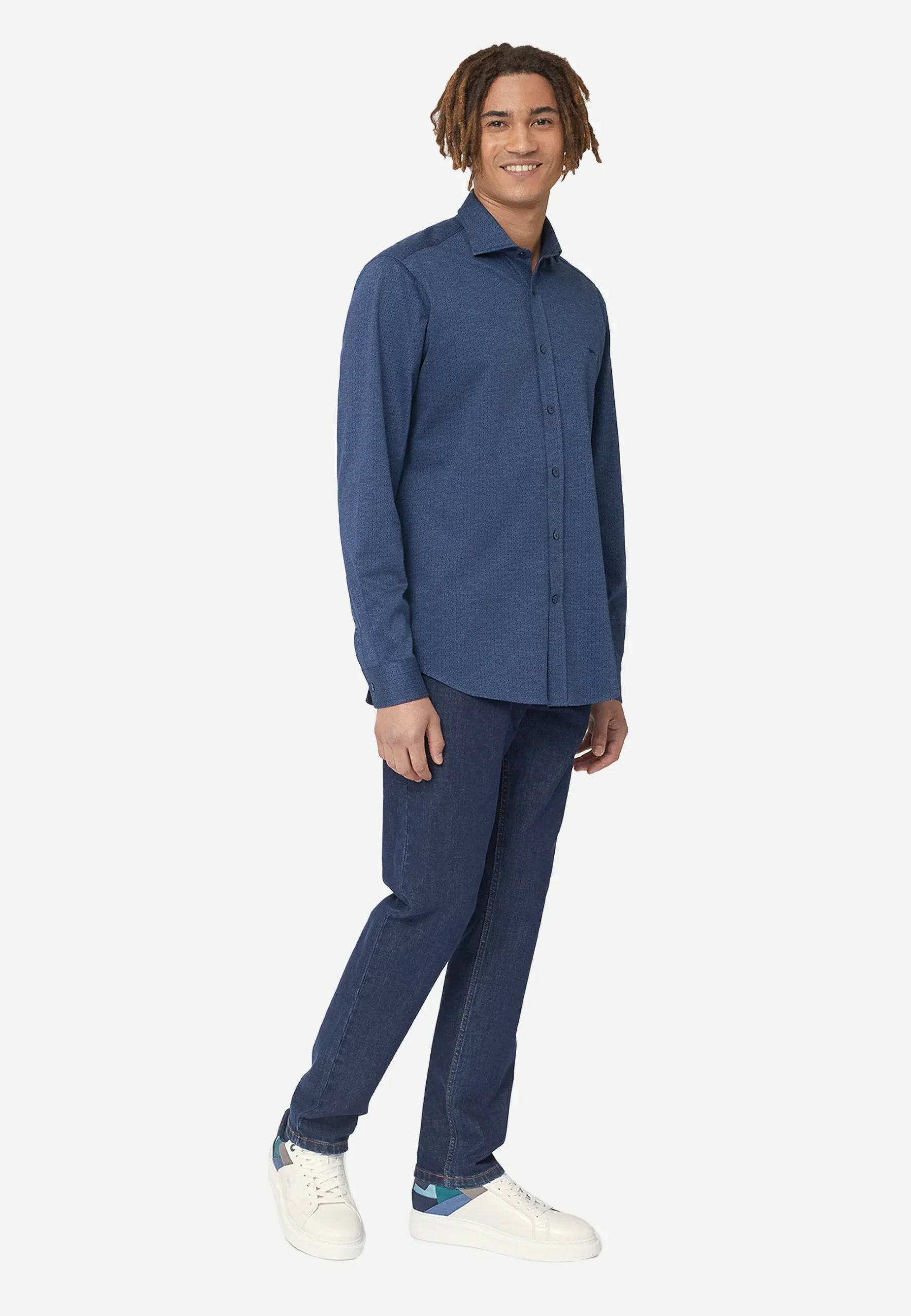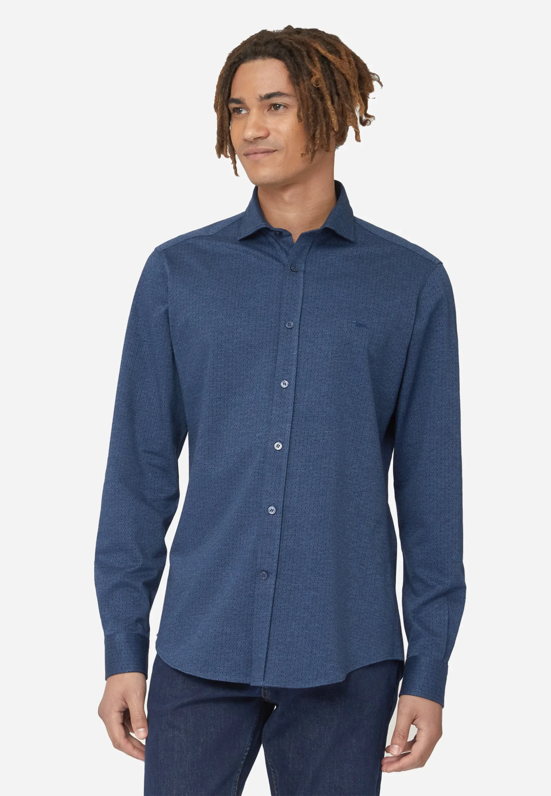 Camisa de manga larga confeccionada en denim azul de algodón, un básico atemporal que combina comodidad y estilo. Presenta cuello abotonado, cierre frontal con botones y un corte regular fit que se adapta a diferentes ocasiones. El discreto logotipo bordado en el pecho añade un detalle distintivo sin perder sobriedad. Una prenda versátil, ideal para llevar sola o en capas, perfecta para crear looks casuales con un toque sofisticado.