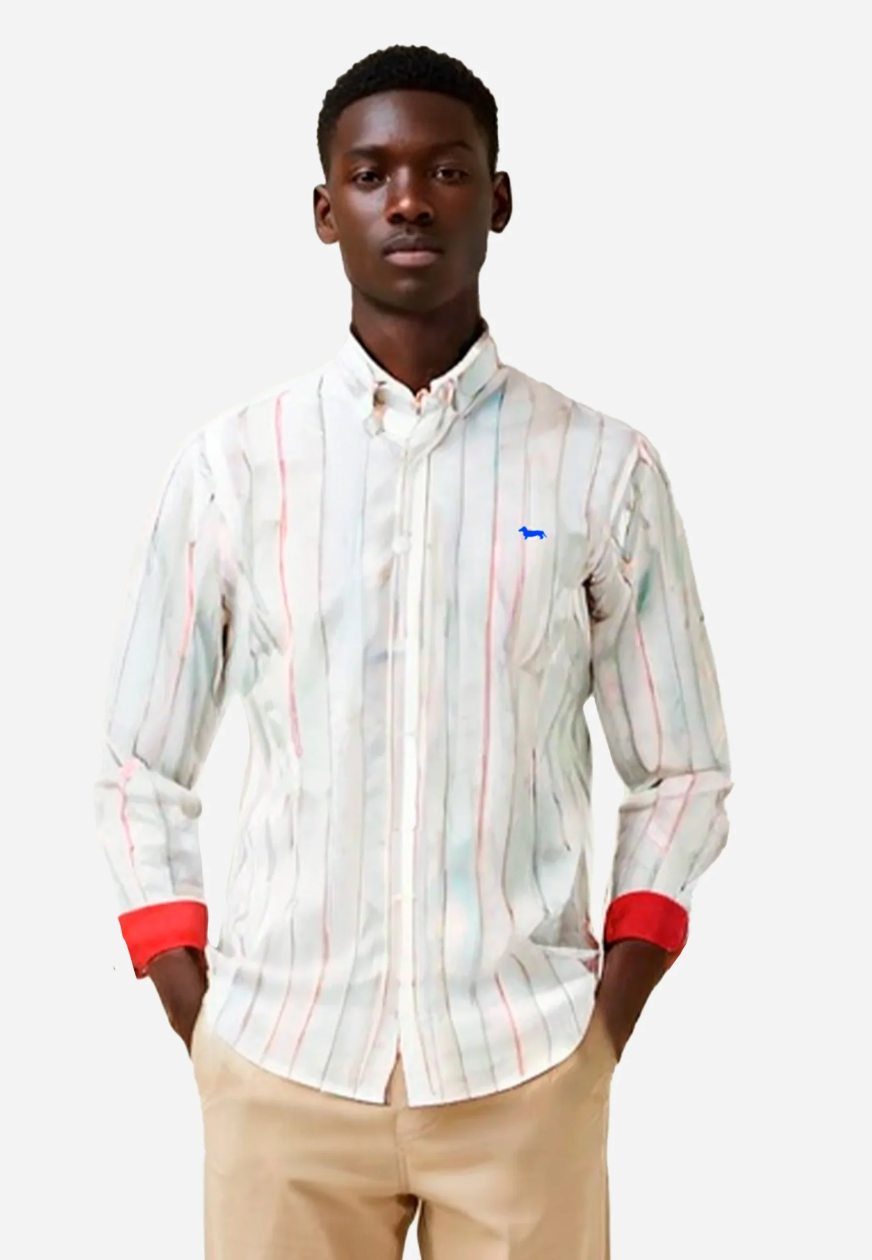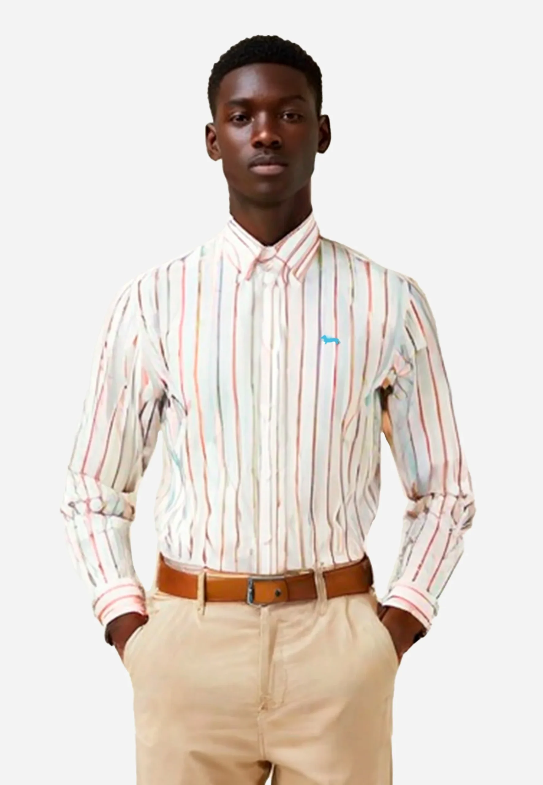 «Camisa de hombre de manga larga, estilo elegante y moderno. Con diseño de rayas verticales multicolor sobre fondo blanco, ofrece un toque fresco y dinámico. Cuenta con cuello clásico, cierre frontal con botones y puños sencillos, perfecta para un look casual refinado o para combinar con pantalones de vestir. Ideal para ocasiones semi-formales o para darle un toque de estilo a tu atuendo diario.»