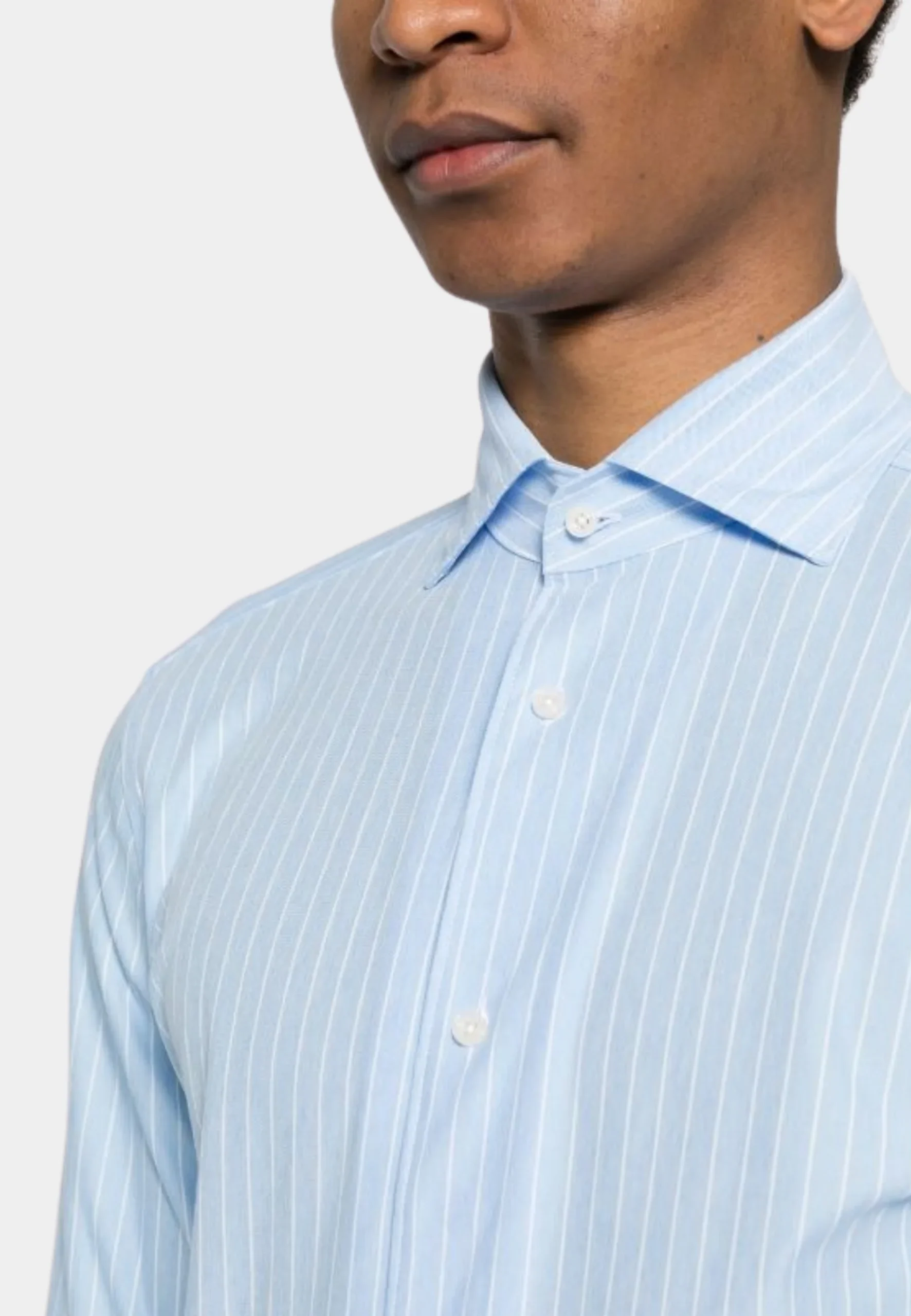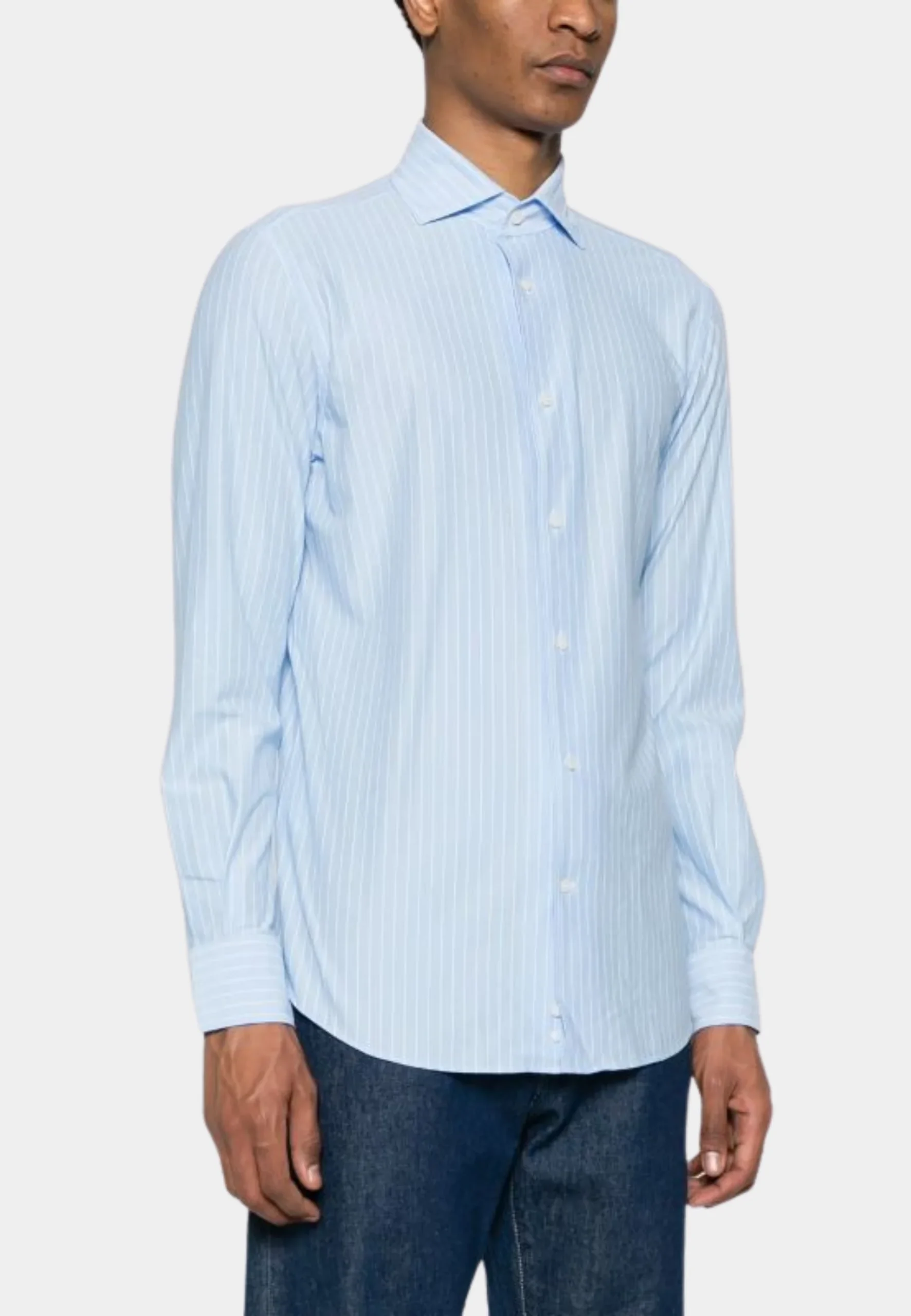 Camisa Sport rayas azul en Algodón – Corte Regular Fit Una pieza fundamental de elegancia atemporal, esta camisa de vestir Boggi Milano proporciona una textura suave, ligera y transpirable, ideal para llevar cómodamente todo el día. El patrón de rayas discretas en tonos neutros o tierra sobre una base blanca aporta un toque de color y dinamismo sin perder la sobriedad. Su corte Regular Fit garantiza una silueta clásica y cómoda, facilitando el movimiento y un ajuste que se ve impecable, ya sea llevándola por dentro del pantalón con una corbata, o por fuera con unos vaqueros.