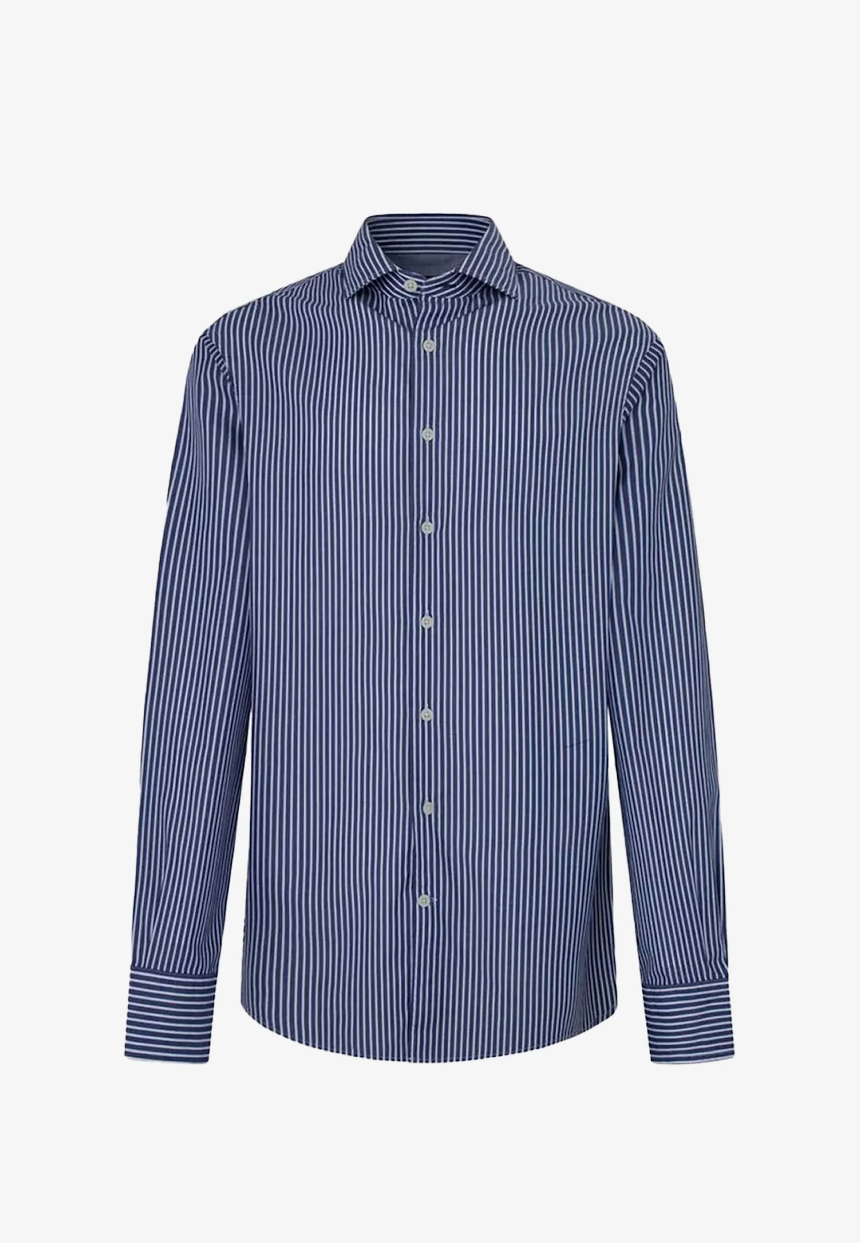 camisa azul de rayas finas, una prenda que combina elegancia y versatilidad. Confeccionada en algodón de alta calidad, ofrece frescura, suavidad y un ajuste cómodo. Su diseño de rayas verticales estiliza la silueta y la convierte en la opción perfecta tanto para looks formales de oficina como para outfits smart-casual.