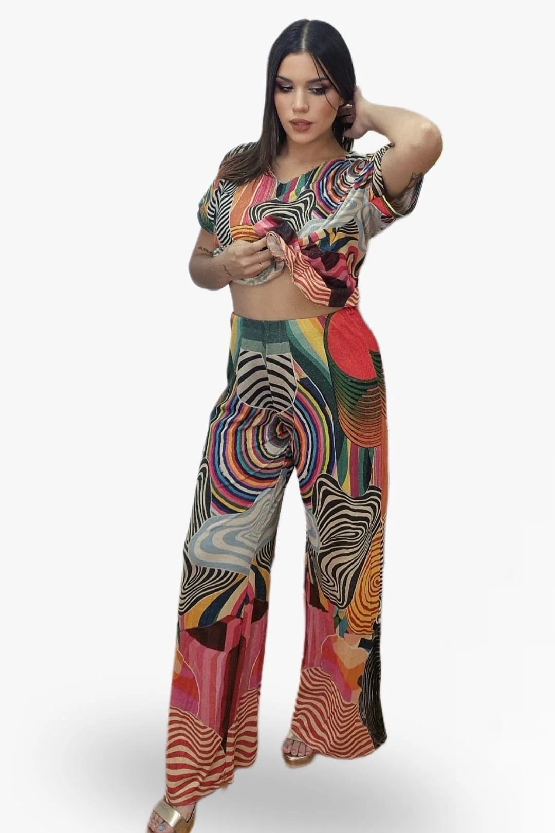La Camiseta Crazy Lines es una prenda versátil que destaca por su estampado geométrico multicolor y su ligero acabado brillante. Con escote en pico y manga corta, es ligera, cómoda y perfecta para un look lleno de energía.