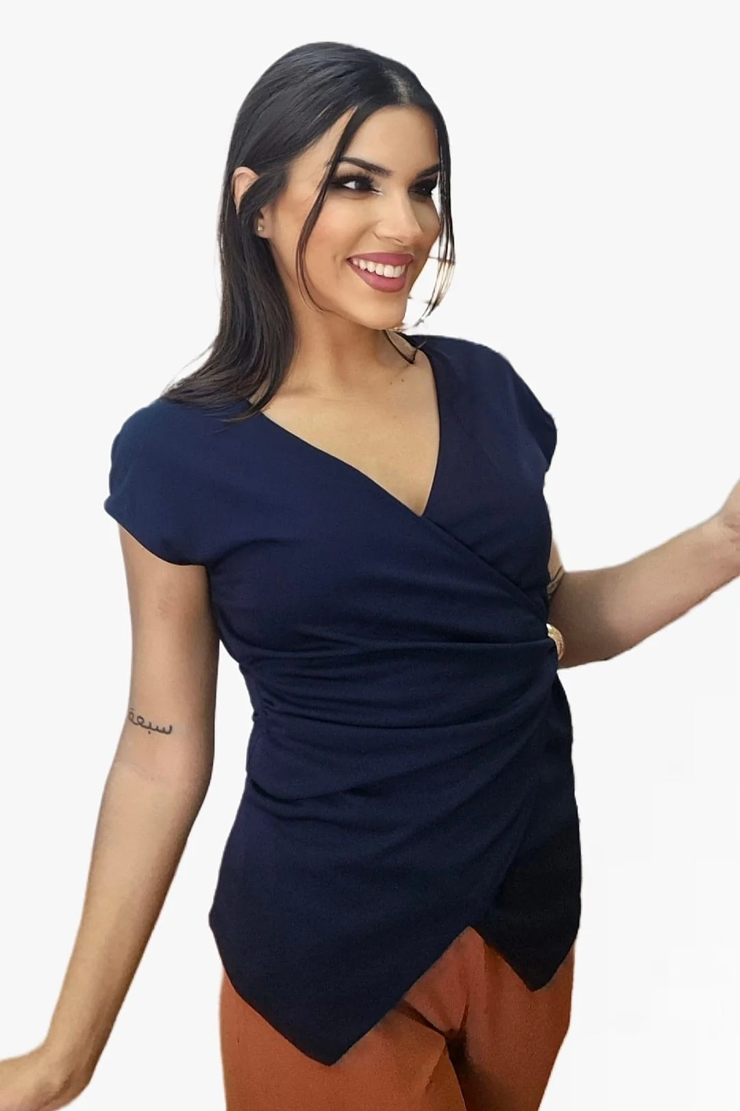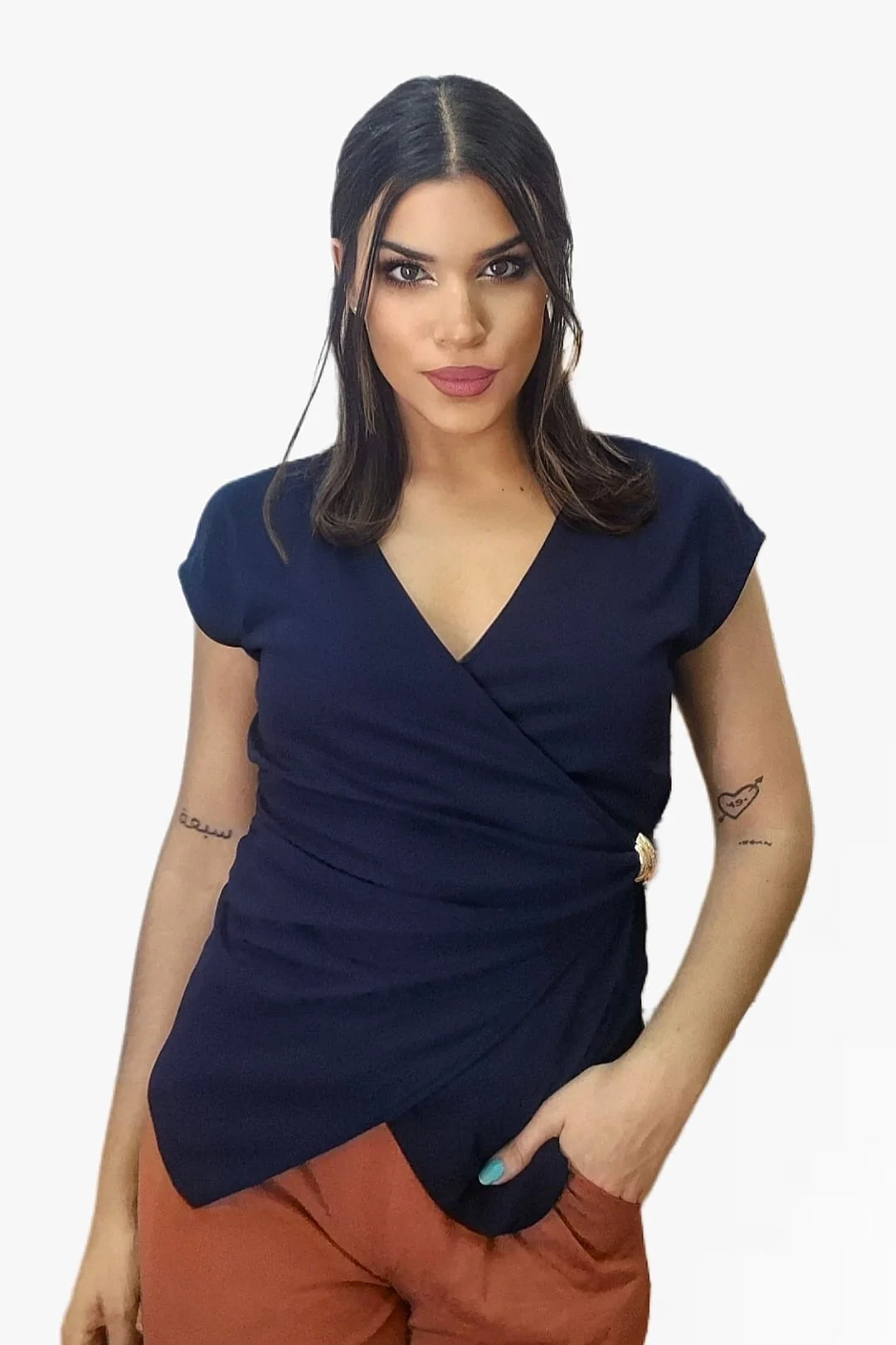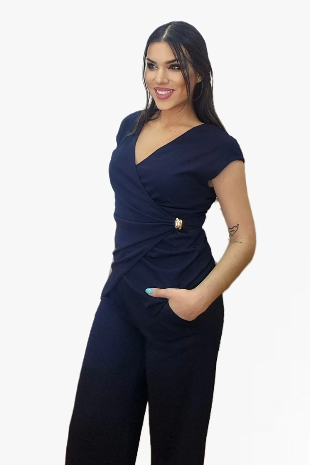 Con un diseño cruzado que realza la figura y un detalle de nudo lateral con aro que aporta un toque sofisticado, esta camiseta es el equilibrio perfecto entre comodidad y estilo. Su corte fluido y favorecedor la convierte en una prenda imprescindible para el día a día o para una ocasión especial.