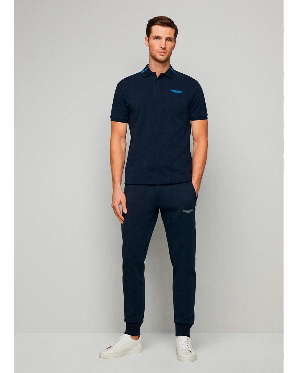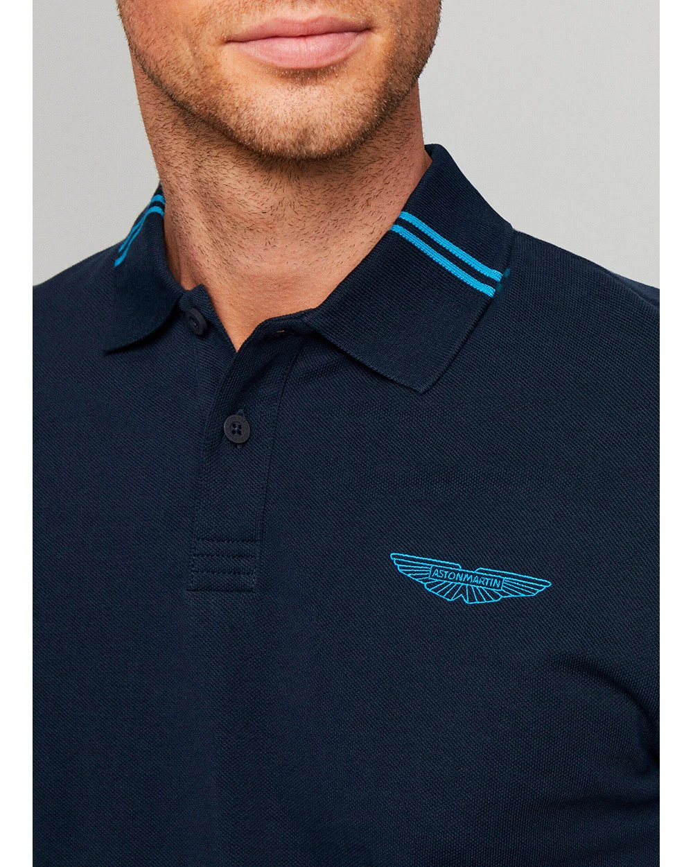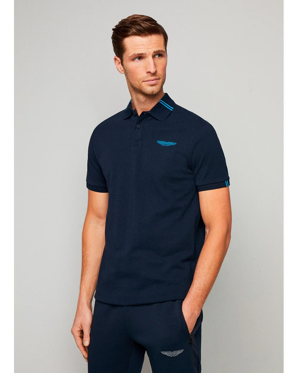 Camiseta polo de manga corta de la marca Hackett London, en un elegante color azul marino. Se distingue por sus detalles de contraste en un color azul más claro y vibrante en el interior del cuello, que le da un toque distintivo. El polo lleva el distintivo logo de la marca bordado en el pecho, lo que le da un toque elegante. Es una prenda versátil, ideal para cualquier ocasión casual, ofreciendo un look fresco y sofisticado.