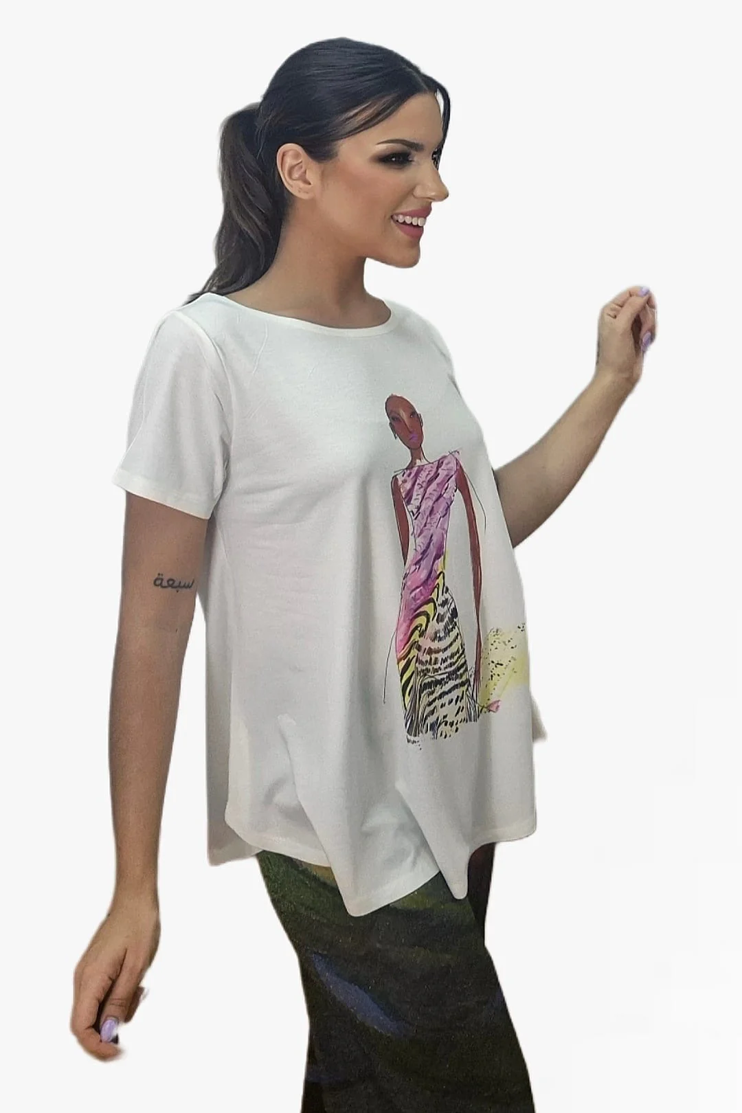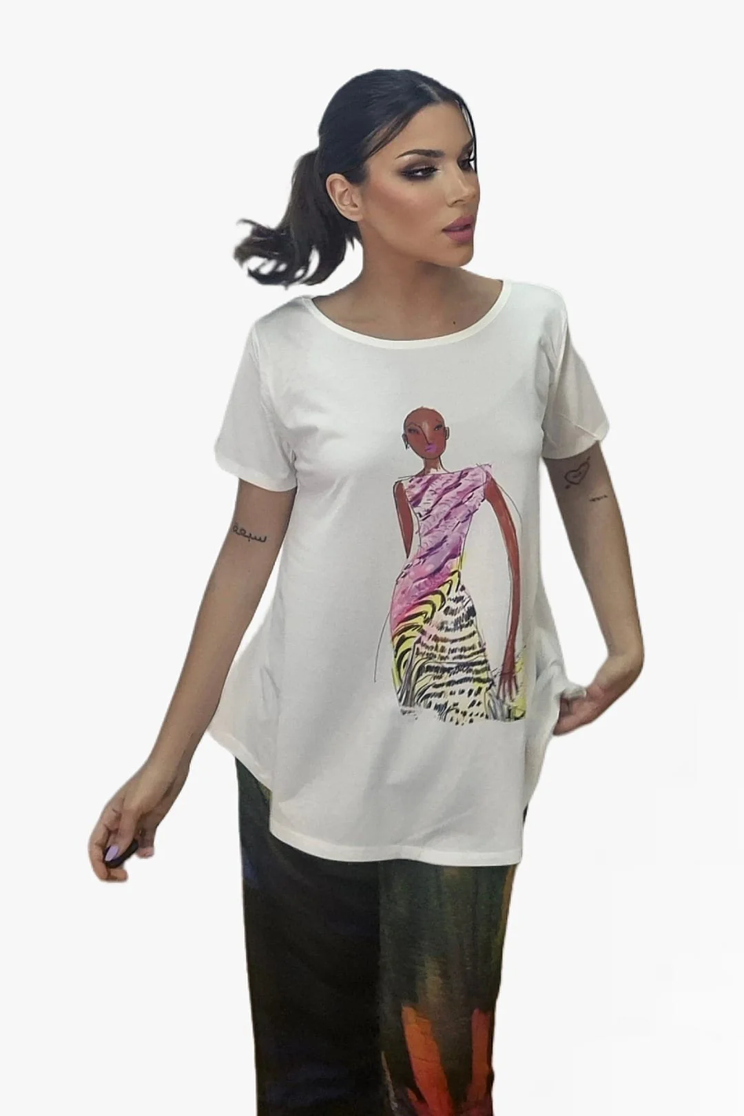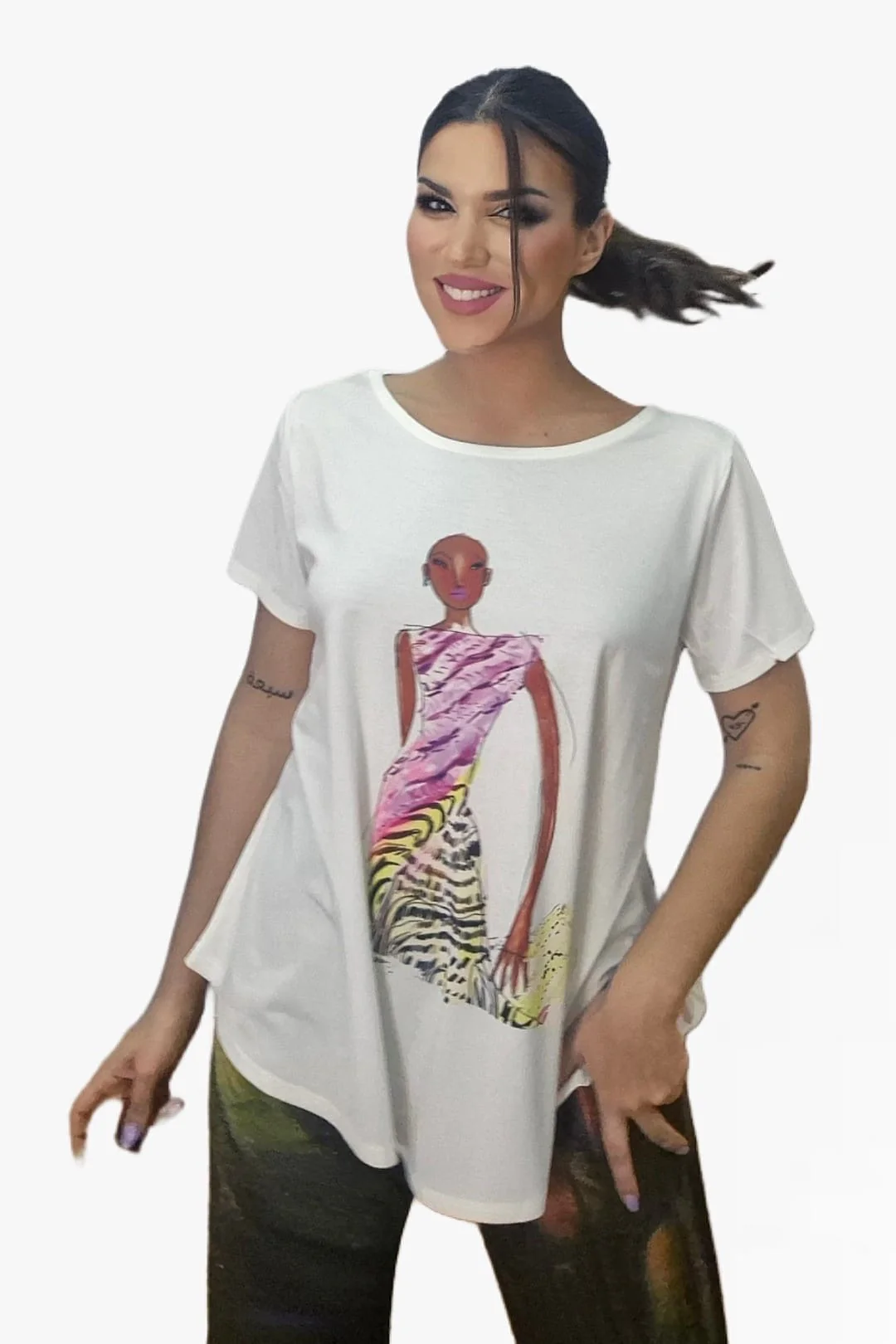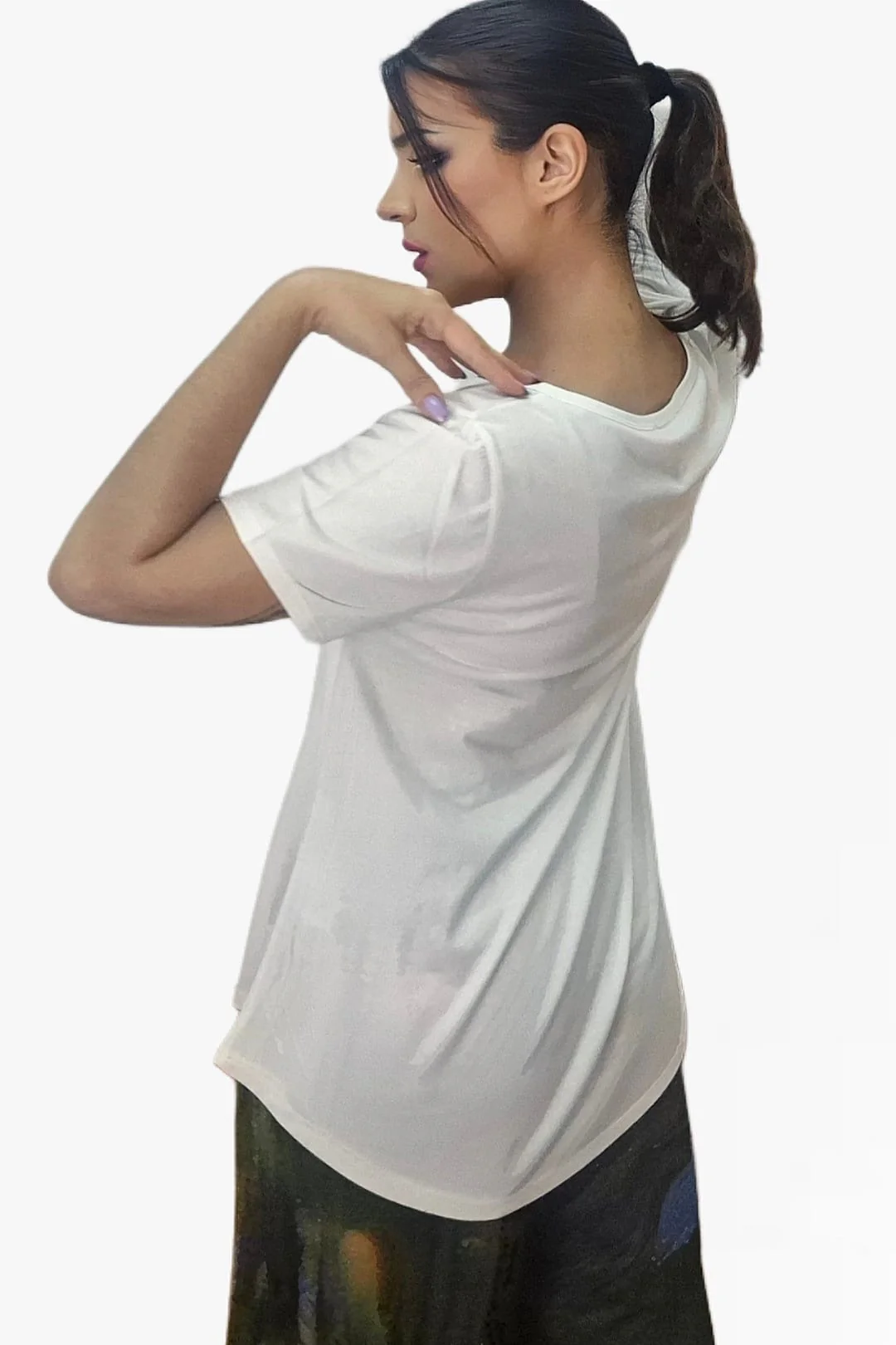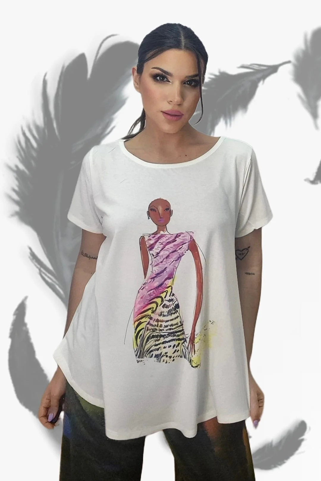 Combínala con pantalones estampados, vaqueros o faldas lisas para resaltar el diseño central. También queda genial con faldas de tul si buscas un look con contraste y originalidad.